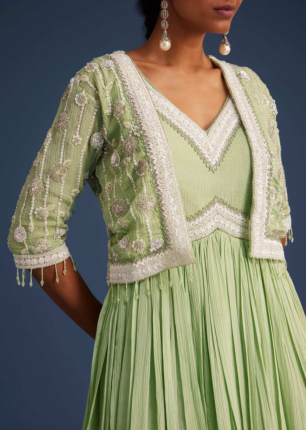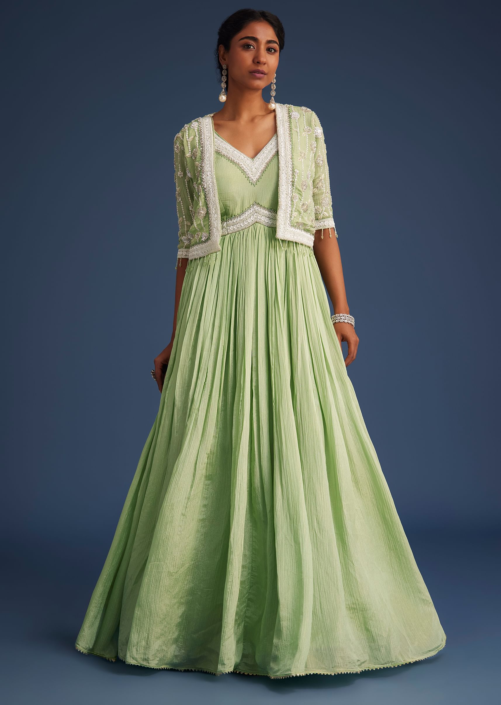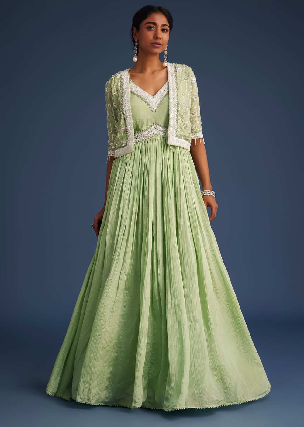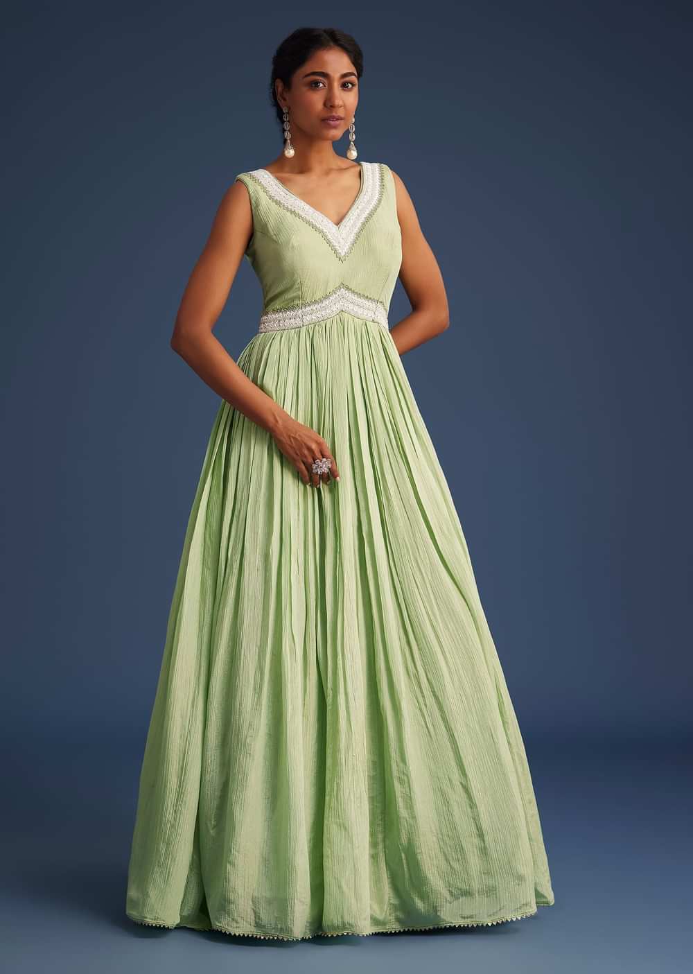 • Drape Yourself In Ethereal Charm With This Mint Green Tissue Gown A Masterpiece Of Delicate Craftsmanship.