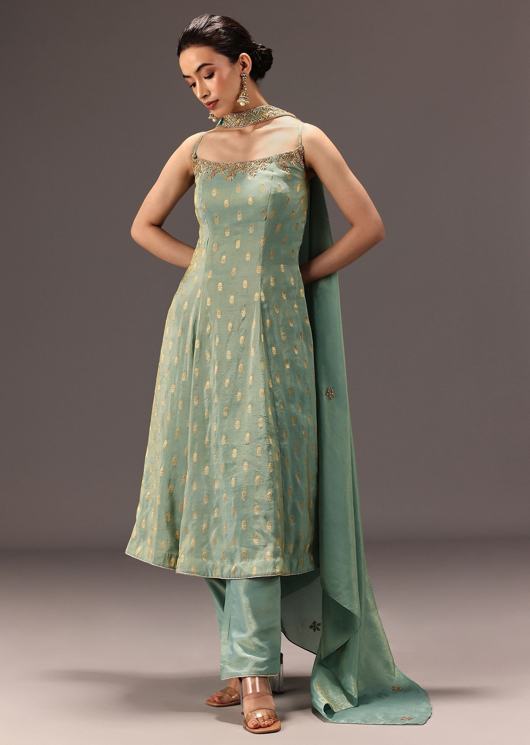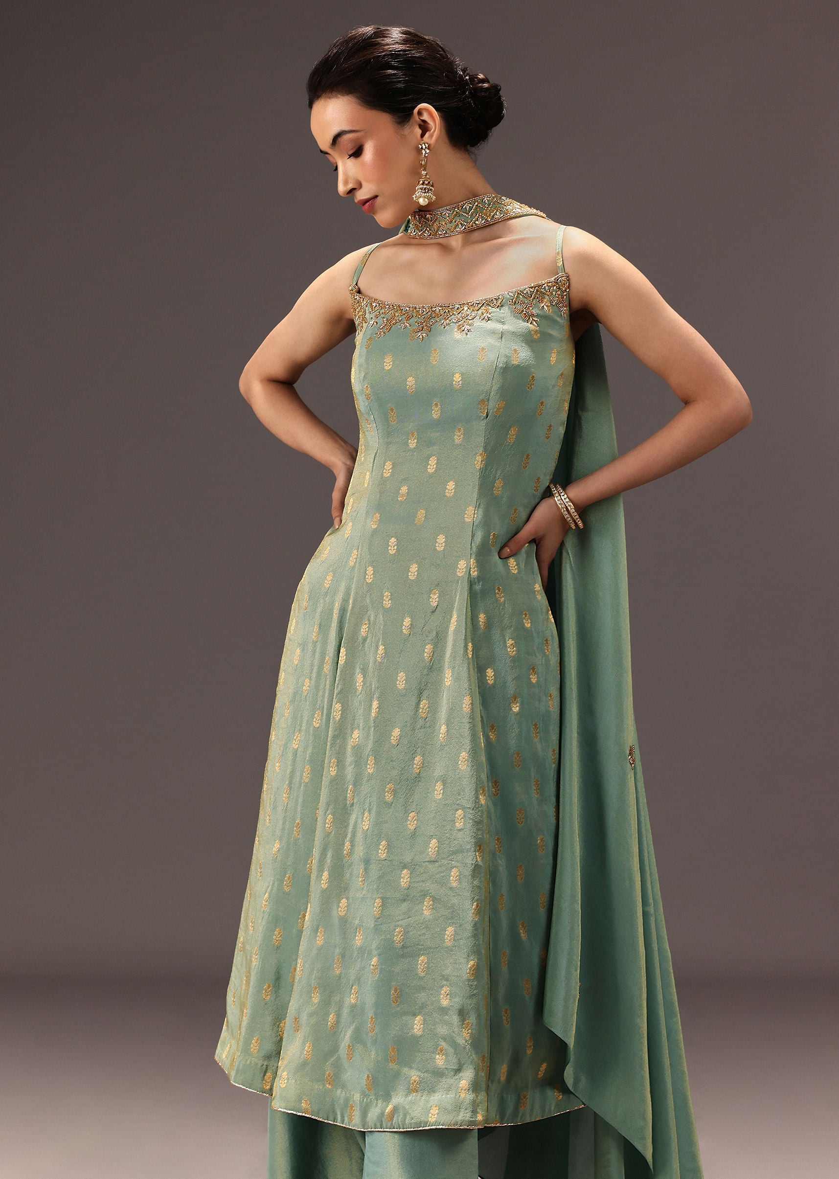 Be the center of attention wherever you go by stepping out in our resplendent mint green kurta set. The deep neck round neckline is enhanced with gold self work showcasing... More Product Details