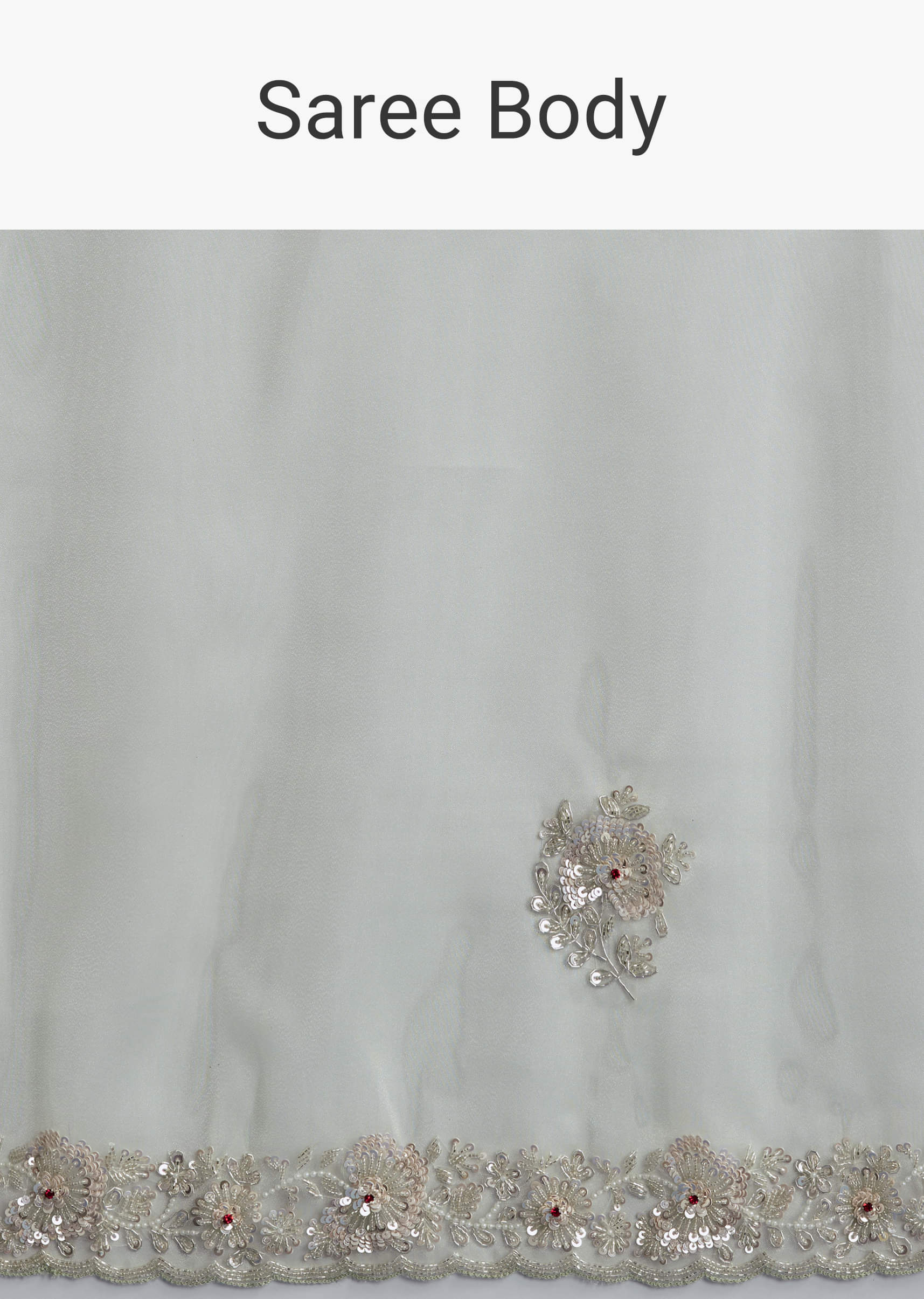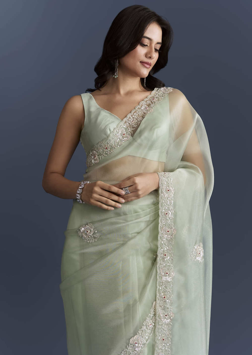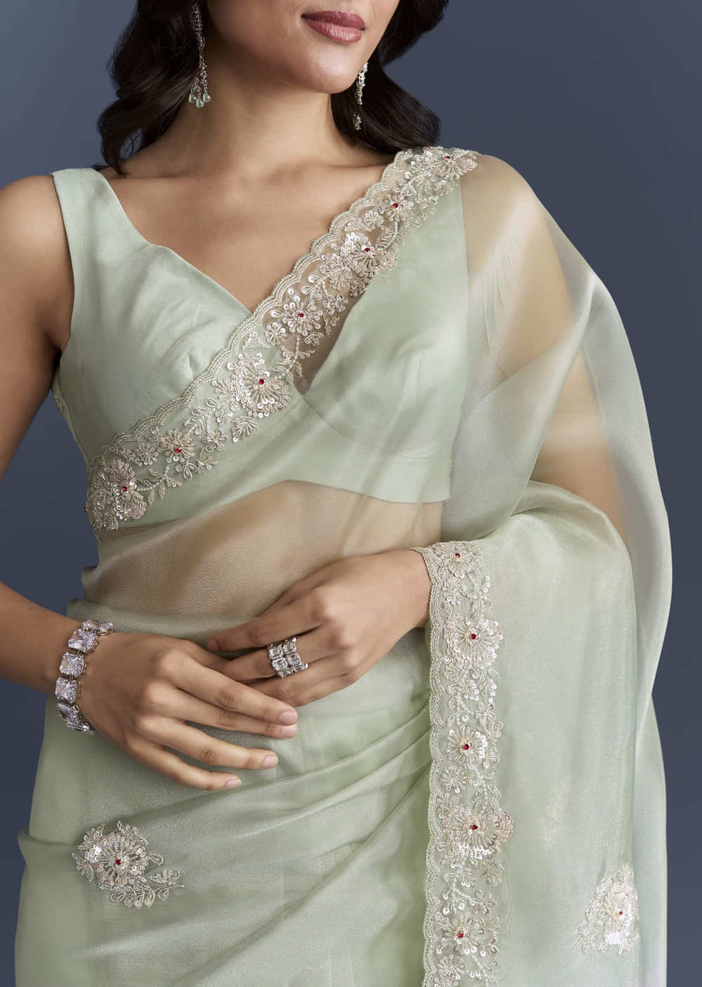 Mint Green Tissue Saree With Heavy Hand Embroidery