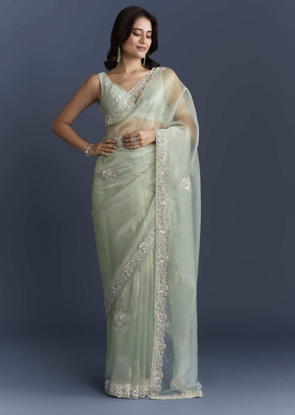 Cool and refreshing, this mint green tissue saree holds a soft sheen that brightens the face. Floral butti and a heavily embroidered border in cutdana, sequins and beads add festive... More Product Details
