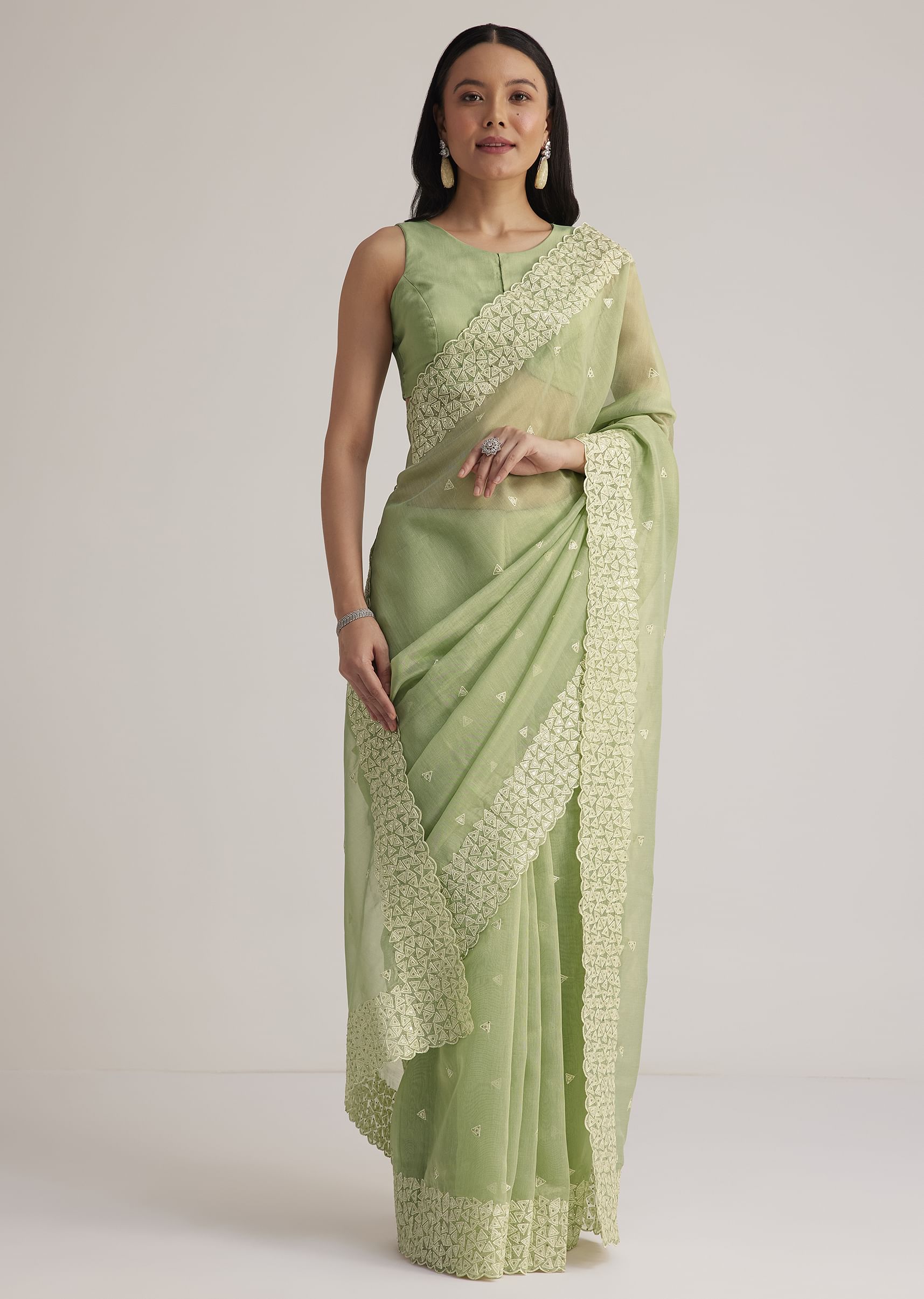 Mint Green Tissue Silk Sequins Saree With Scallop Border