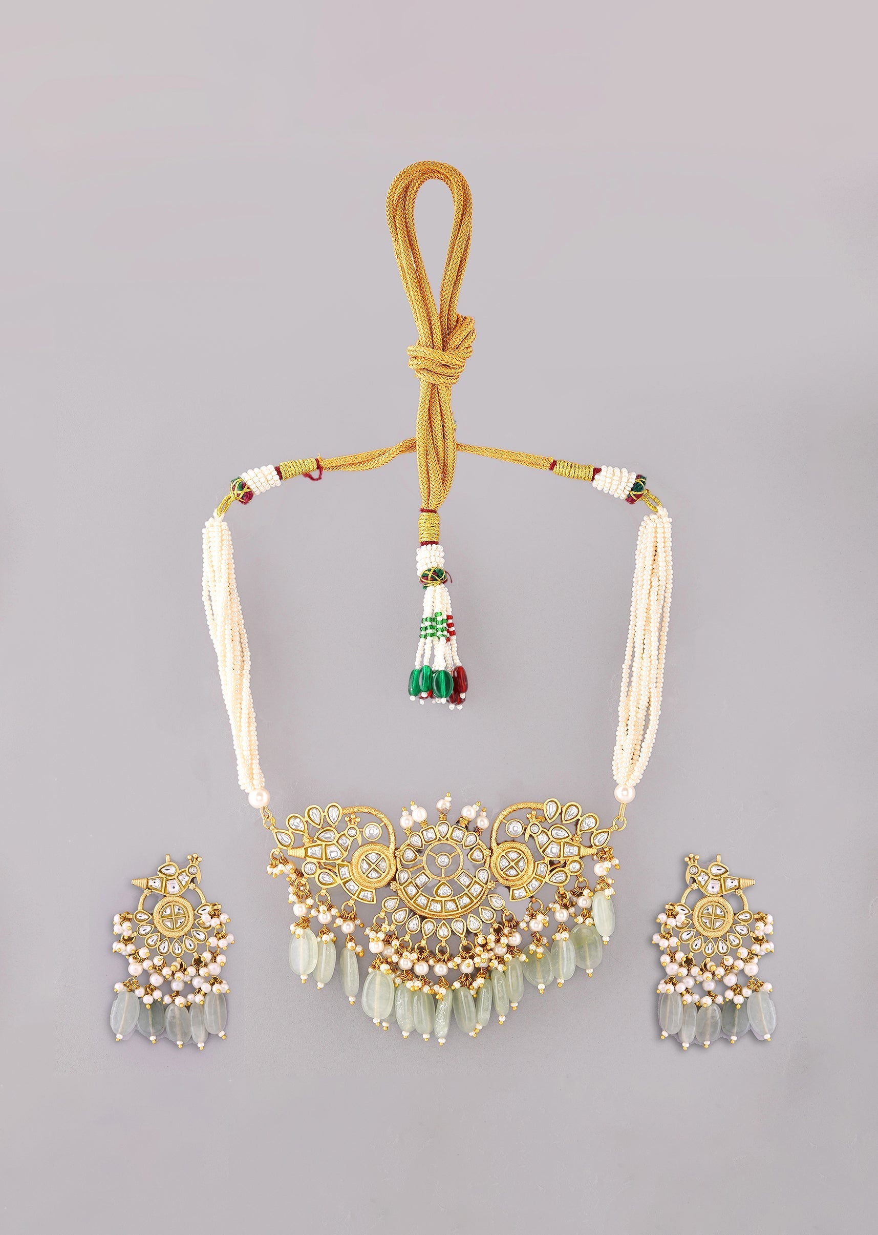 This mint green and white necklace set features intricate pachi kundan work for a delicate and festive appeal. Perfect for haldi and mehendi ceremonies, it is ideal for bridesmaids or... More Product Details