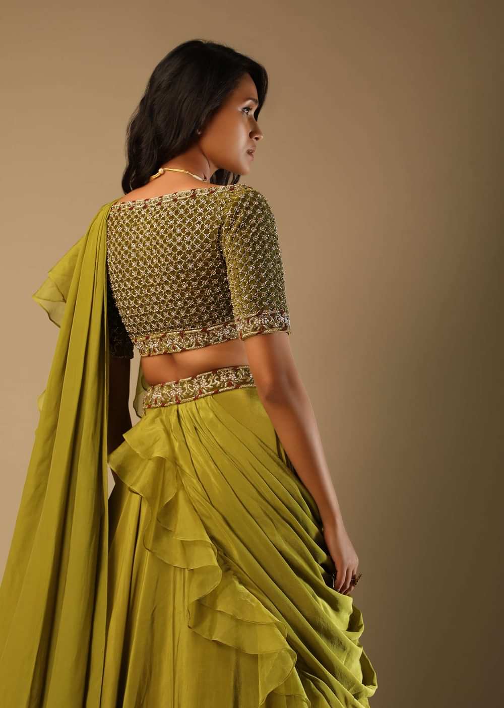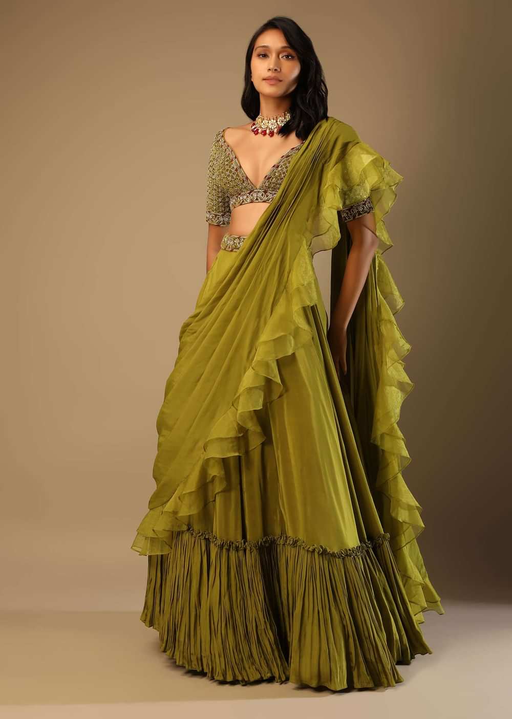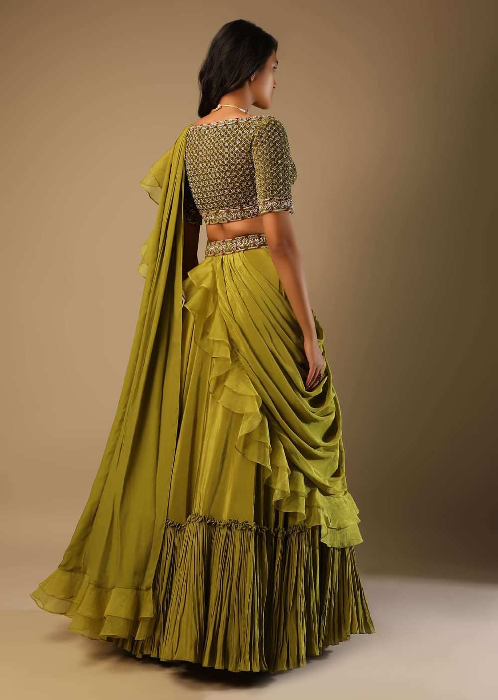 Moss green lehenga saree in crepe with frill tier and an attached organza frill drape. Paired with a matching velvet blouse with cut dana and zardosi embroidered mesh jaal. It is crafted with plunging neckline, half sleeves and side zip closure. This piece comes with cancan and padding. Awarded As The Most Trusted Brand We'Re Delivering Styles You Love Just As Promised.