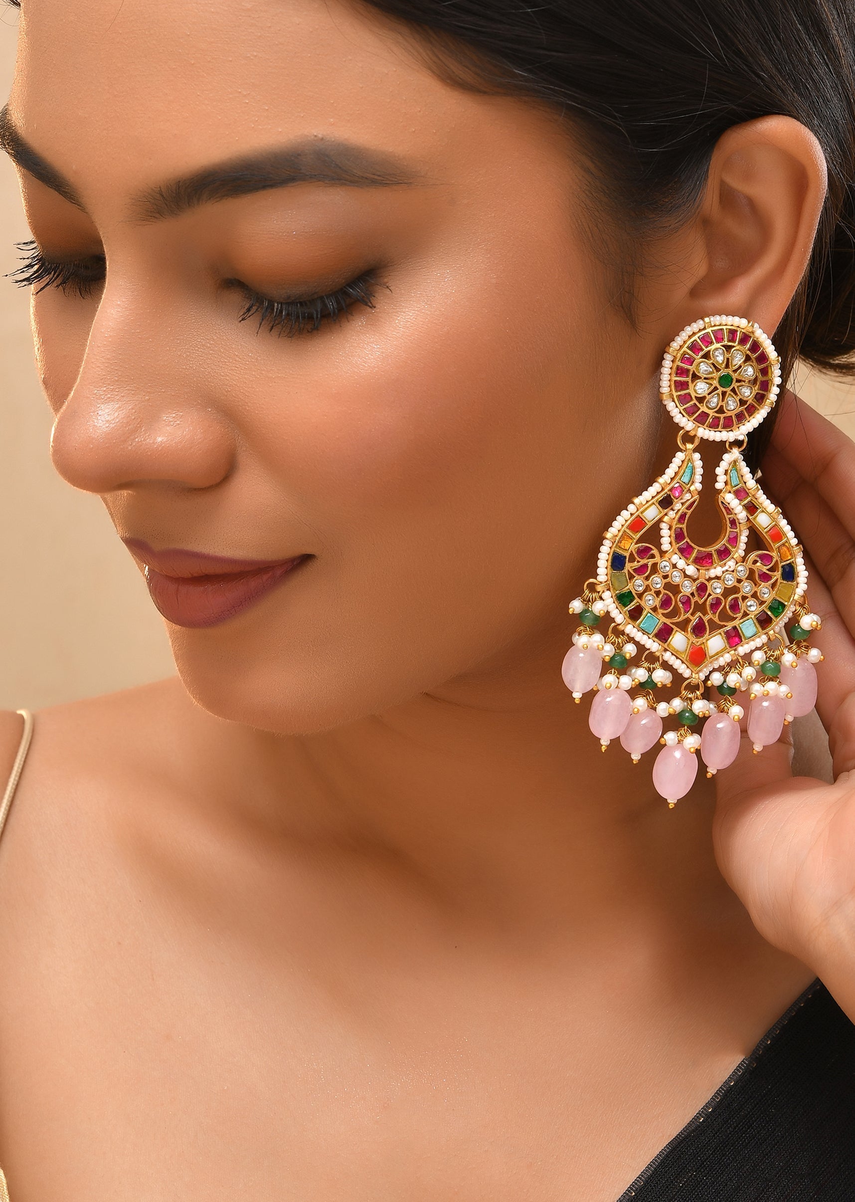 These multi baby pink earrings feature delicate pachi kundan work for a festive and elegant look. Perfect for weddings and special celebrations, they add a soft, charming touch to traditional... More Product Details