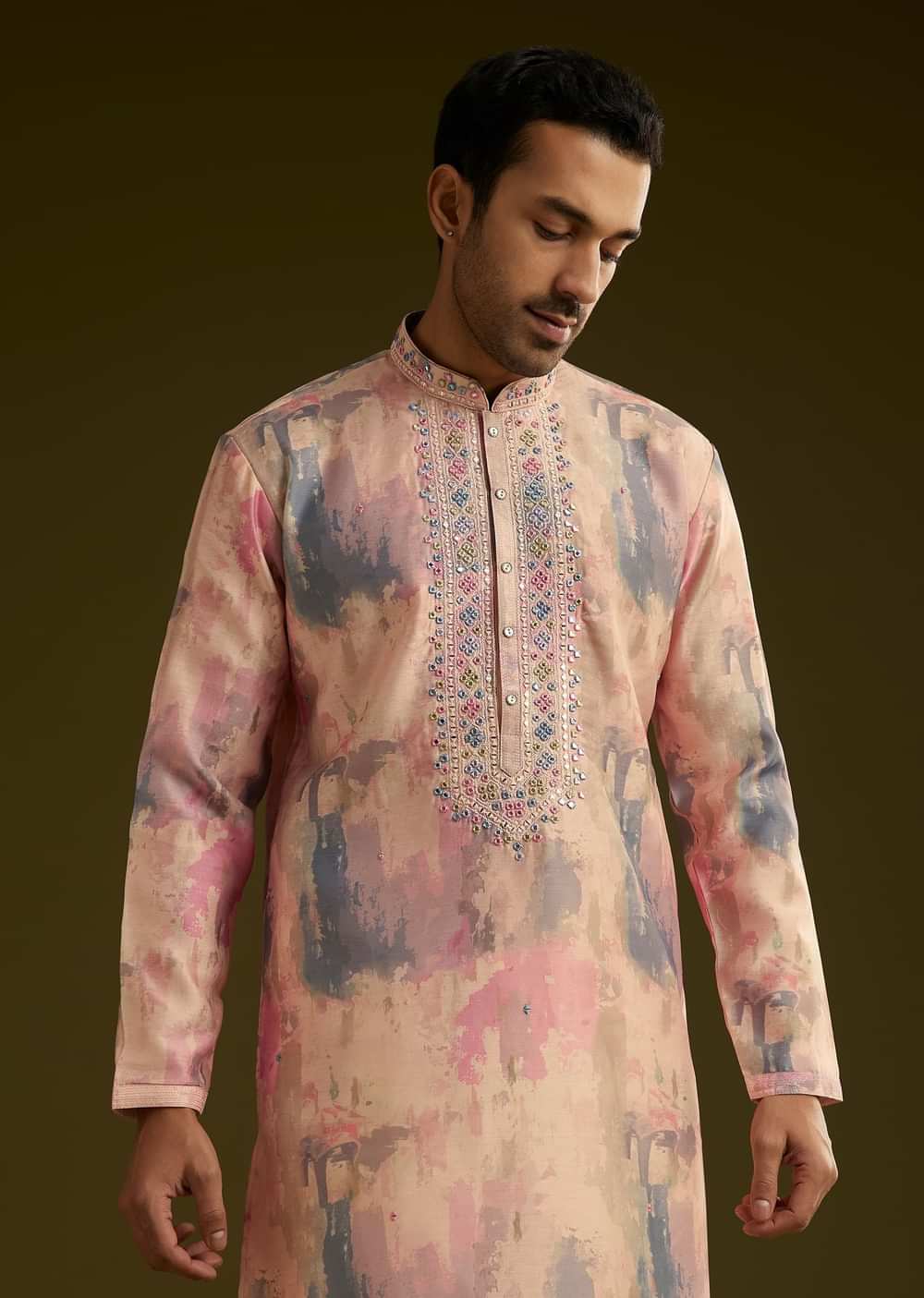This multicolored abstract printed silk kurta set is a bold and vibrant statement piece. Featuring a mandarin collar front button design and full sleeves it offers a contemporary yet traditional... More Product Details