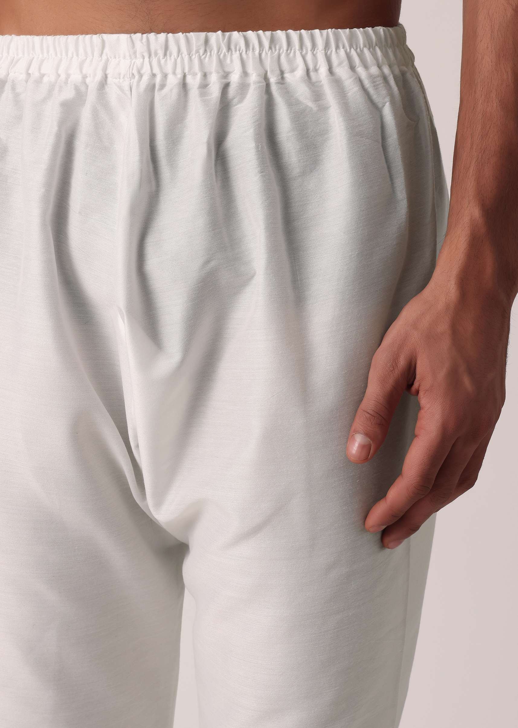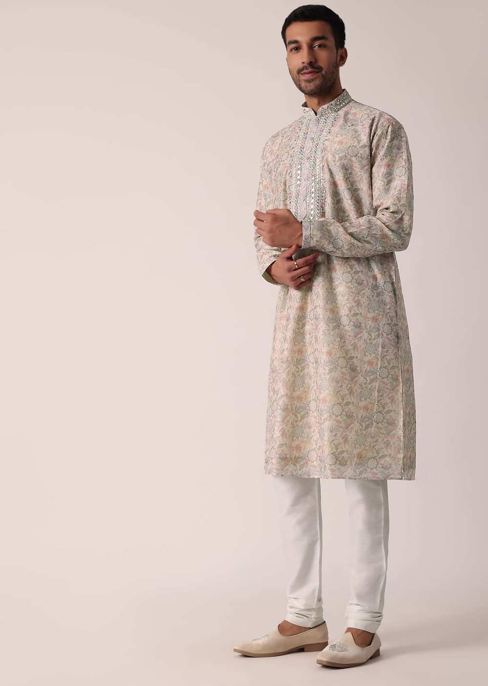 Pair this vibrant kurta with contrasting churidar bottoms and traditional mojris for a captivating and festive appearance.