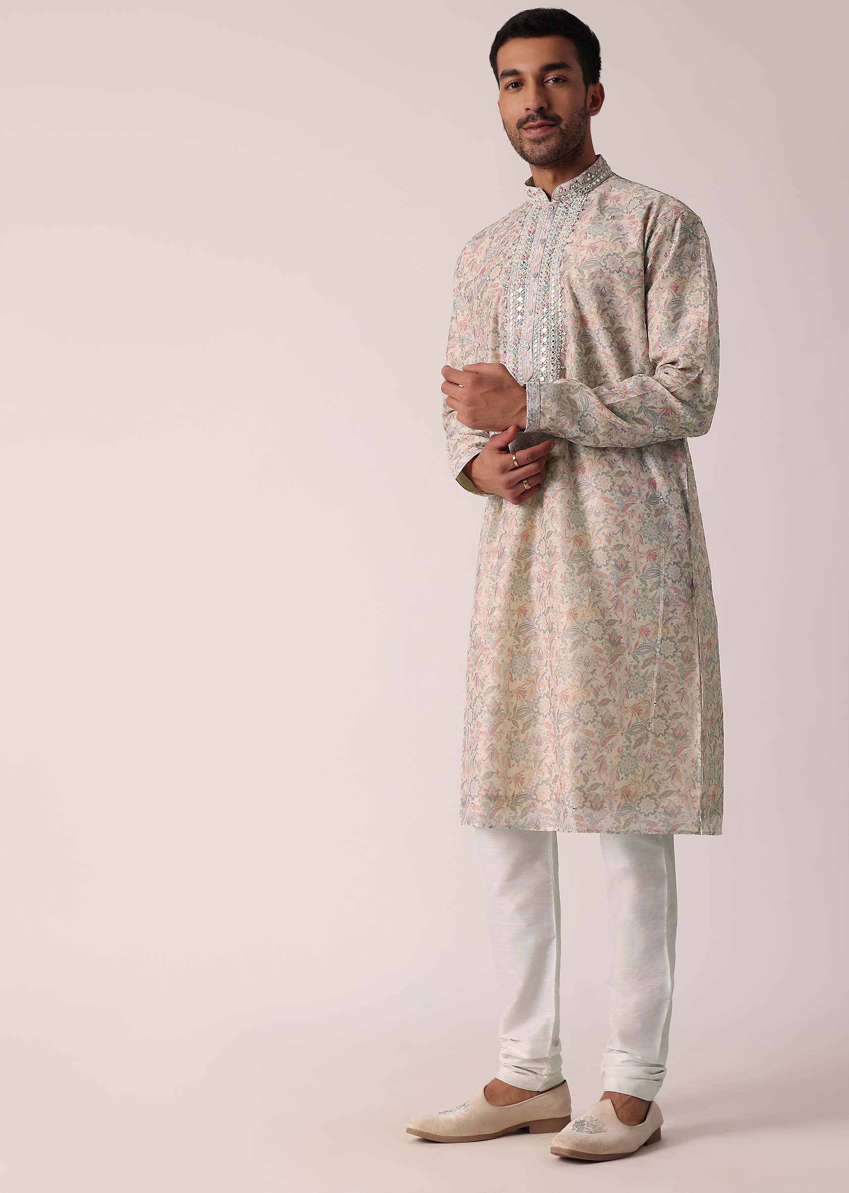 Elevate your festive wardrobe with our Cotton Silk Kurta. It is adorned in a lively floral print and intricate thread and mirror work embroidery. This ensemble exudes elegance and charm,... More Product Details