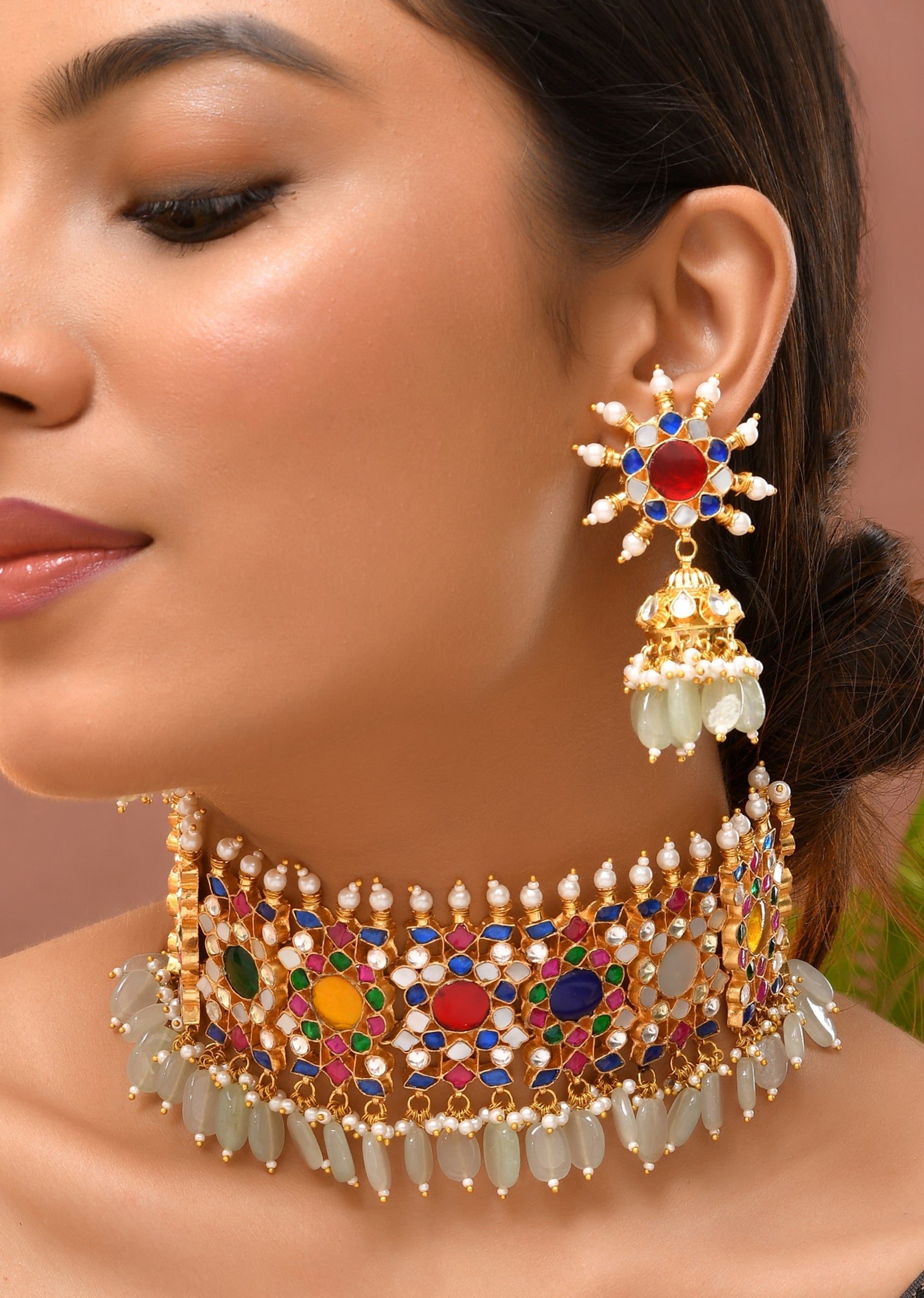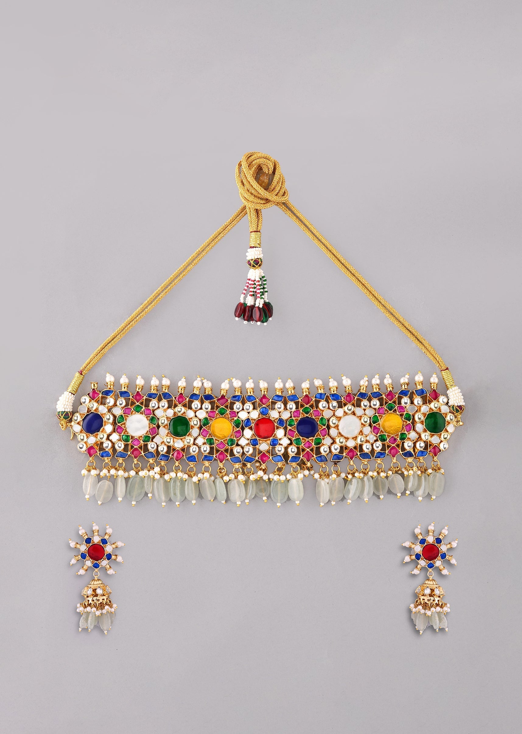 Multi Colored Mint Green Necklace Set With Pachi Kundan