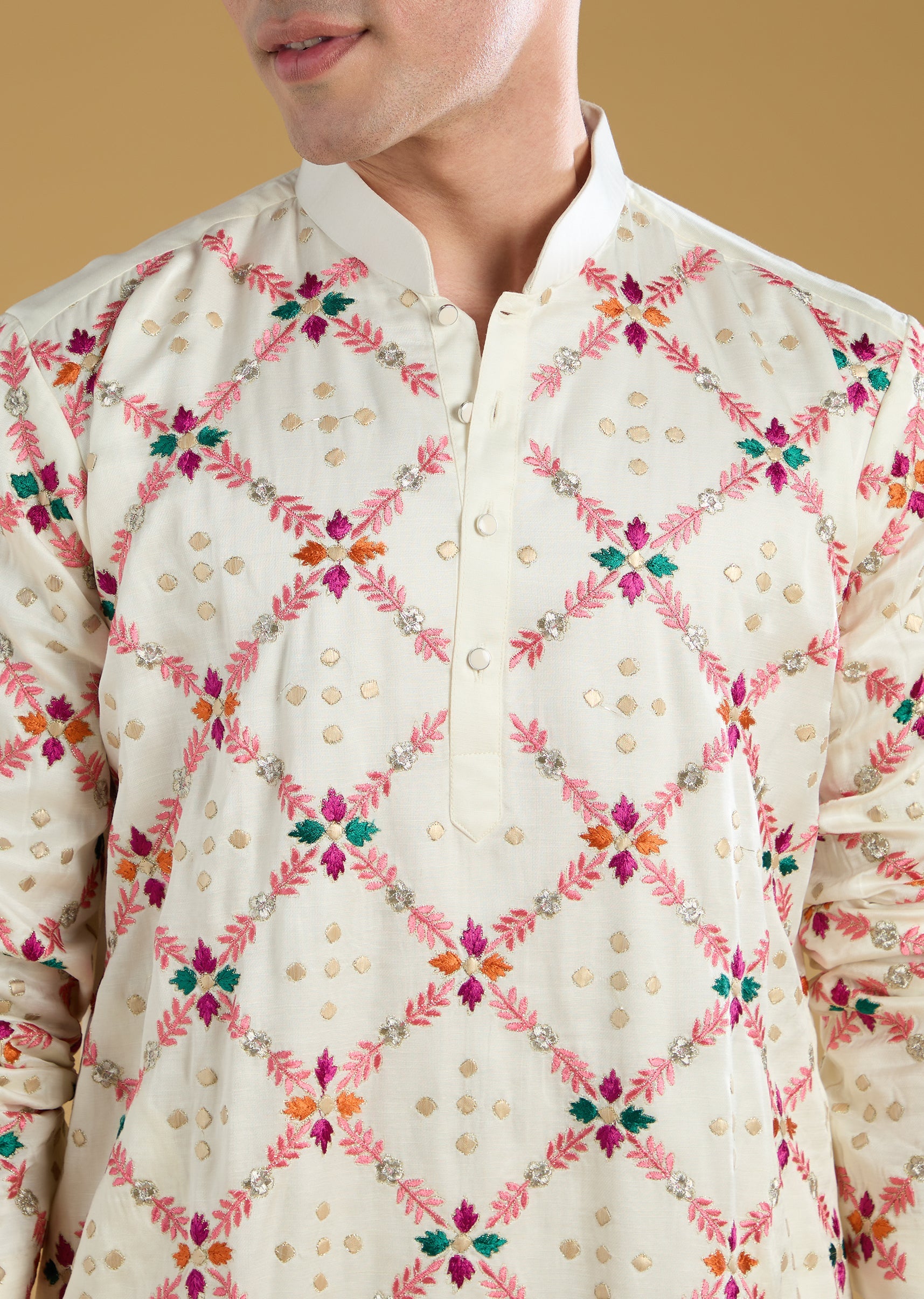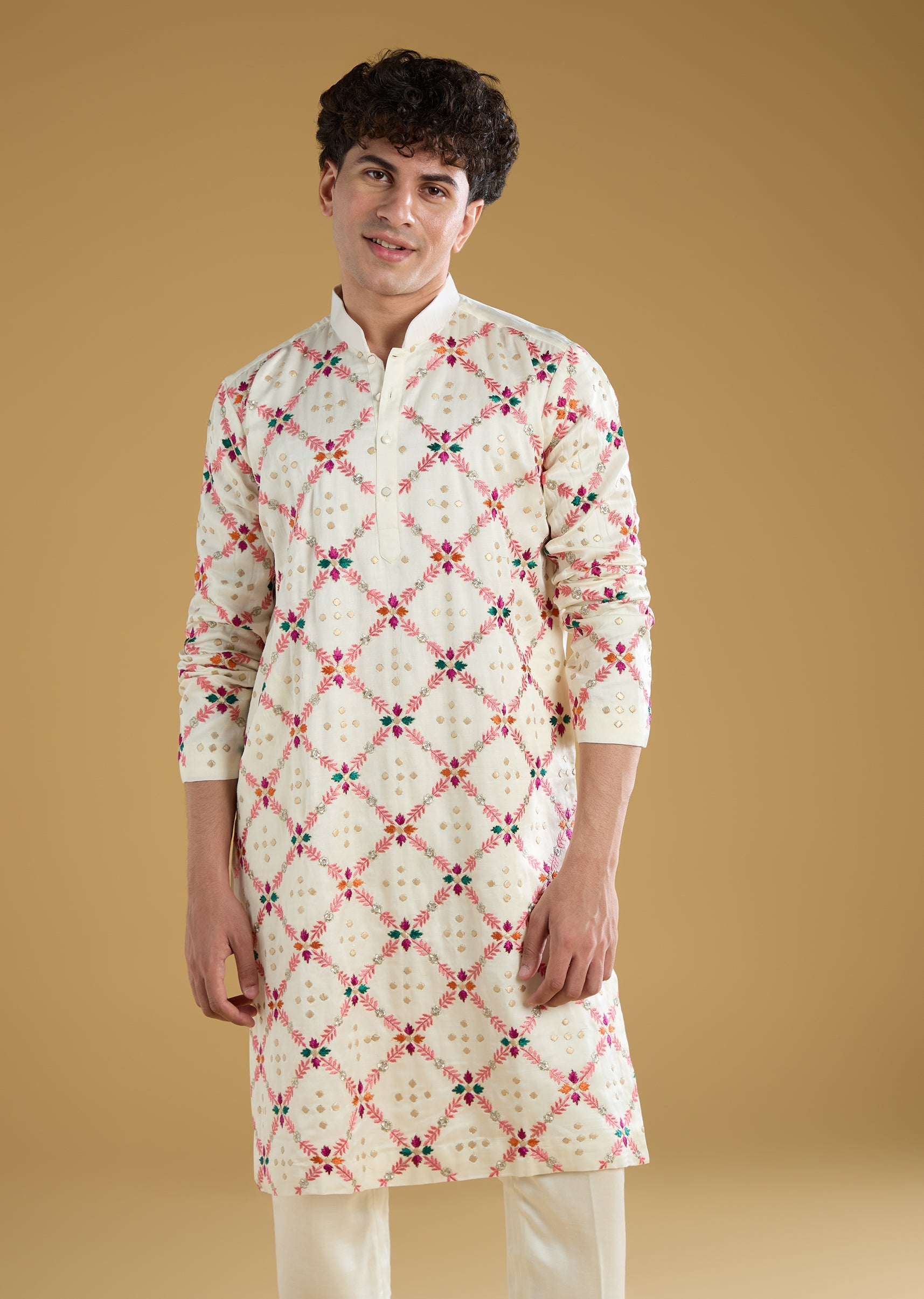 Multi Colored Silk Kurta Set With Thread Detail Work