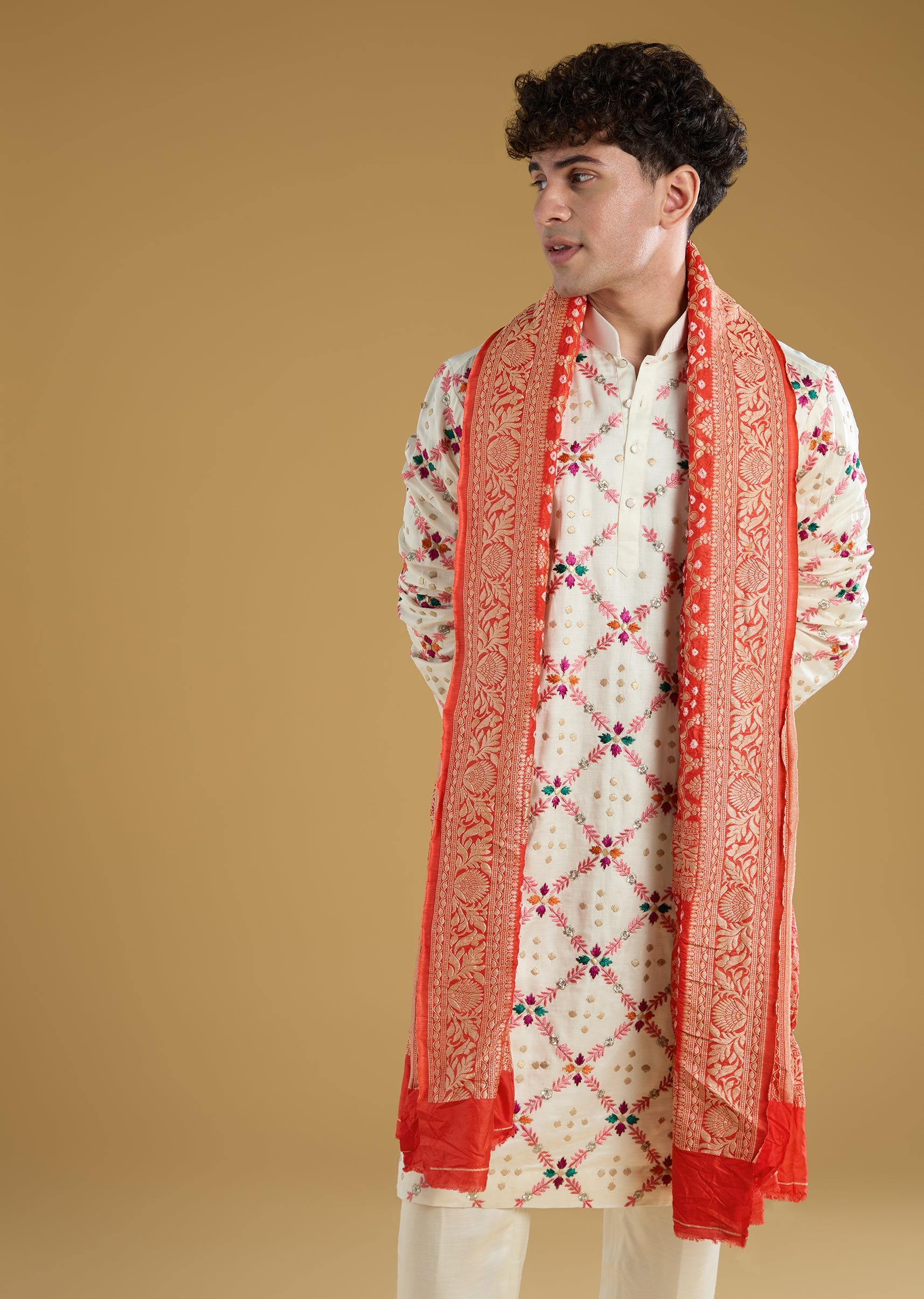 Vibrant and festive, this multi colored kurta set is perfect for wedding mehendi celebrations for a groomsman, groom’s brother, or groom’s father. Crafted in luxurious silk, it features full sleeves and a classic mandarin collar for a refined traditional silhouette. The intricate thread detailing adds elegance, while the coordinated dupatta completes the ensemble with a polished festive finish. This kurta set ensures a lively, stylish, and celebration ready look for all family members. Awarded as the Most Trusted Brand, we're delivering styles you love, just as promised.
