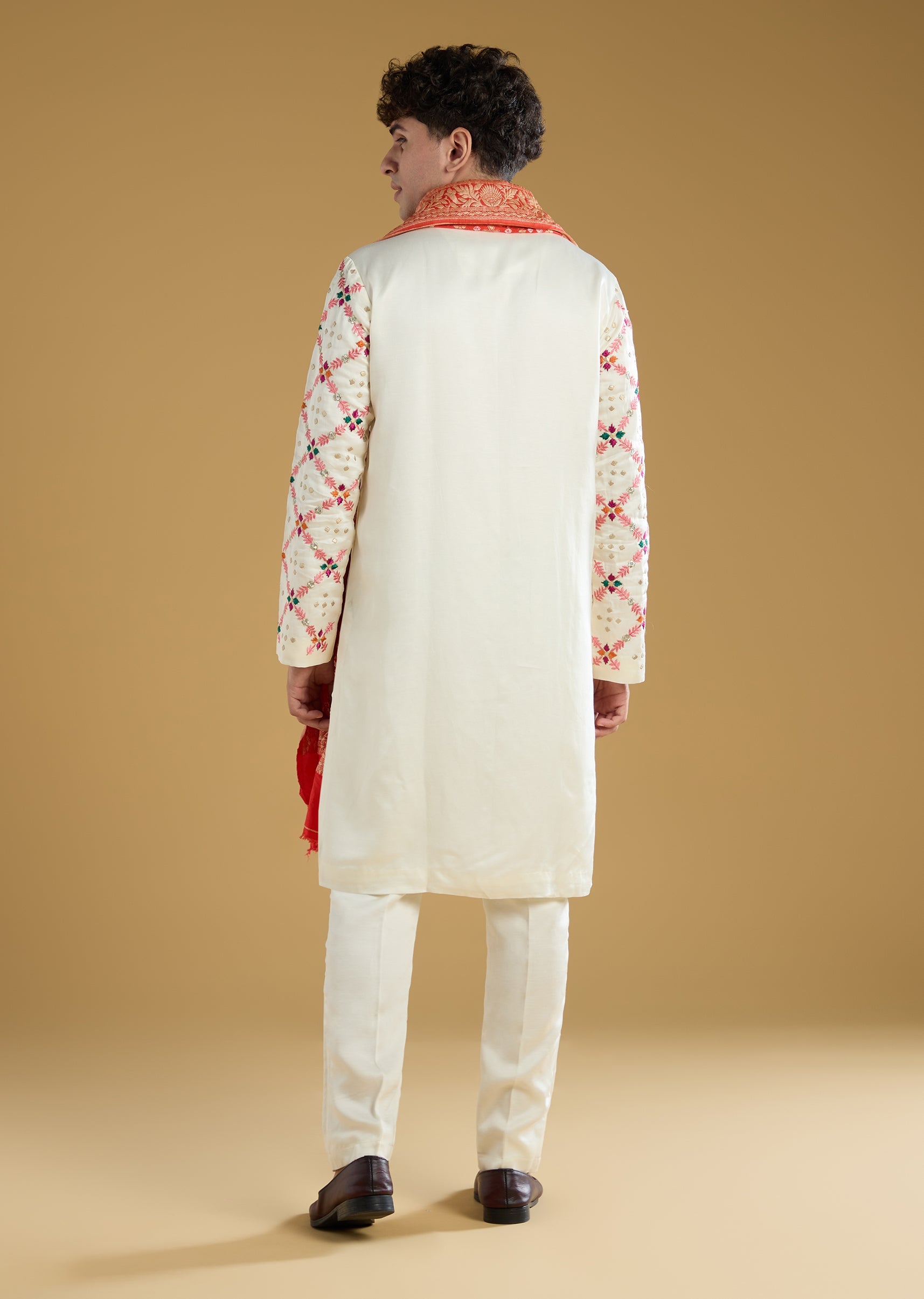 Vibrant and festive, this multi colored kurta set is perfect for wedding mehendi celebrations for a groomsman, groom’s brother, or groom’s father. Crafted in luxurious silk, it features full sleeves... More Product Details