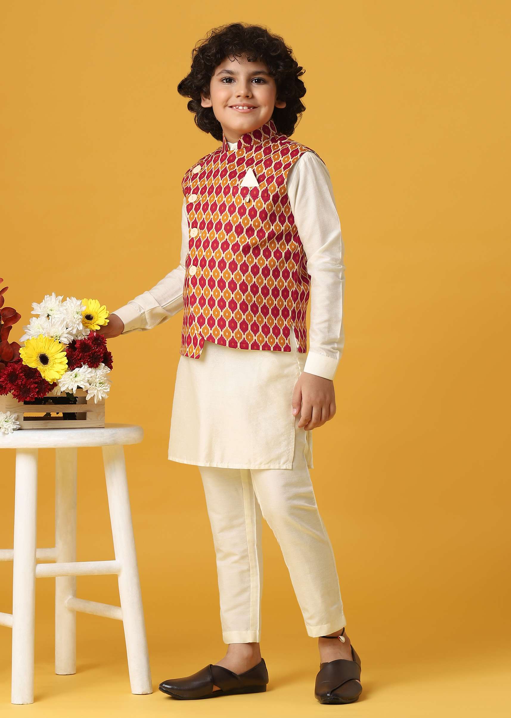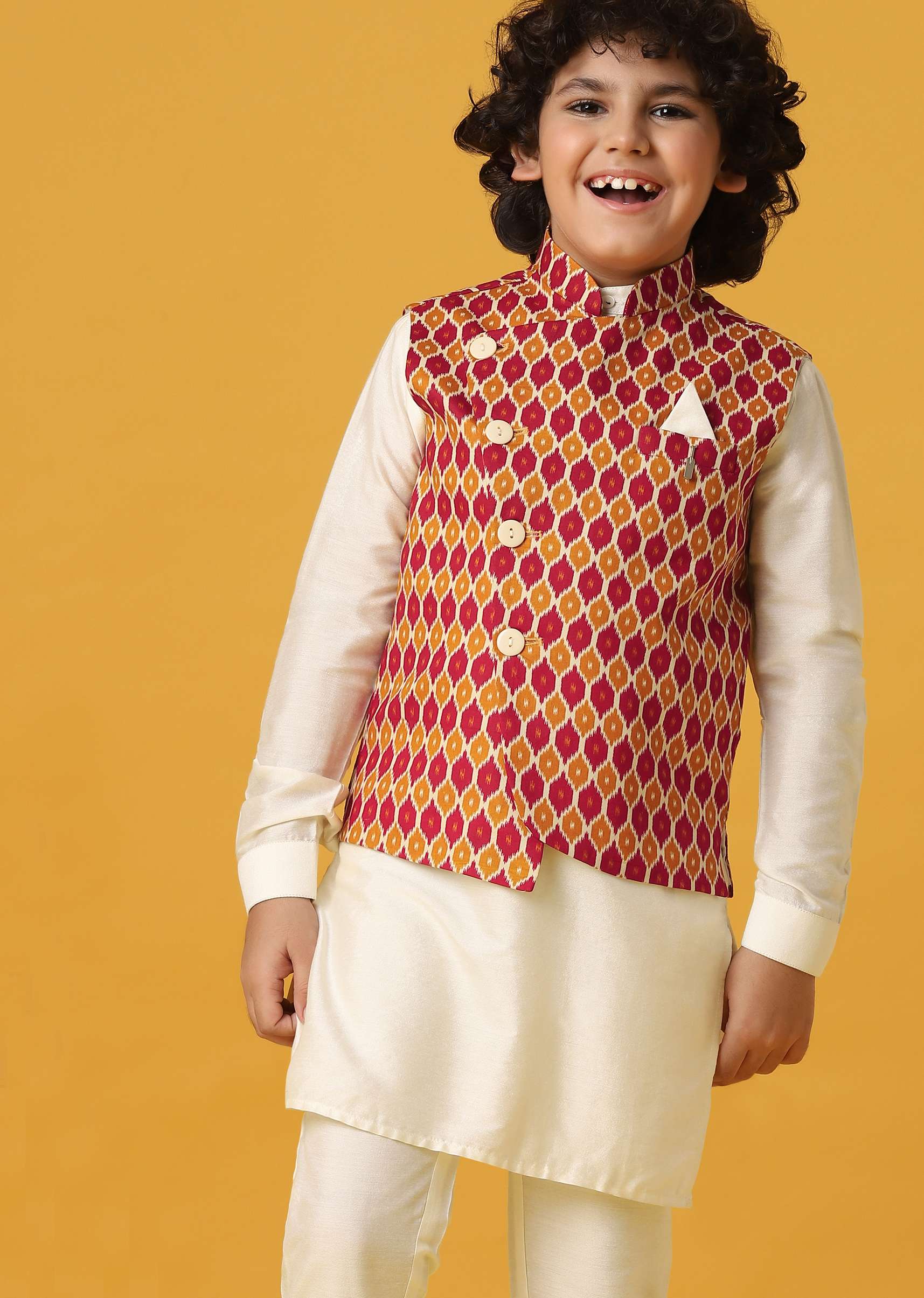 Infuse joy into celebrations with our Multi-Colored Silk Printed Jacket Kurta Set for Boys DIgnesh. The lively combination of hues creates a playful yet sophisticated look. This set comprises a... More Product Details