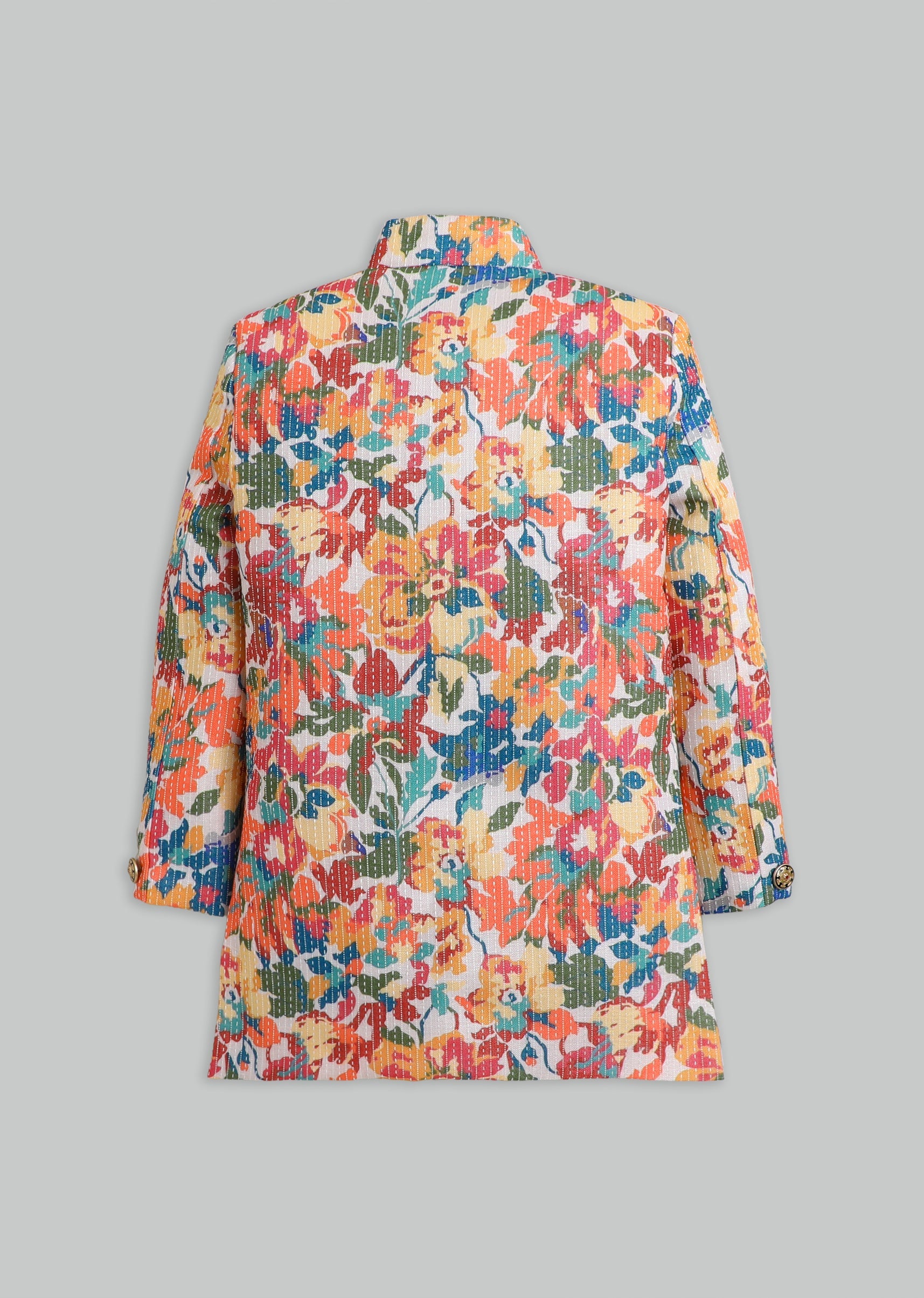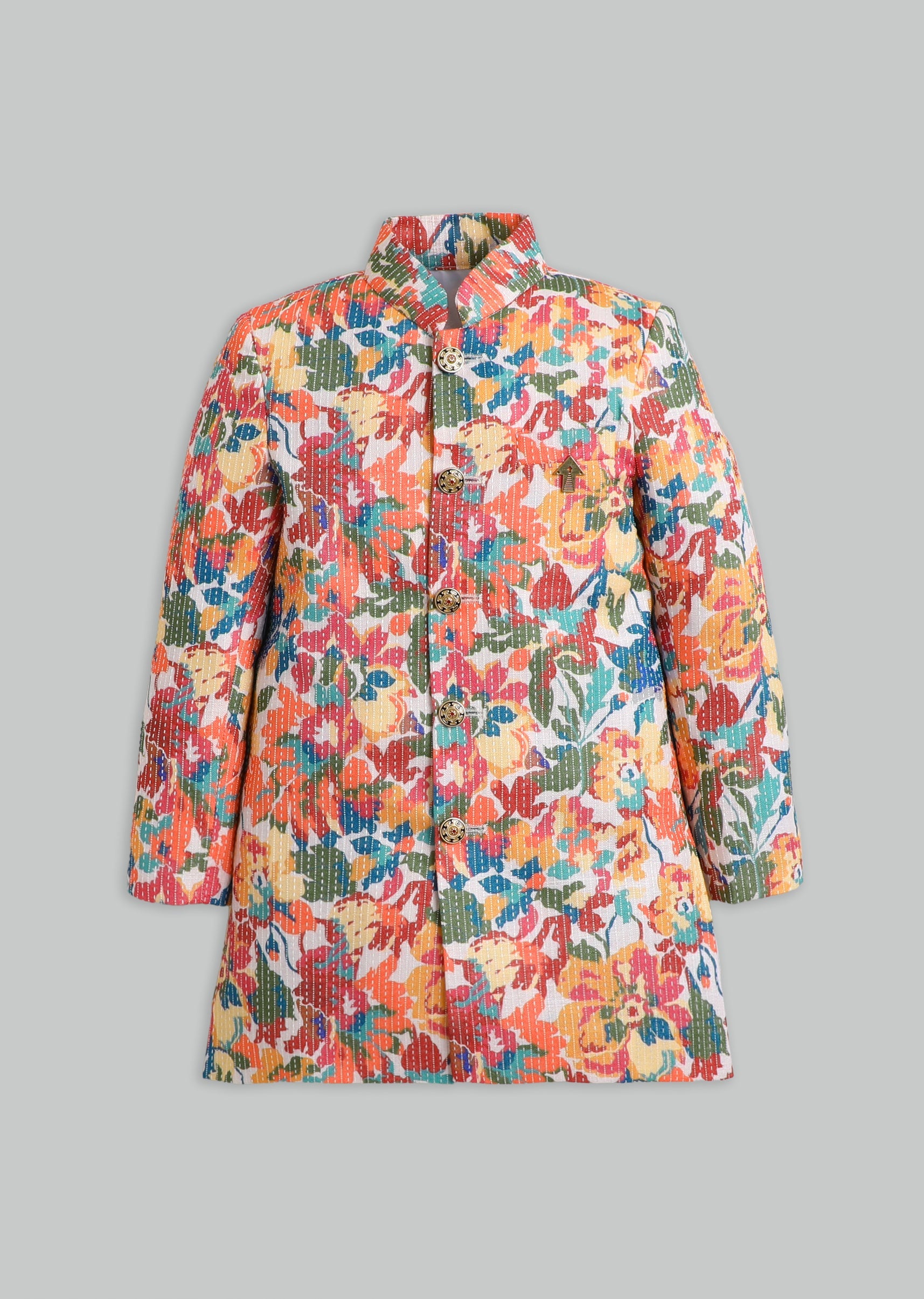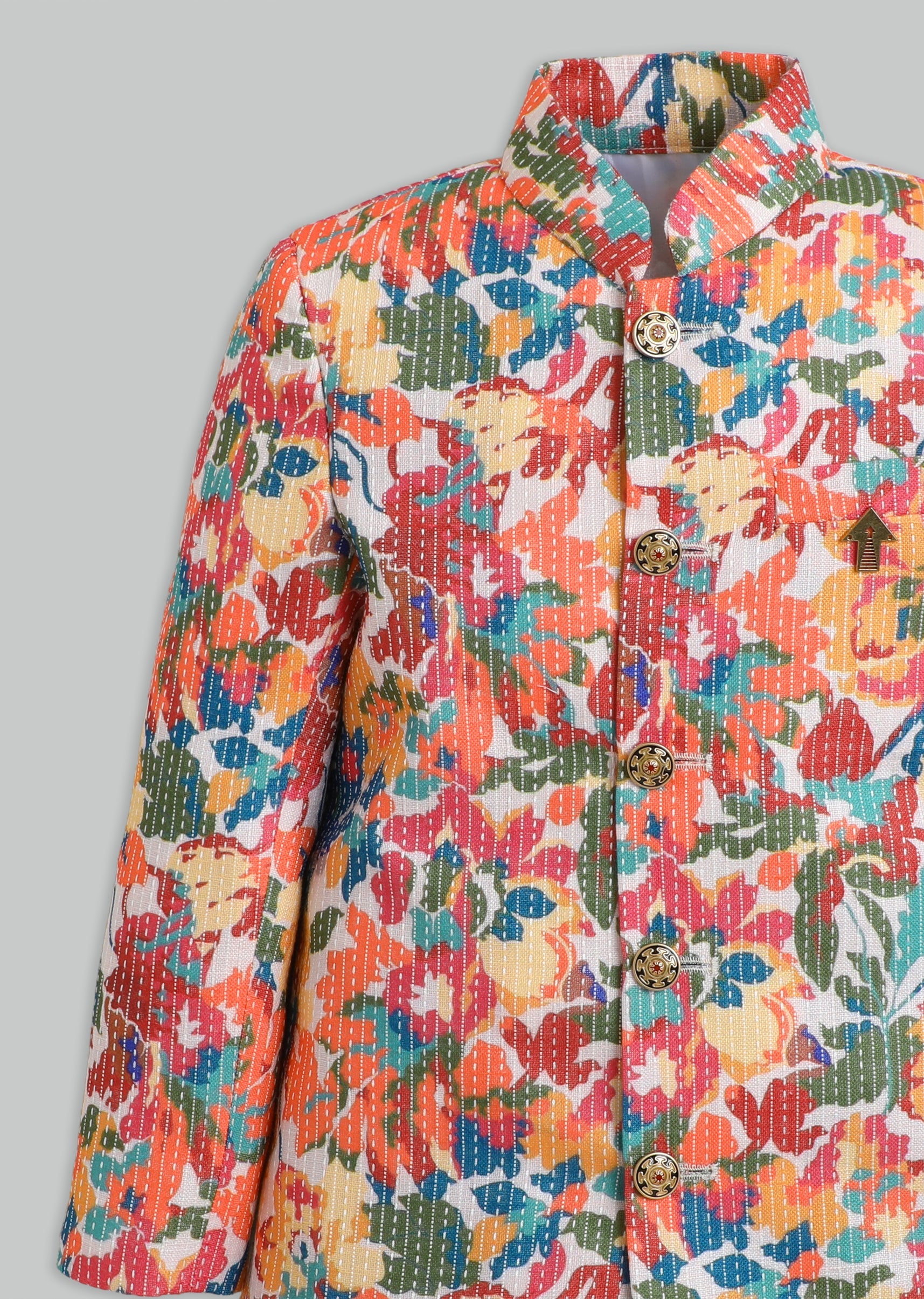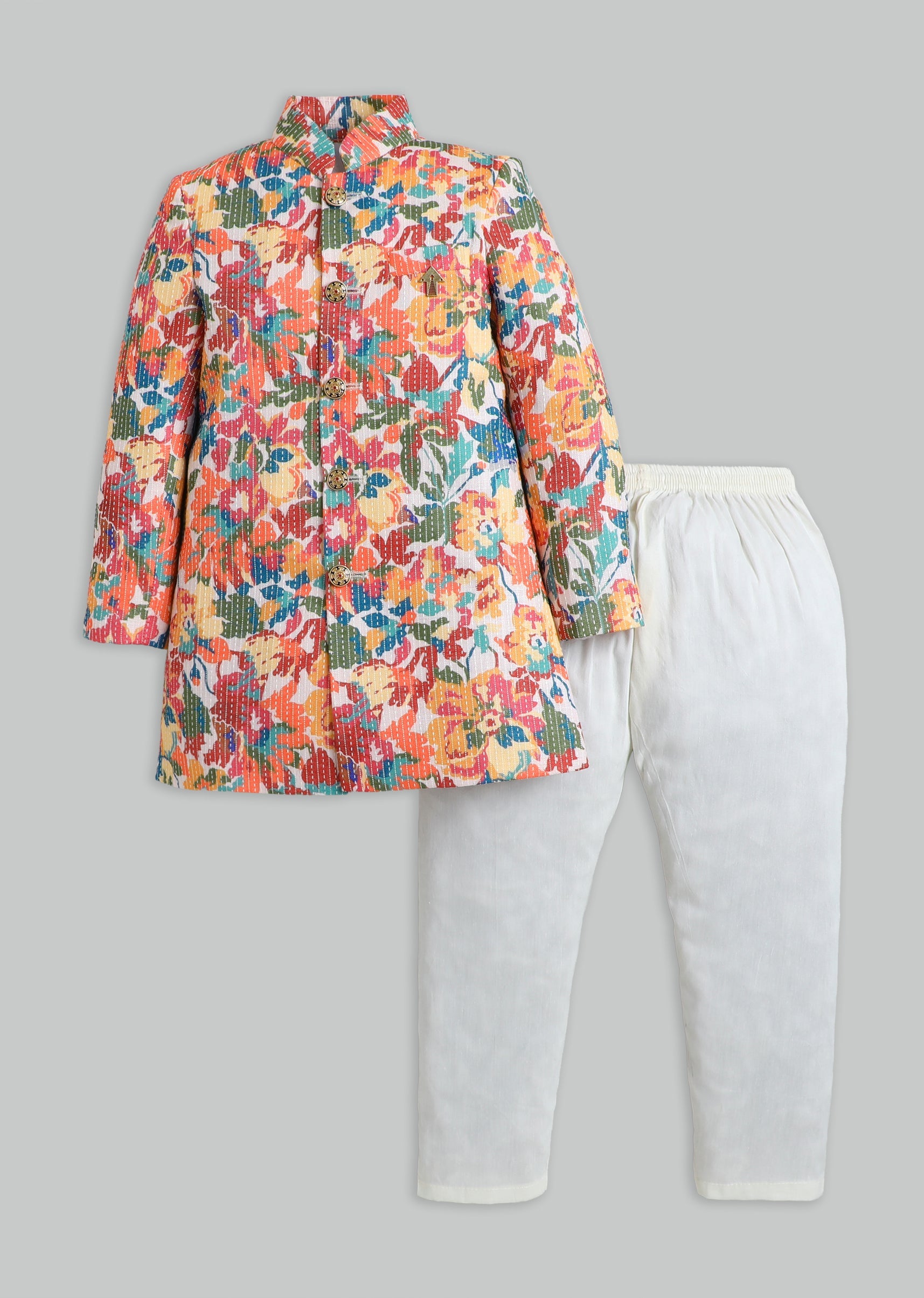A festive silk kurta set with multi floral print detailing, finished with a mandarin collar and front buttons. Comes with matching pants—easy to wear and ideal for celebrations. Awarded as... More Product Details