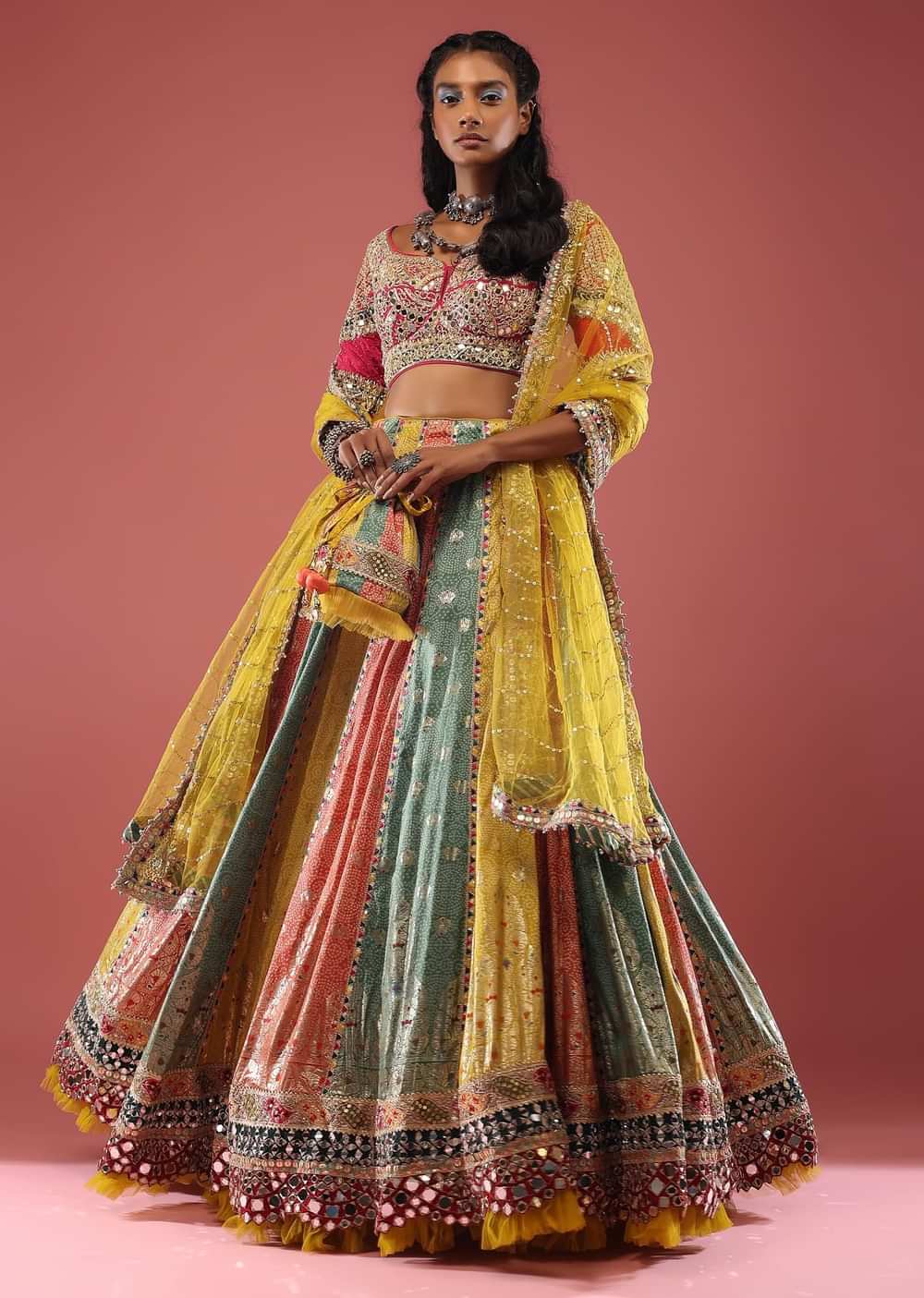 Multi Coloured Brocade Lehenga With Bandhani Print And Heavy Mirror Work On The Border