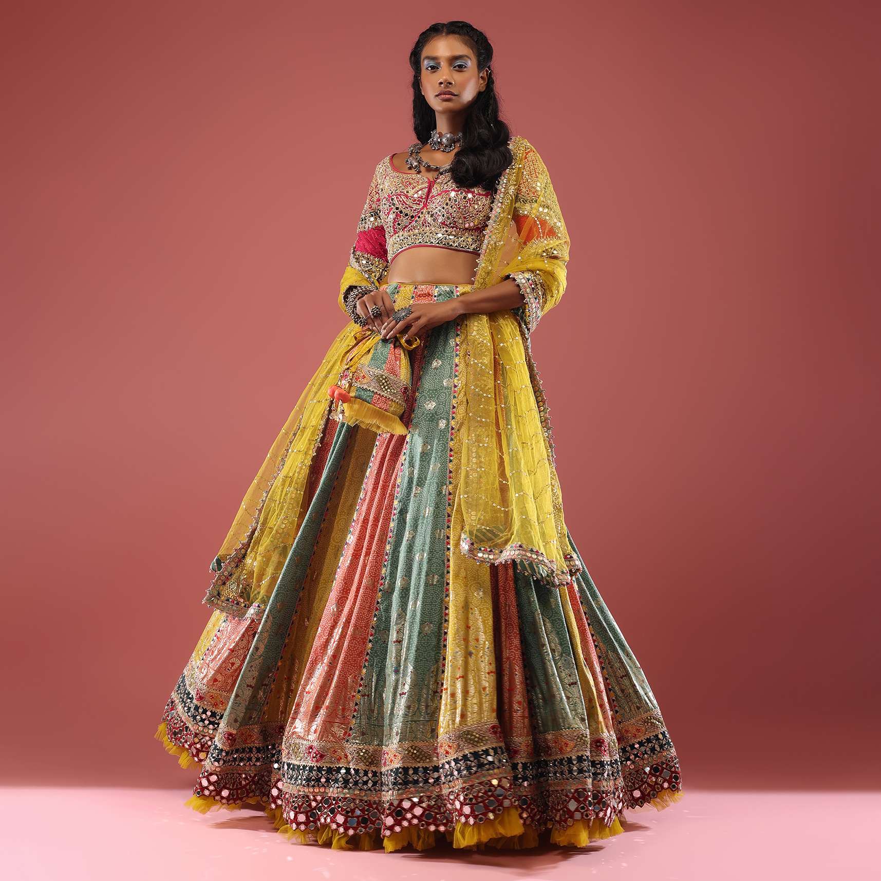 The brocade lehenga is a Multi Coloured silhouette with bandhani print and woven buttis.The border is intricated with mirror detailing.This gorgeous red blouse for the Multi Coloured lehenga includes intricate mirror work, is sewn, and has a sweetheart neckline.It has half sleeves, back hook closure and tassel dori.The blouse has thick hand embroidery all over that contributes to its opulent appearance.The hand-embroidered net dupatta enhances the fit's attractiveness.On the borders of the dupatta, there is lovely Moti Work and sequin work.This outfit stands out due to the combination of various colours and prints.We also provide a potli with bandhani print and hand embroidery to go along with your regal appearance.This piece includes cancan.NOTE - The dupatta border may vary.Actual color may slightly vary due to photographic lighting sources and device screen settings.Style the outfit with a corset belt boots and a watch for a victorian look.Being rewarded as the most trusted brand our customers too believe we deliver the same styles as promised on the website. Awarded as the Most Trusted Brand, we're delivering styles you love, just as promised.