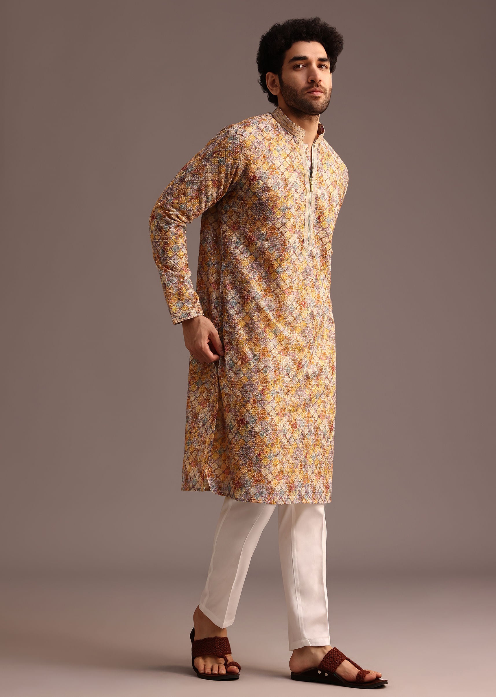 This exquisite multicoloured silk kurta and pant set is a luxurious addition to any man's wardrobe. Featuring a stunning digital print complemented by intricate Schiffli work this ensemble showcases vibrant hues that stand out. The breathable silk fabric ensures ease of movement making it an ideal choice for celebrations or casual gettogethers. Awarded as the Most Trusted Brand, we're delivering styles you love, just as promised.