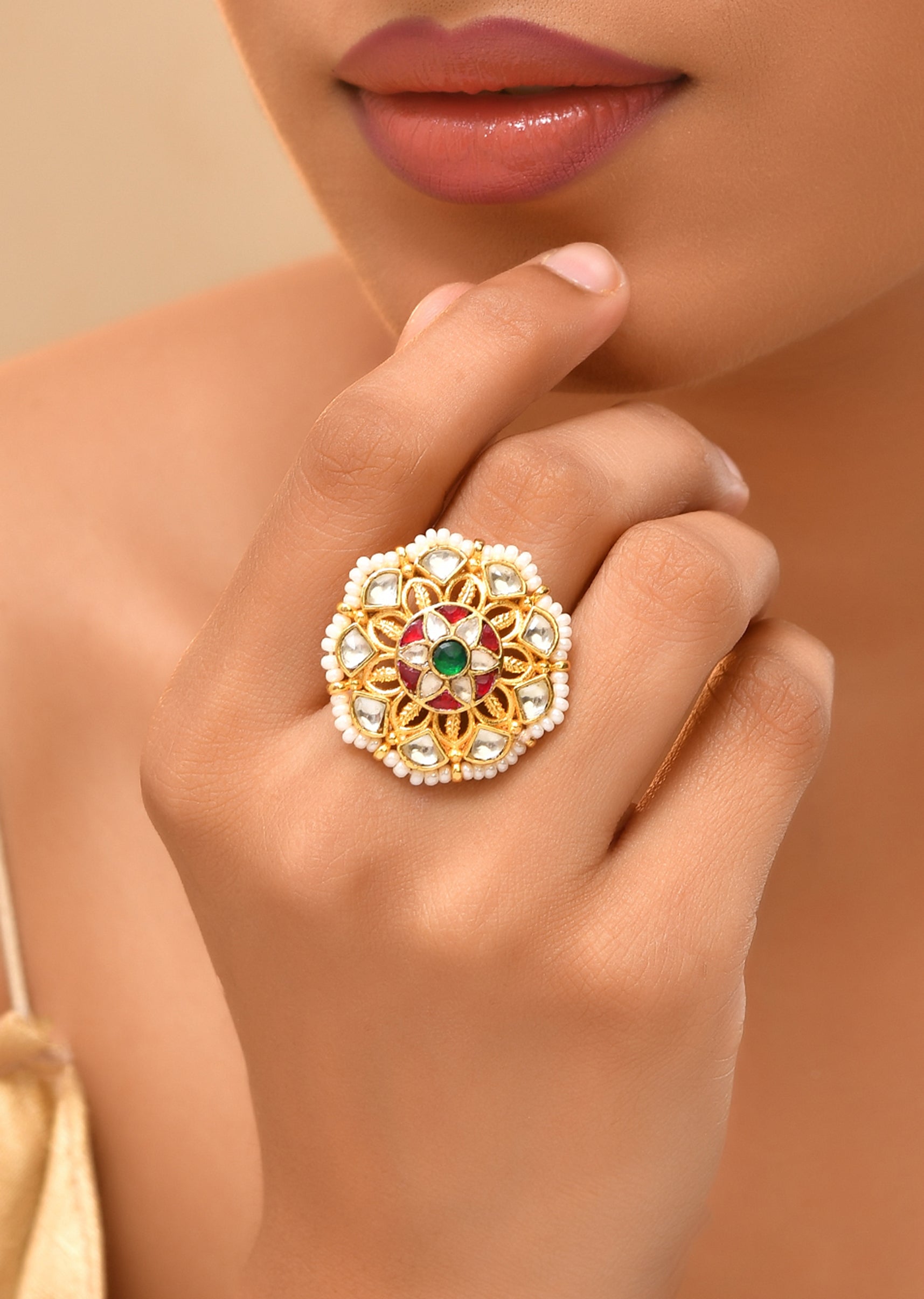 Bring a touch of timeless charm to your ensemble with this white floral kundan ring, accented with a delicate bead border for added texture and elegance. Ideal for festive events... More Product Details