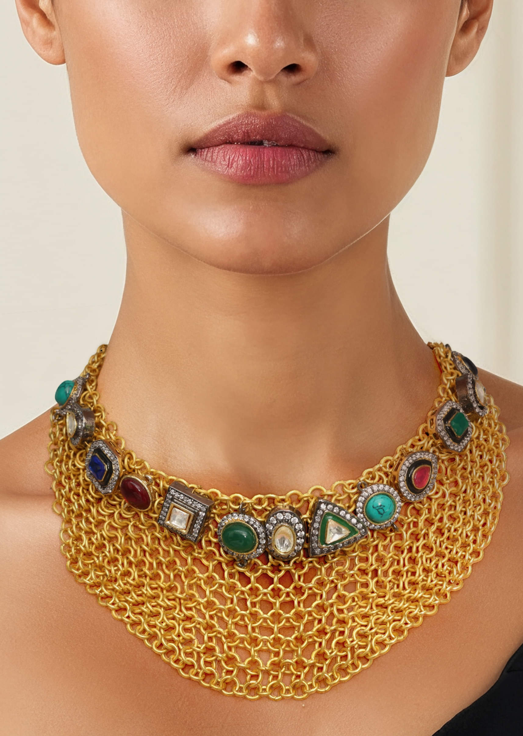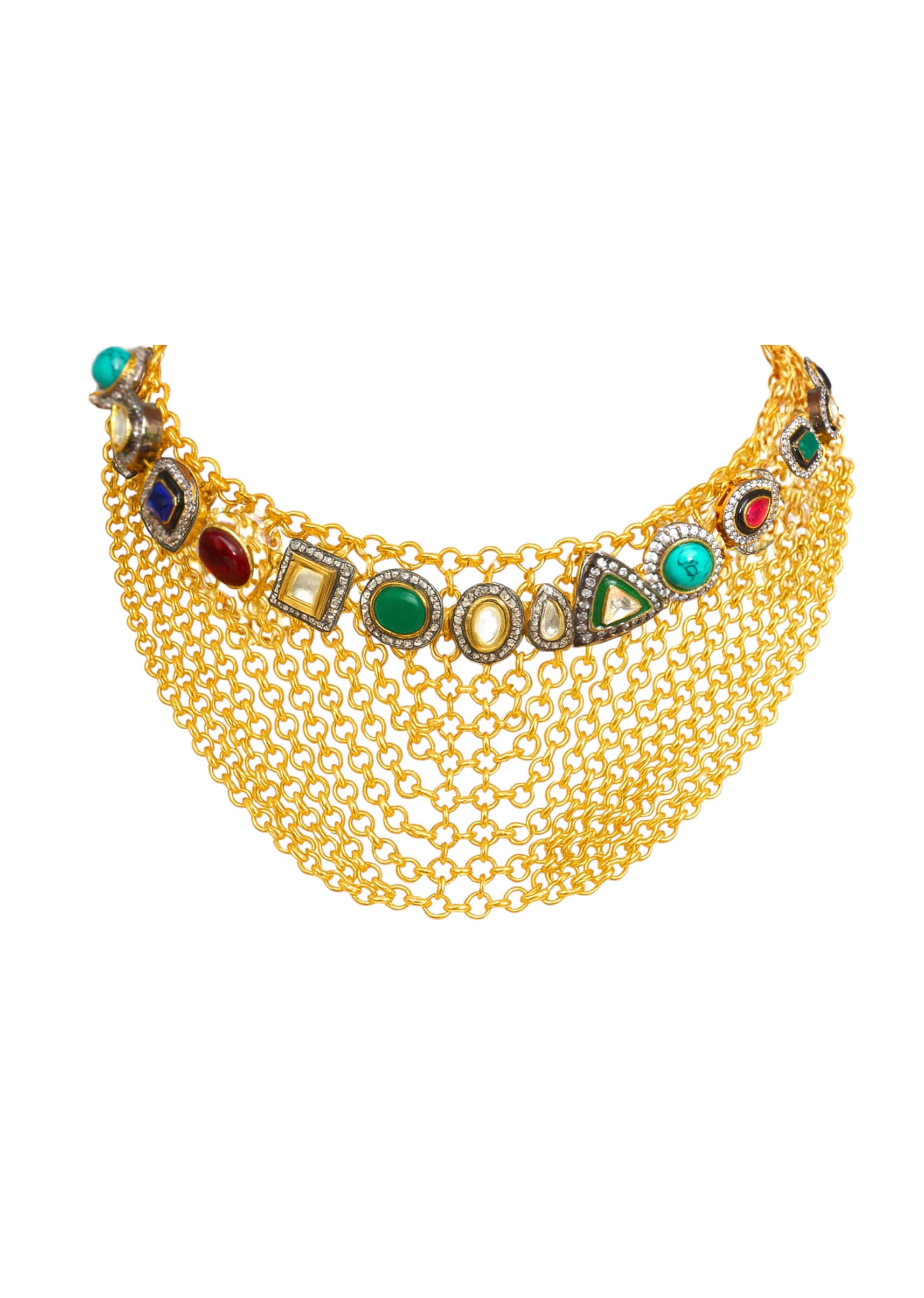 Multi Fusion Chain Tassel Stone Encrusted Necklace