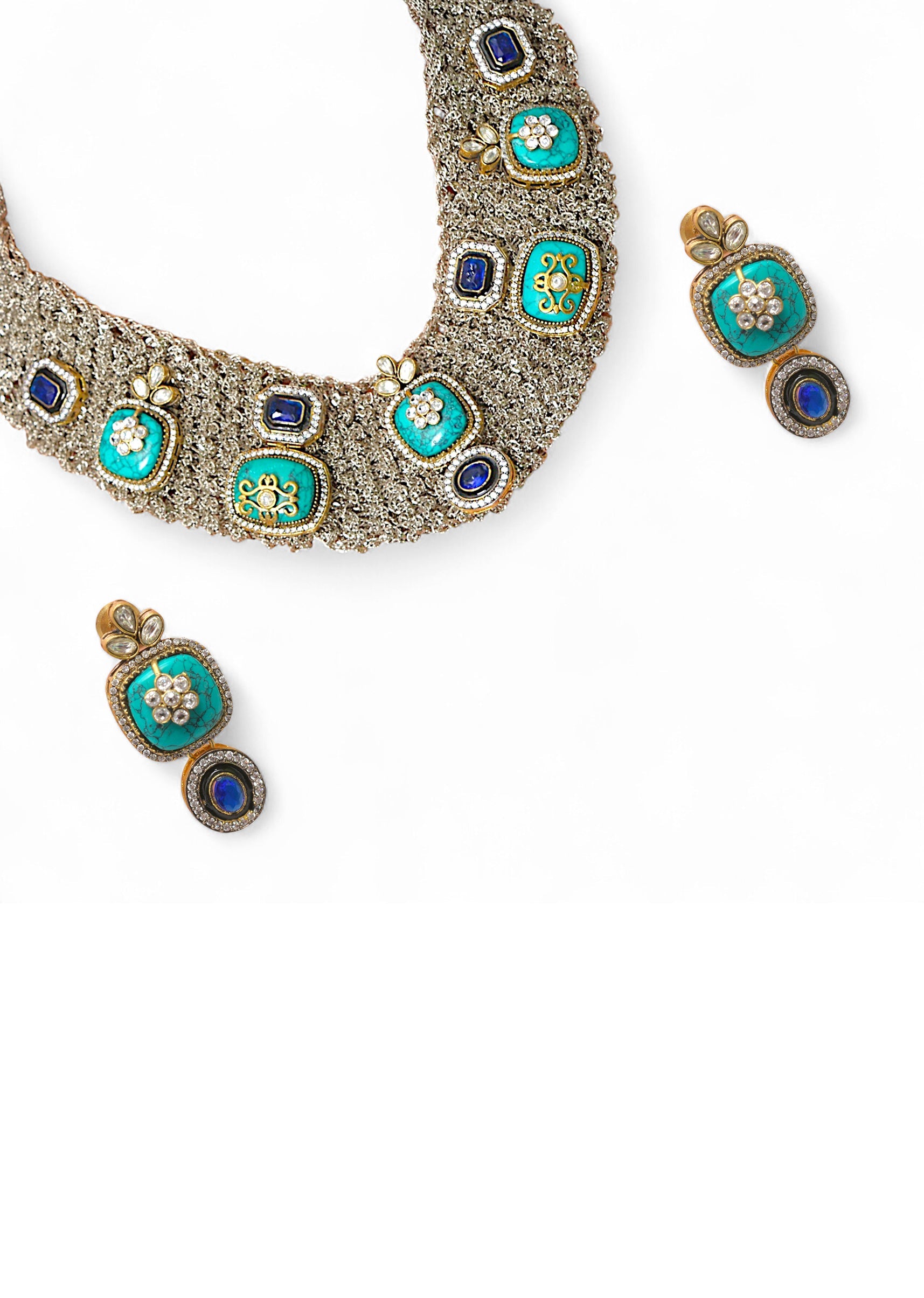 A multi fusion encrusted geometric stone necklace set featuring vibrant stones in bold geometric patterns, blending contemporary style with traditional craftsmanship. Perfect for adding a striking and elegant touch to... More Product Details
