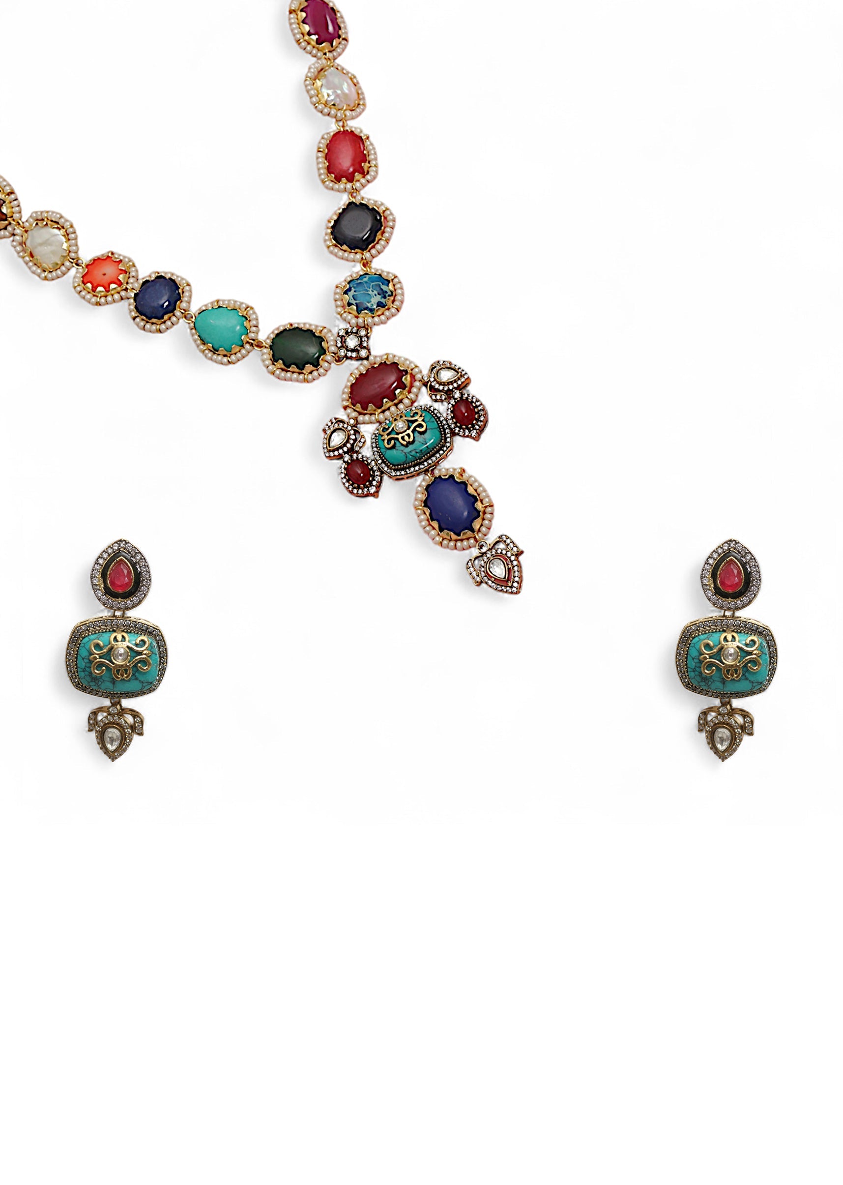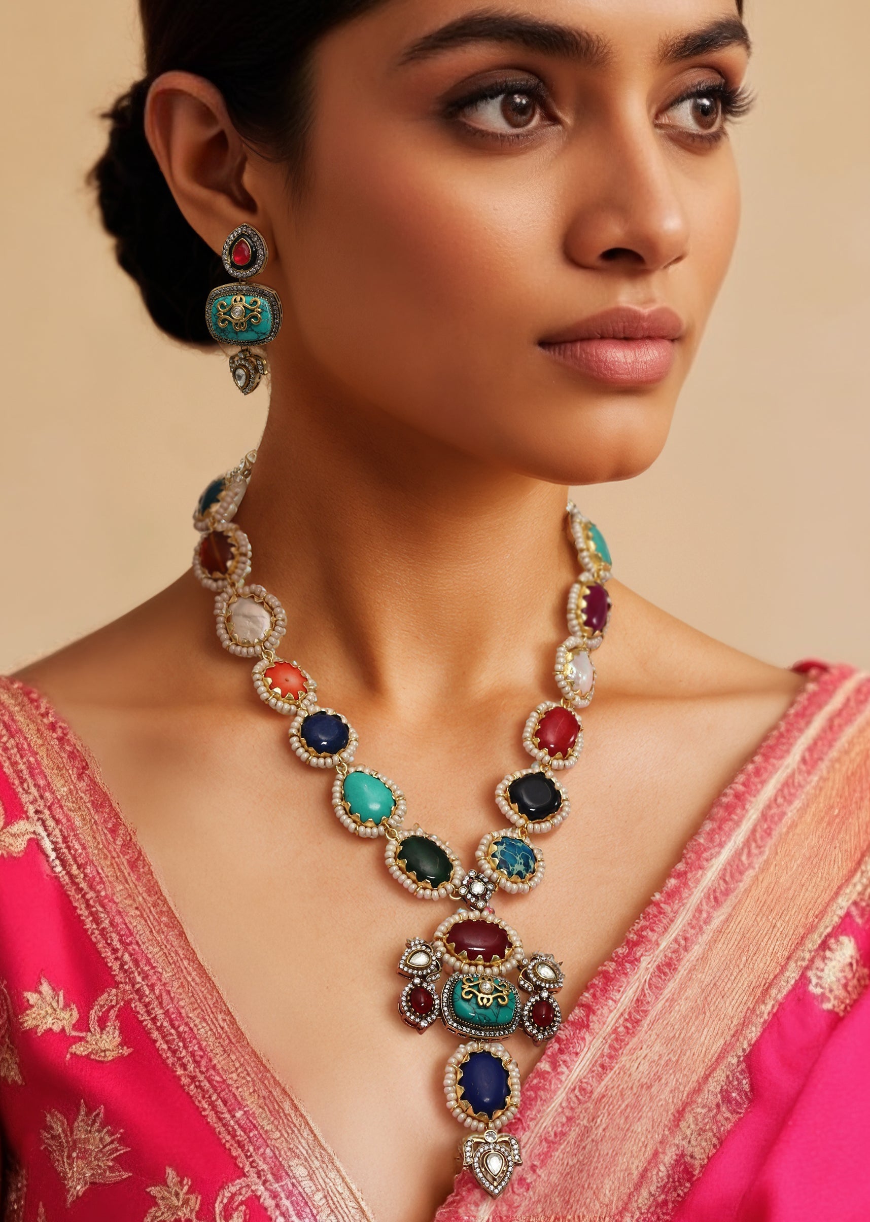 A multi fusion geometric stone necklace set featuring vibrant stones arranged in bold geometric patterns, blending contemporary design with traditional craftsmanship. Perfect for adding a modern and artistic touch to... More Product Details