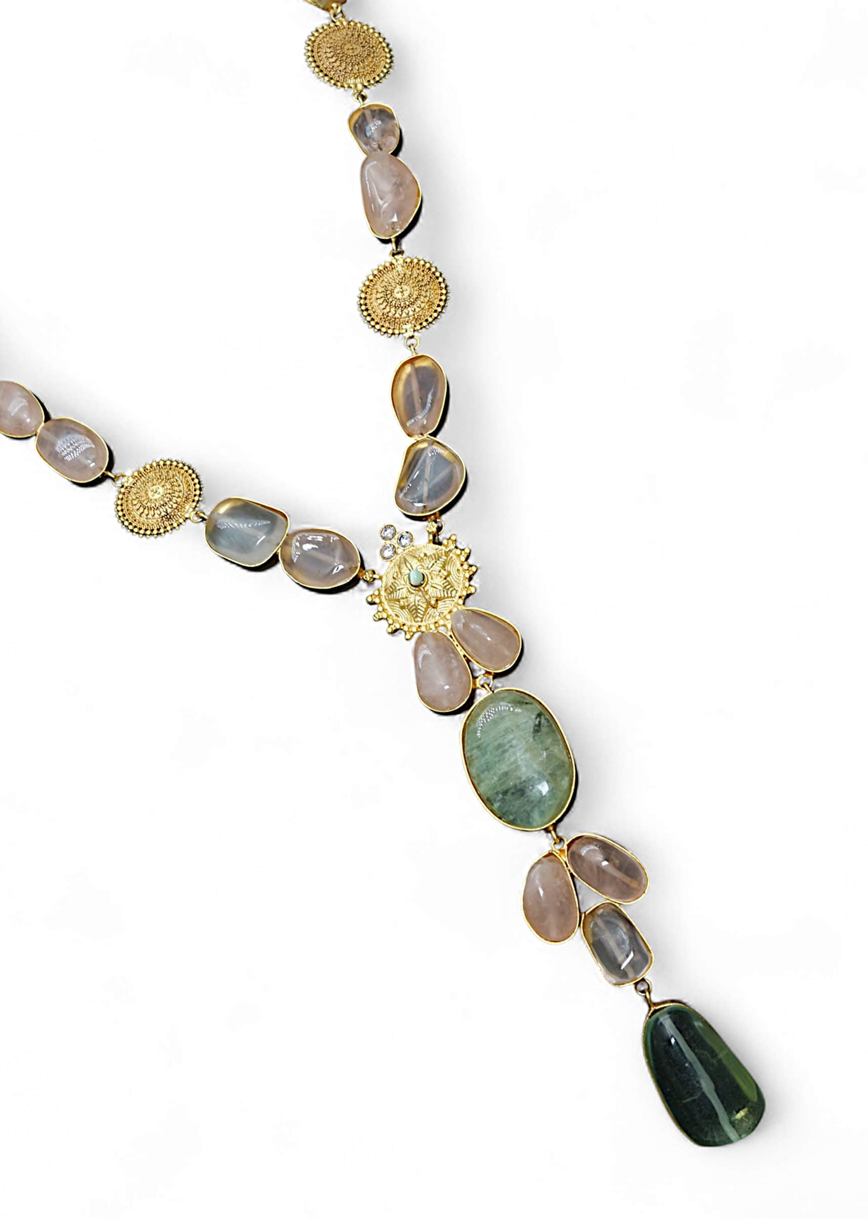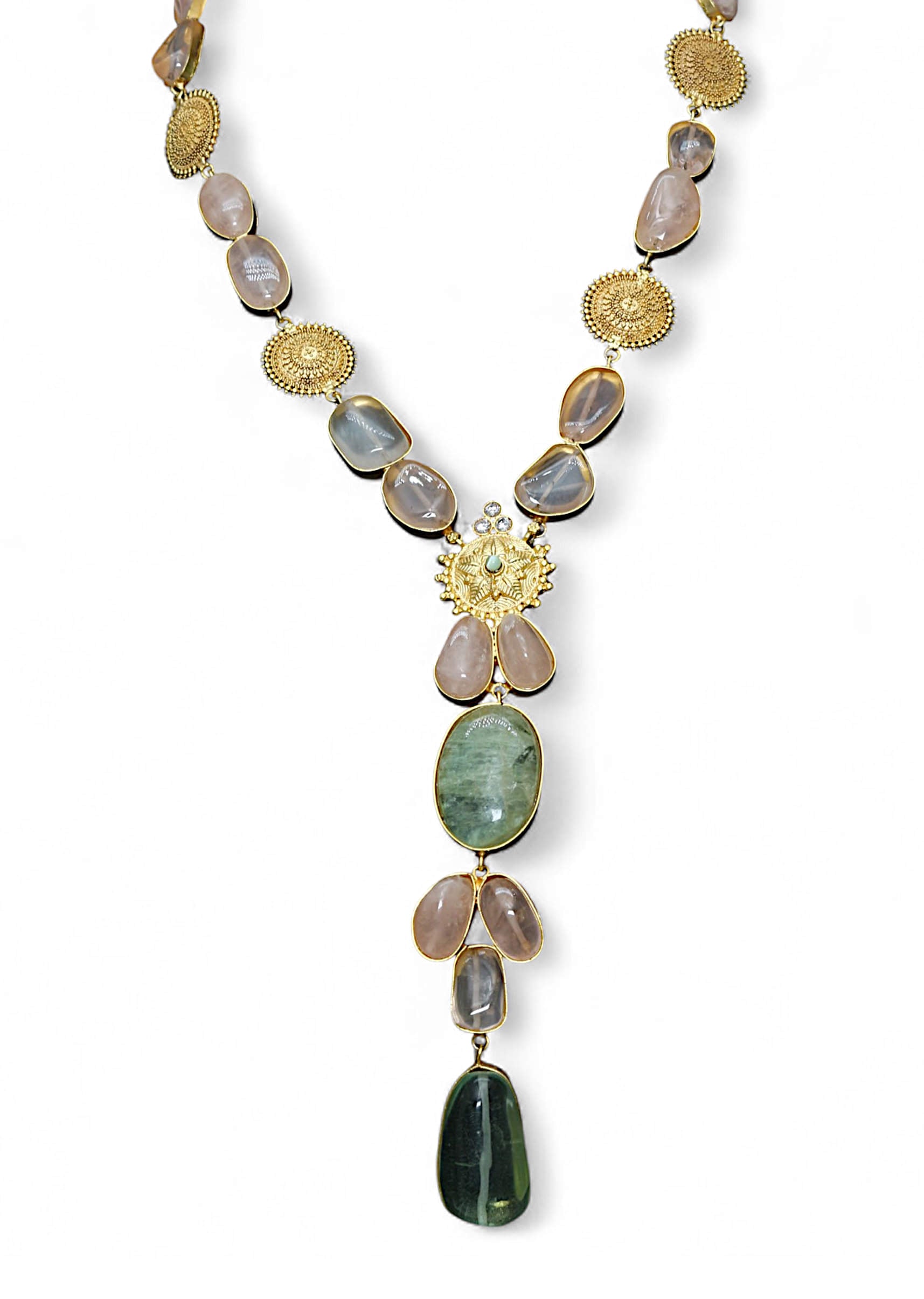 A multi fusion long necklace featuring a blend of vibrant stones and intricate craftsmanship, combining traditional charm with contemporary elegance. Perfect for adding a statement-making touch to bridal, festive, or... More Product Details