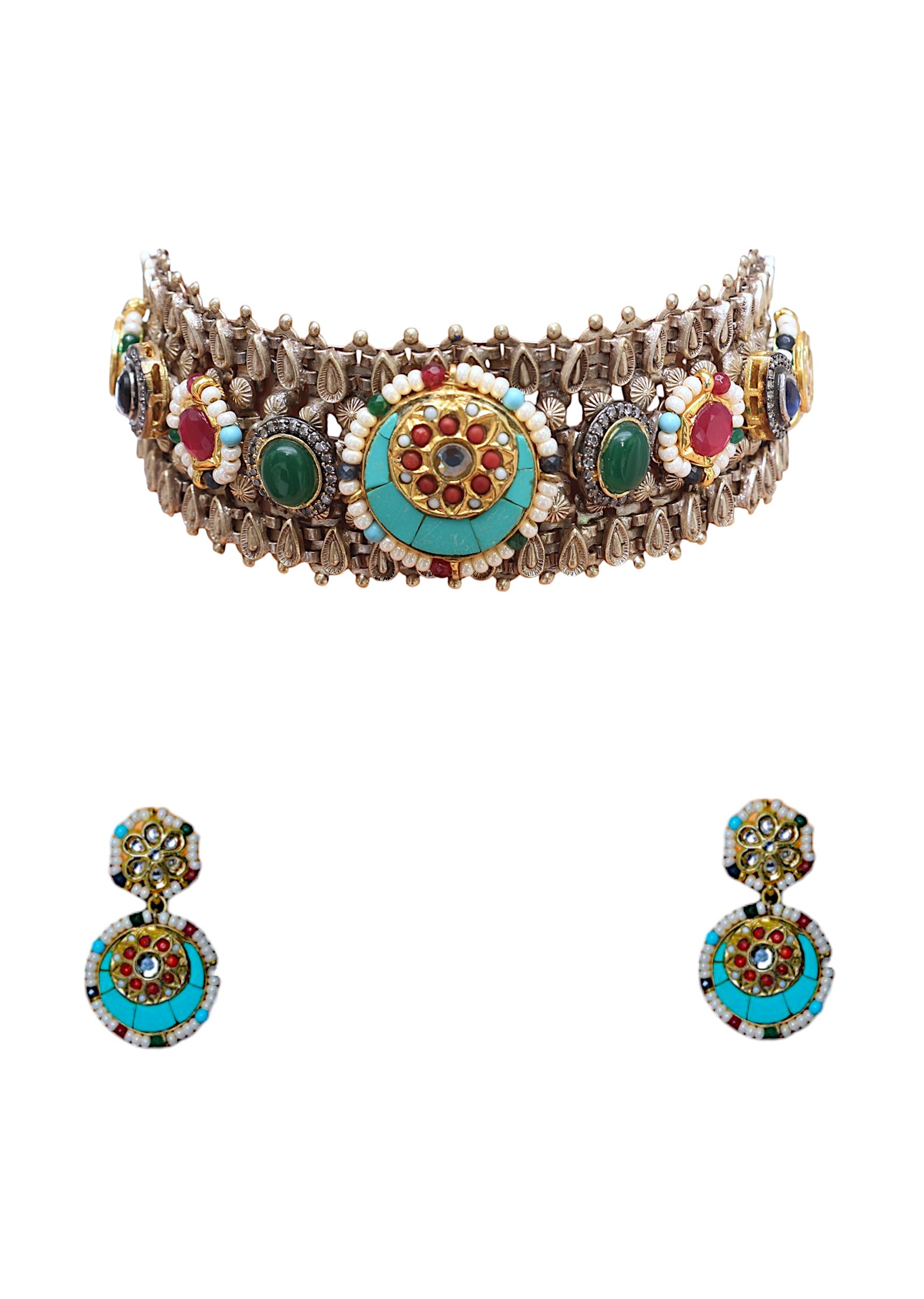 A multi fusion necklace and earring set featuring vibrant stones and intricate craftsmanship, blending traditional charm with contemporary elegance. Perfect for adding a bold and stylish touch to bridal, festive,... More Product Details