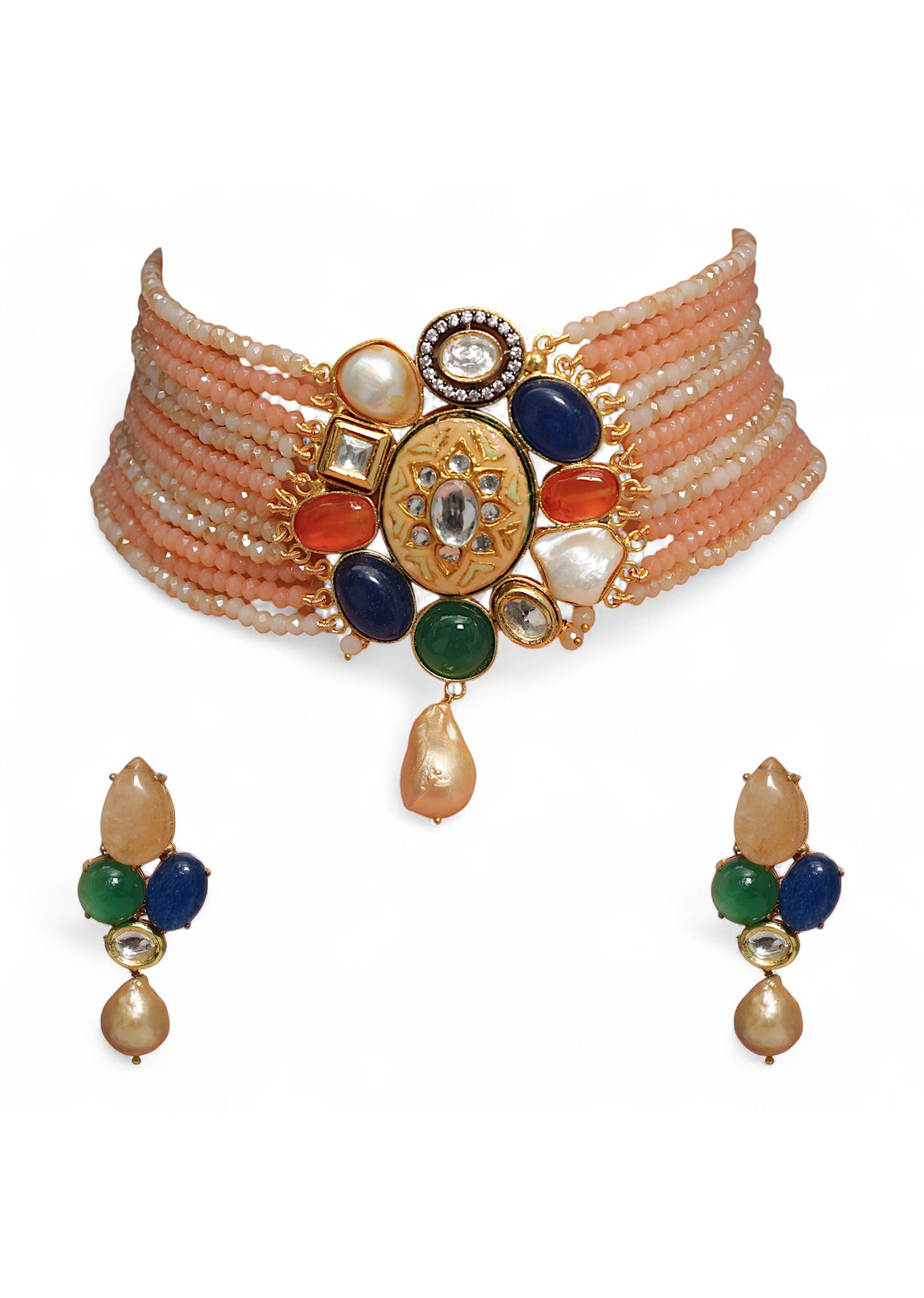 A multi fusion necklace and earring set featuring vibrant stones and intricate craftsmanship, blending traditional charm with contemporary elegance. Perfect for adding a coordinated, statement-making touch to bridal, festive, or ethnic ensembles. Awarded as the Most Trusted Brand, we're delivering styles you love, just as promised.