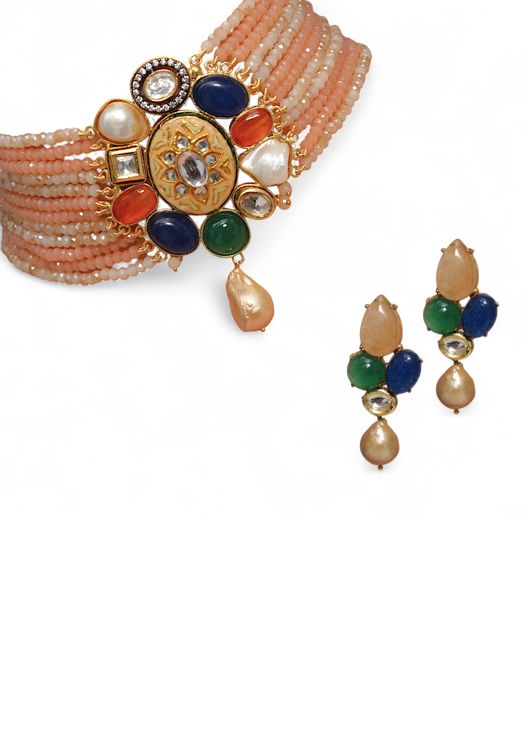 A multi fusion necklace and earring set featuring vibrant stones and intricate craftsmanship, blending traditional charm with contemporary elegance. Perfect for adding a coordinated, statement-making touch to bridal, festive, or... More Product Details
