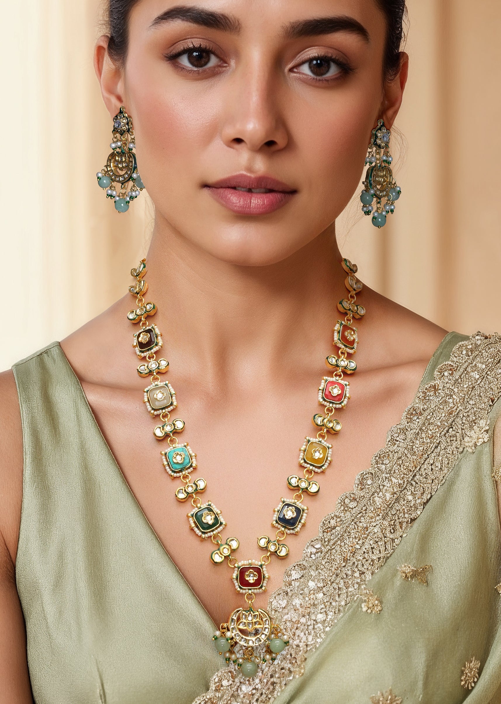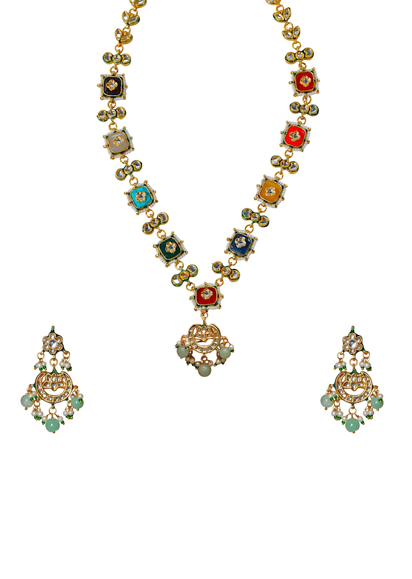 A multi fusion pendant necklace and earring set featuring a bold, intricately designed pendant with vibrant stones, blending contemporary style with traditional charm. Perfect for adding a striking and elegant... More Product Details