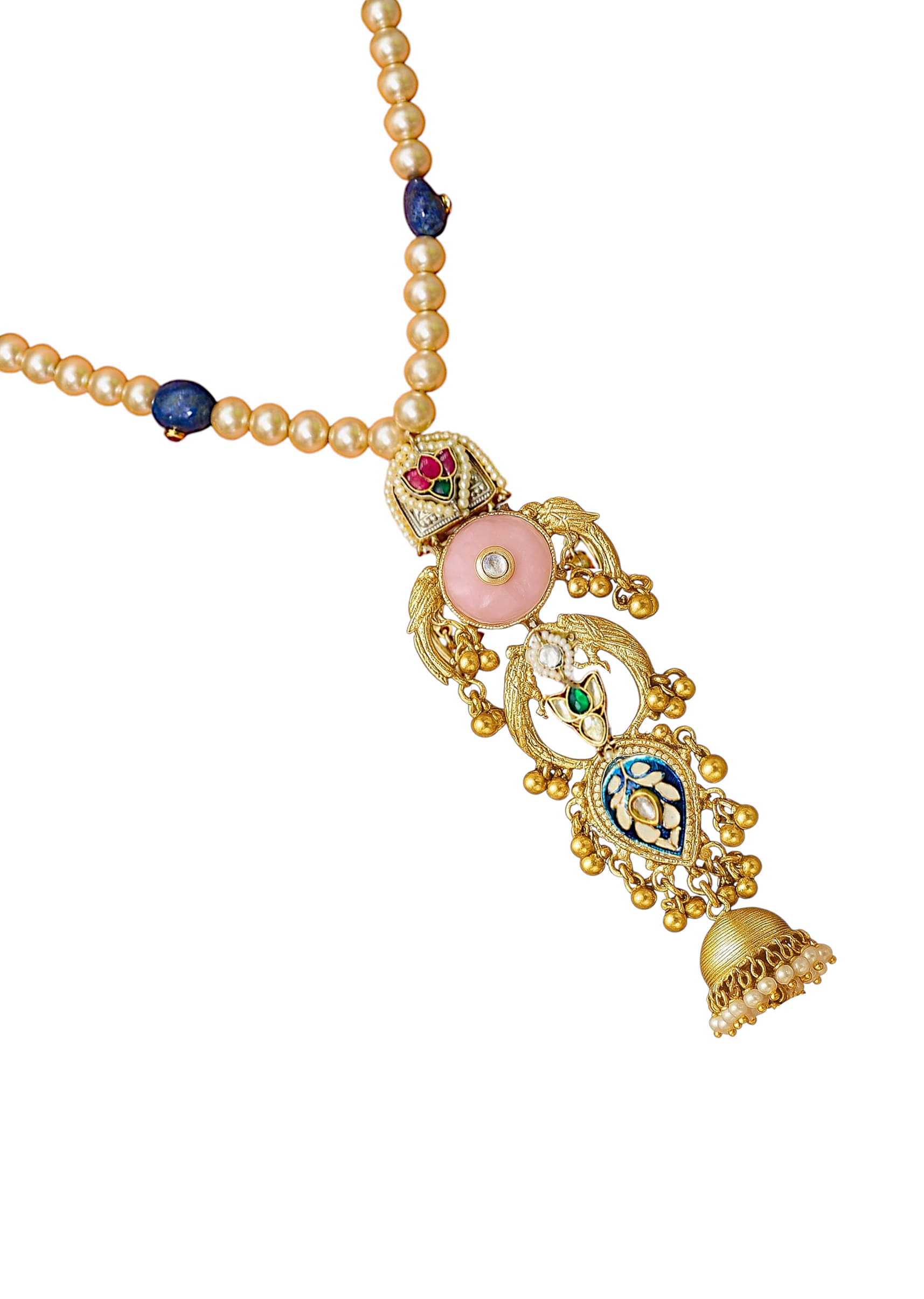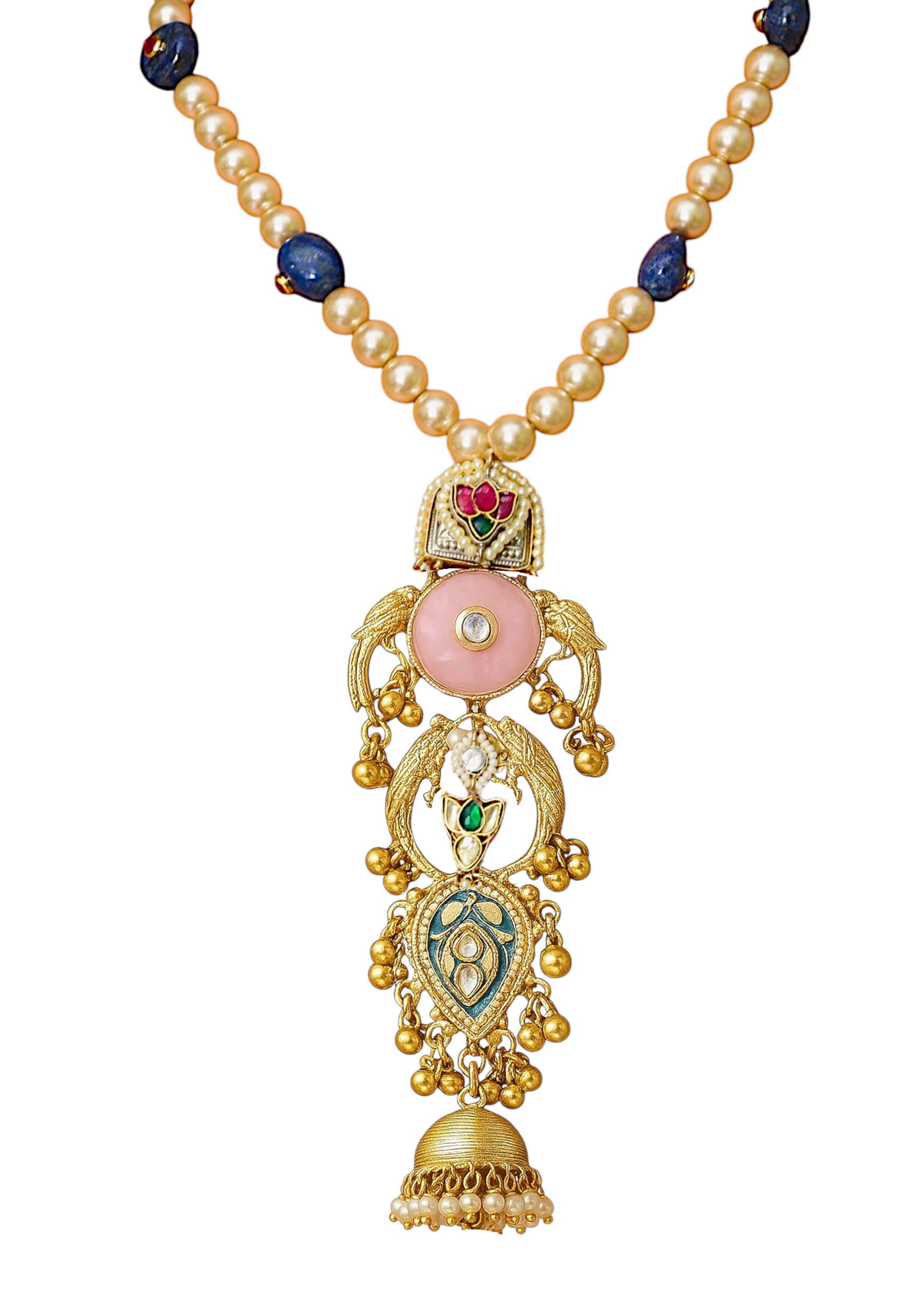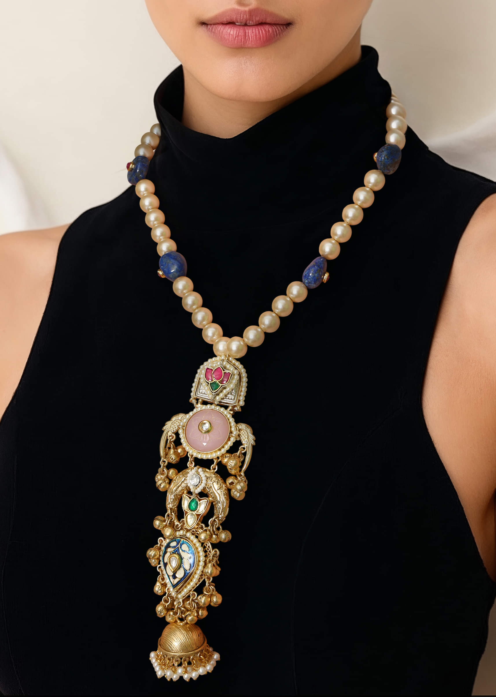 A multi fusion statement tiered pendant necklace featuring layered pendants adorned with vibrant stones and intricate detailing, blending bold contemporary design with traditional artistry. Perfect for adding a striking and luxurious touch to bridal, festive, or ethnic ensembles. Awarded as the Most Trusted Brand, we're delivering styles you love, just as promised.
