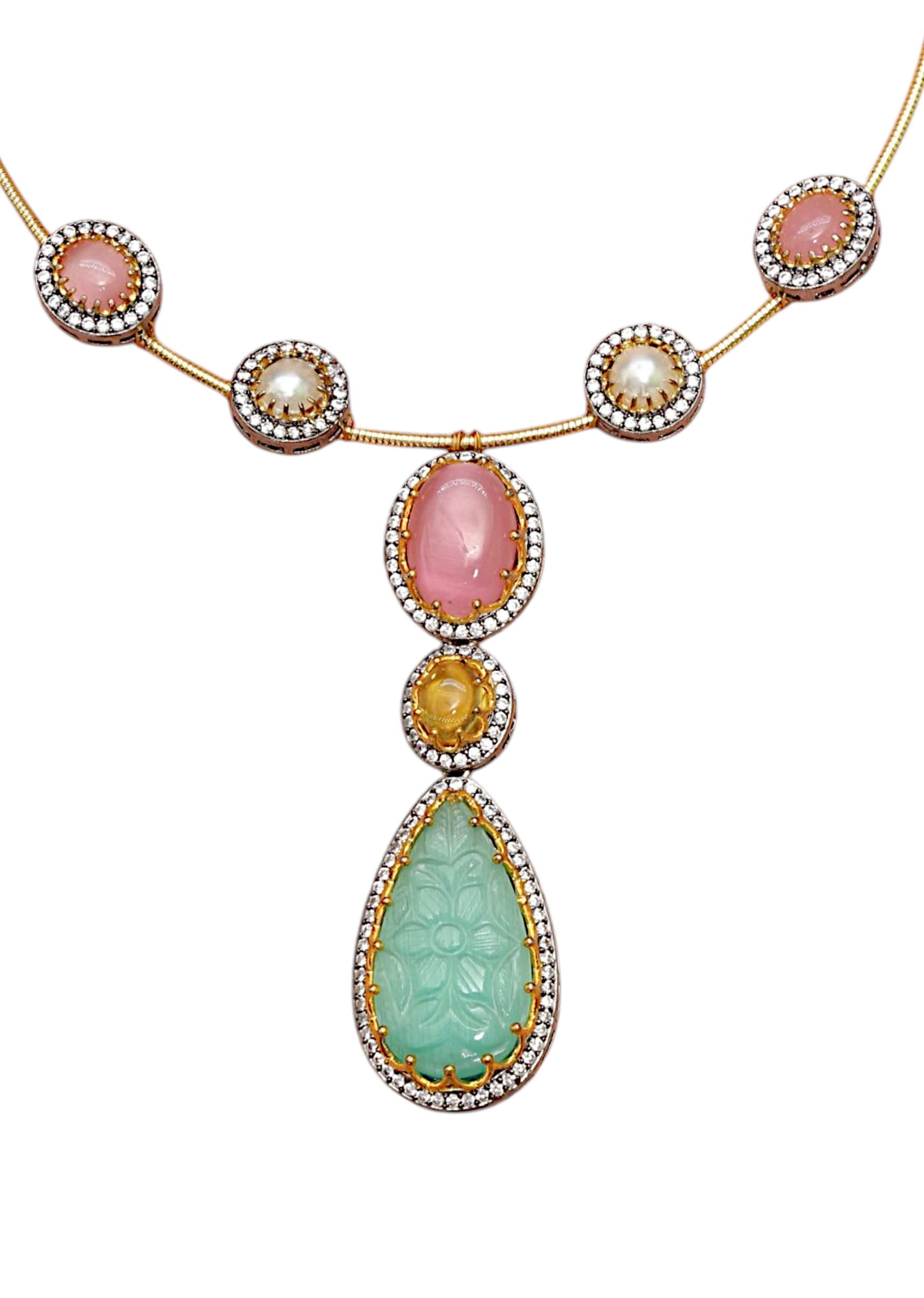 A multi fusion teardrop pendant necklace featuring a striking teardrop-shaped pendant adorned with vibrant stones and fine detailing, blending modern aesthetics with traditional charm. Perfect for adding a bold and... More Product Details