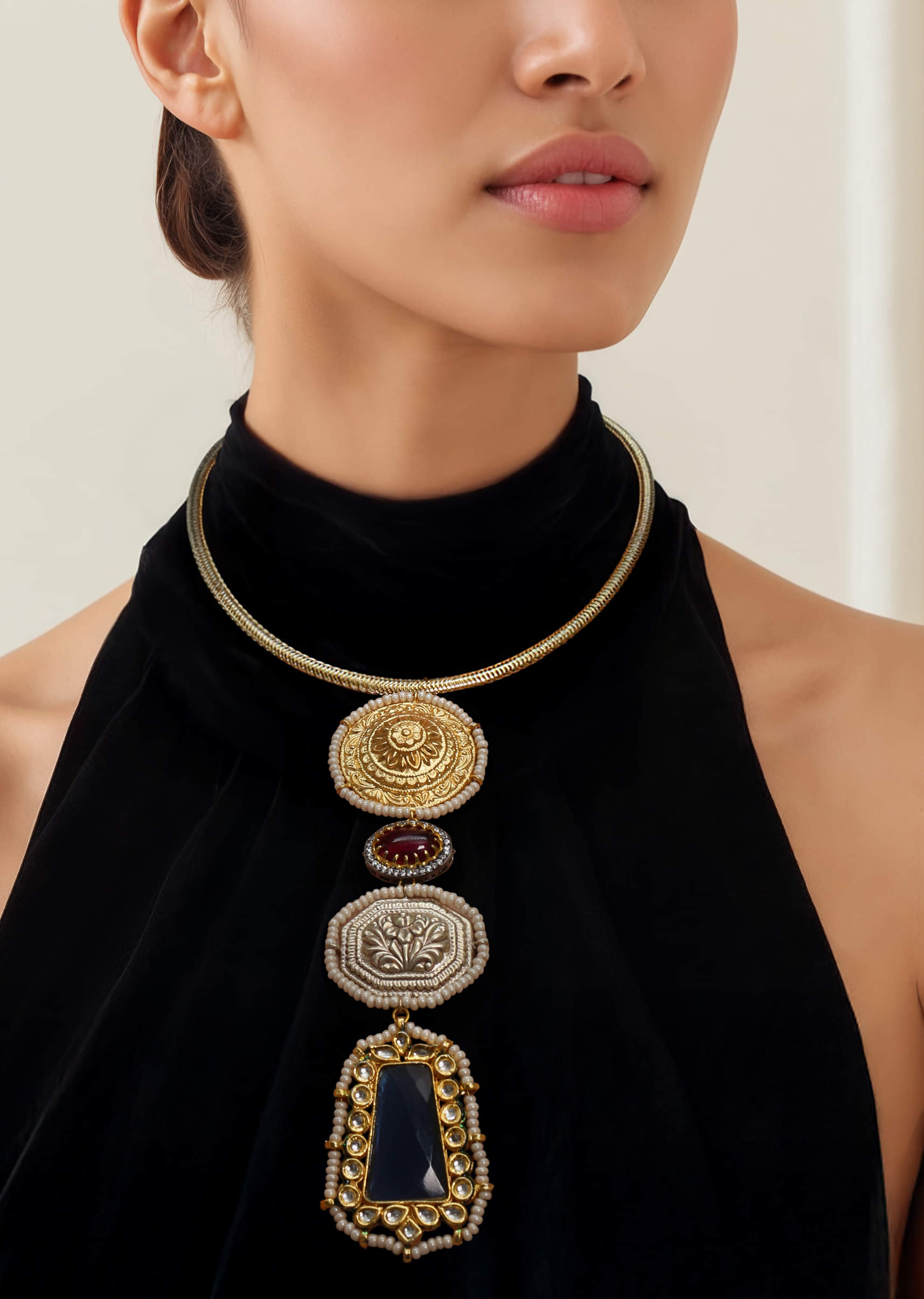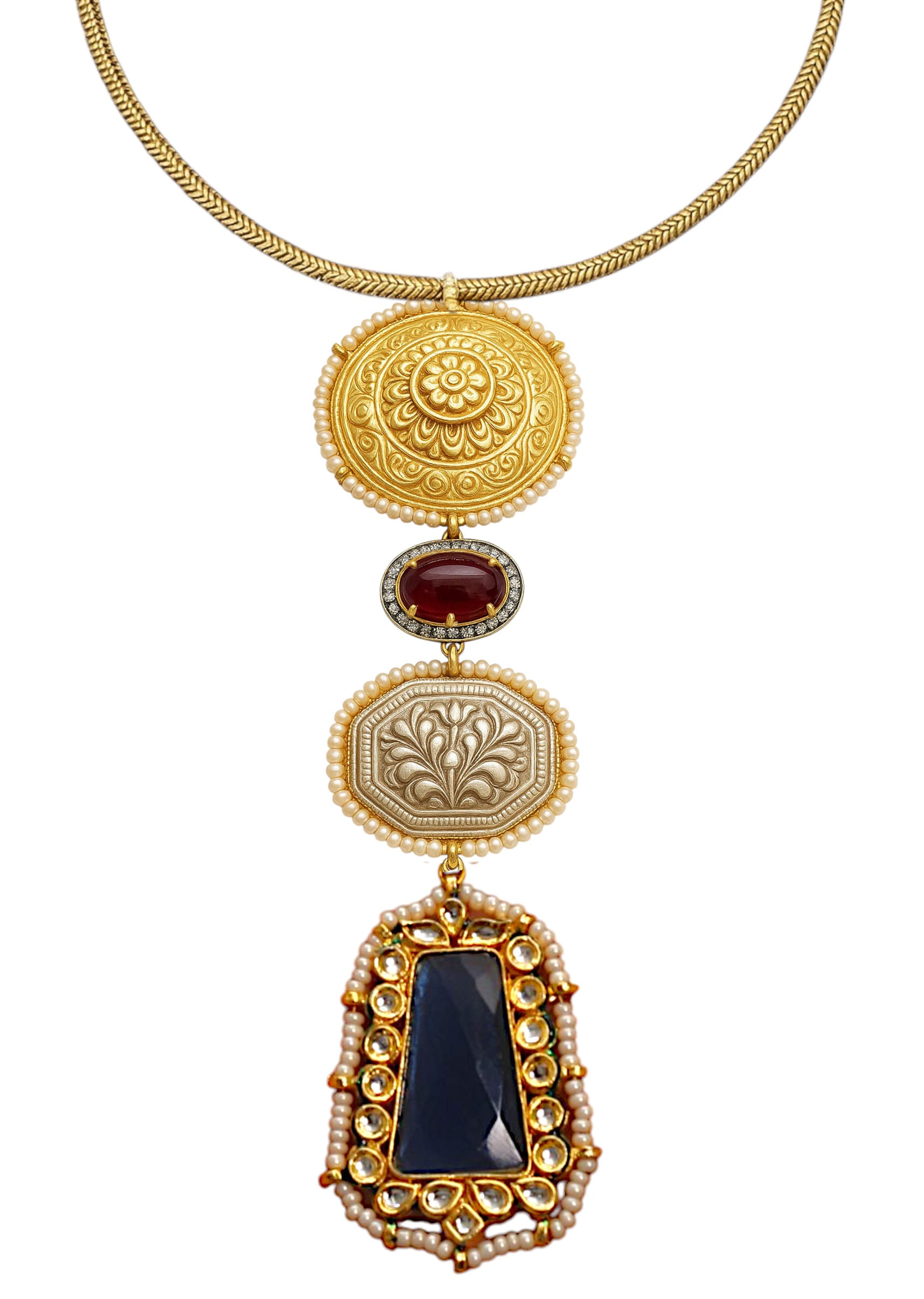 A multi fusion tiered oversized pendant necklace featuring layered designs with vibrant stones and intricate detailing, blending bold contemporary style with traditional elegance. Perfect for adding a statement-making touch to... More Product Details