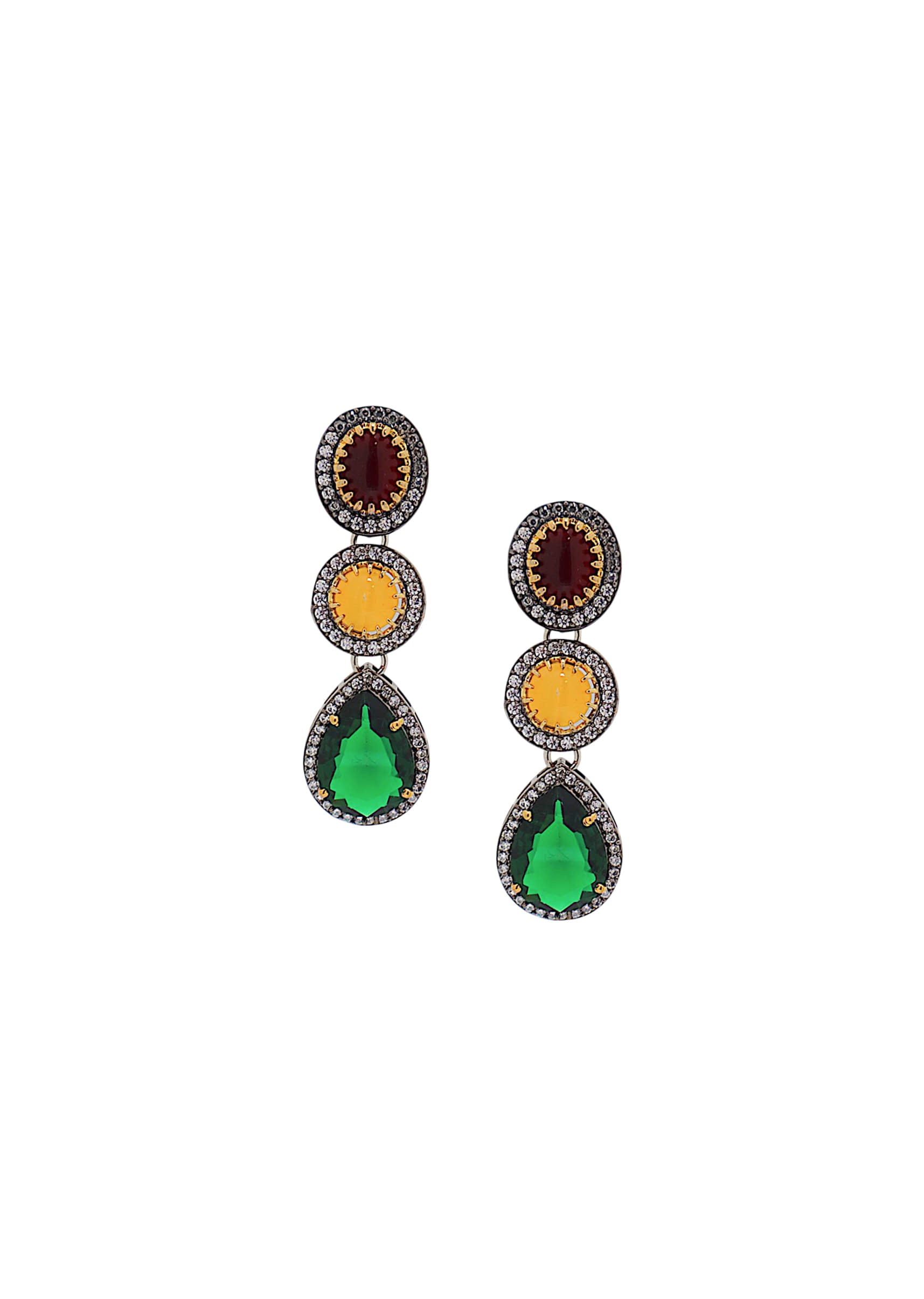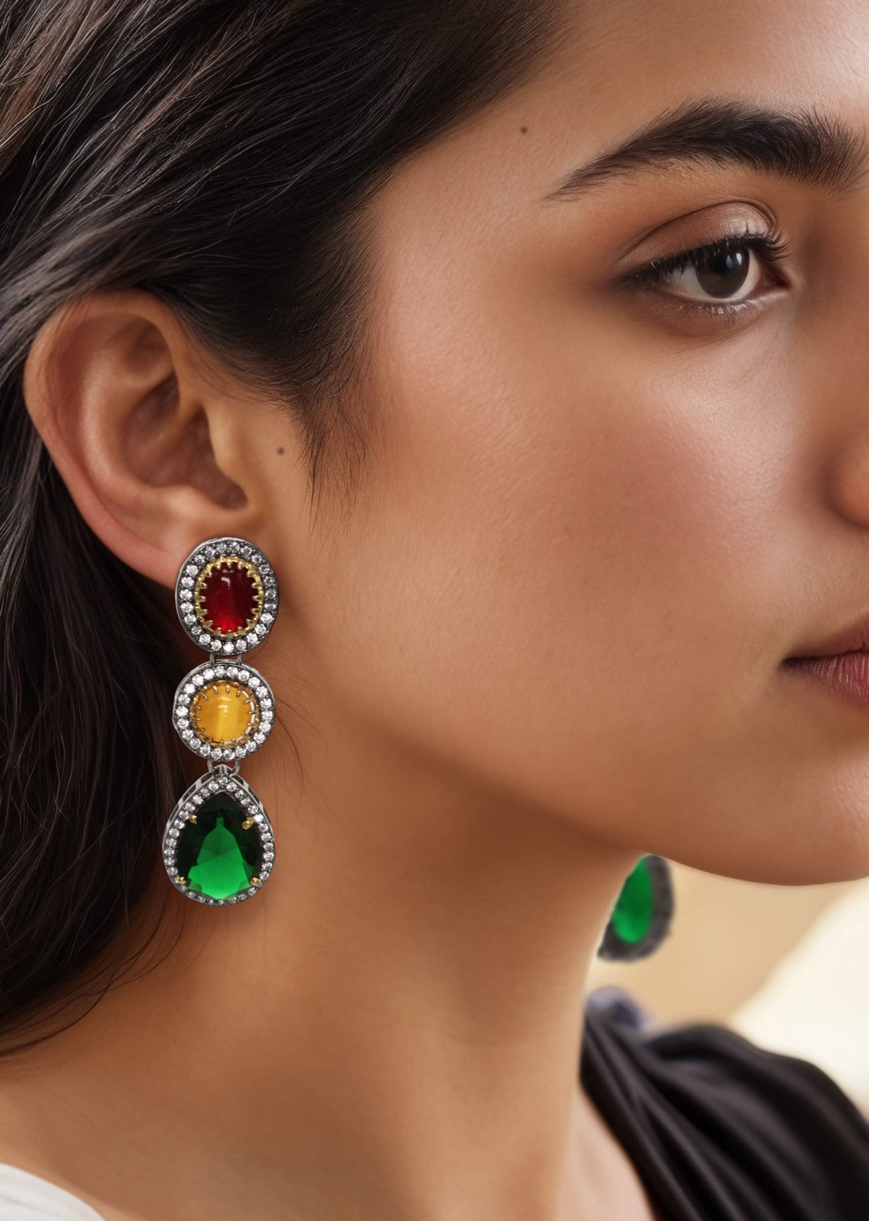 A pair of multi fusion tiered teardrop danglers featuring layered design and vibrant stones, blending contemporary style with traditional elegance. Perfect for adding a bold and stylish touch to bridal, festive, or ethnic ensembles. Awarded as the Most Trusted Brand, we're delivering styles you love, just as promised.