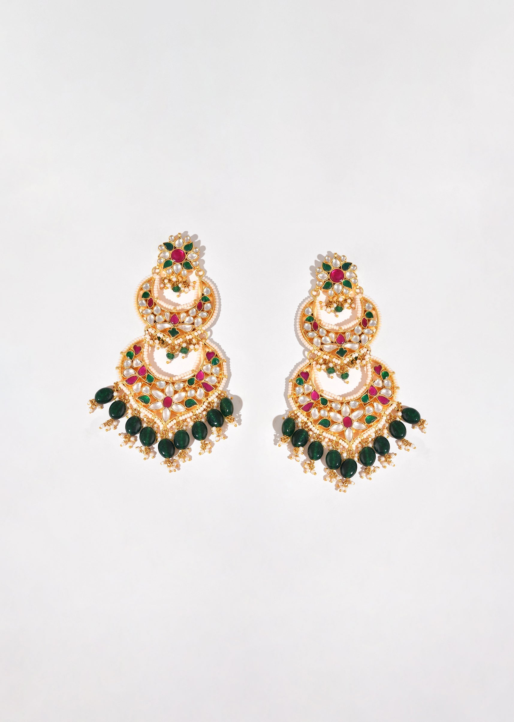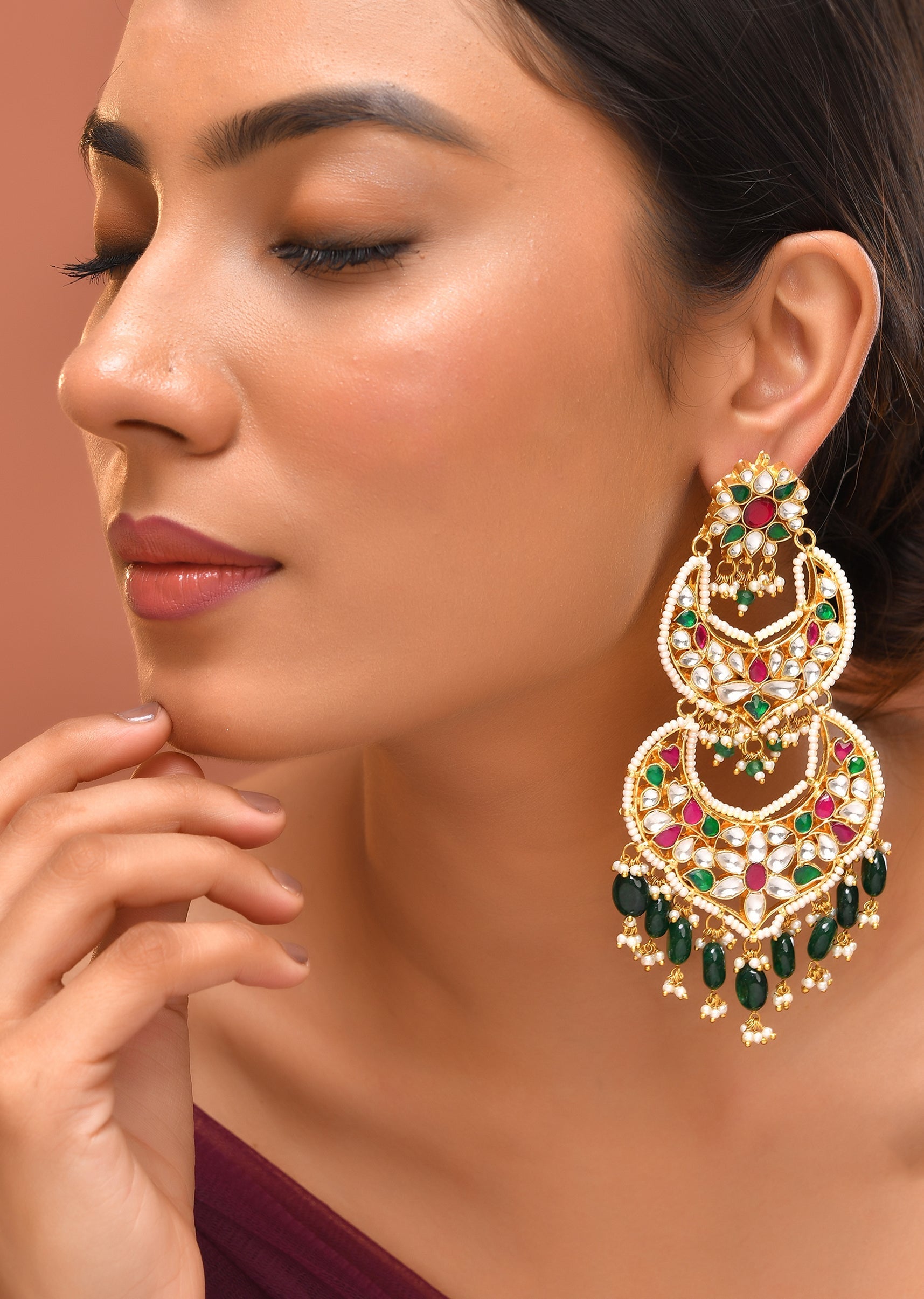 These multi green earrings feature intricate pachi kundan work for a festive and elegant appeal. Perfect for mehendi celebrations, they are ideal for bridesmaids or wedding guests. The vibrant green... More Product Details