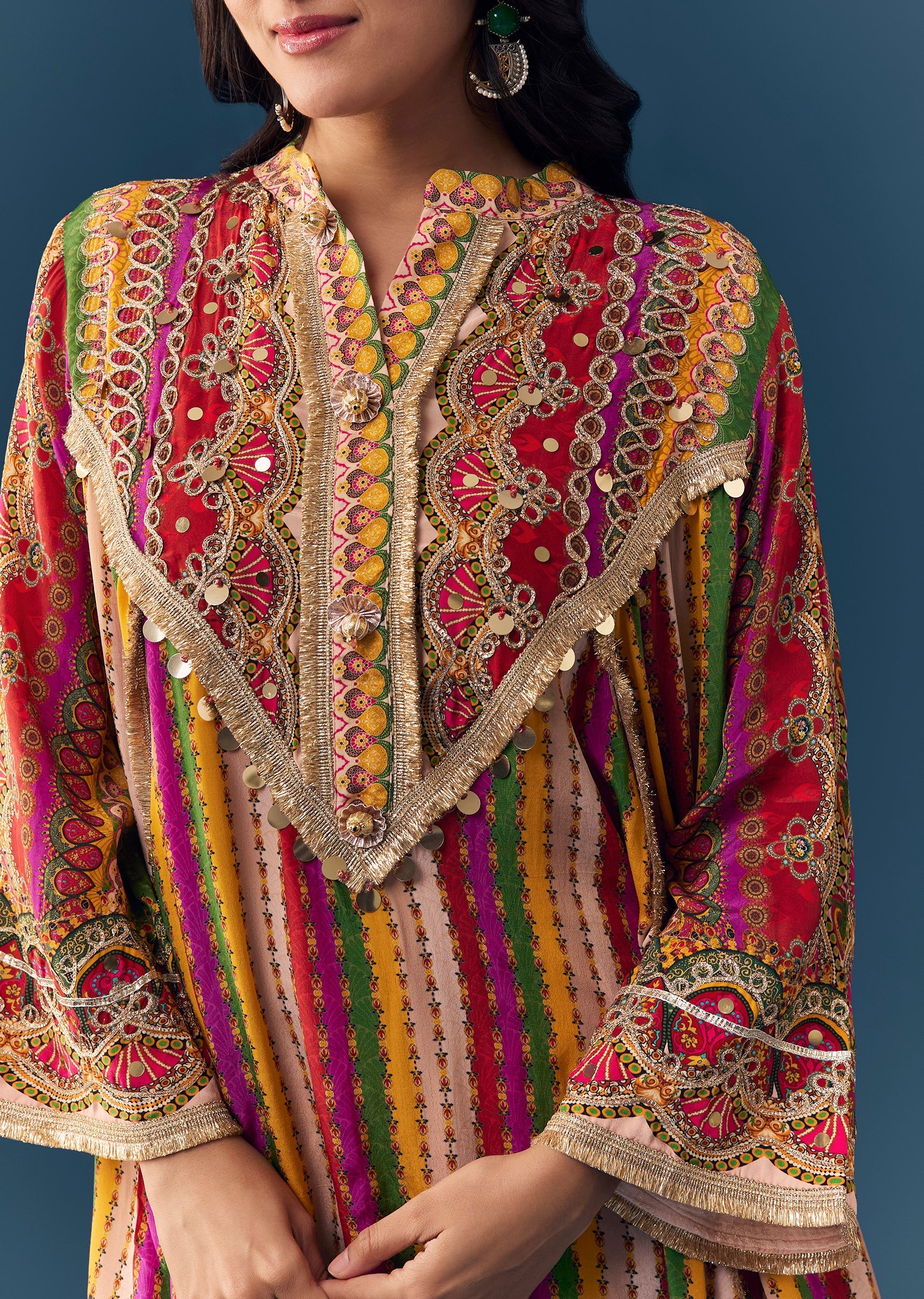 Turn up the festive charm with this indie-printed kurta, detailed with delicate gotta lace work that adds a lively celebratory sparkle. The mandarin collar and flared sleeves bring a stylish... More Product Details