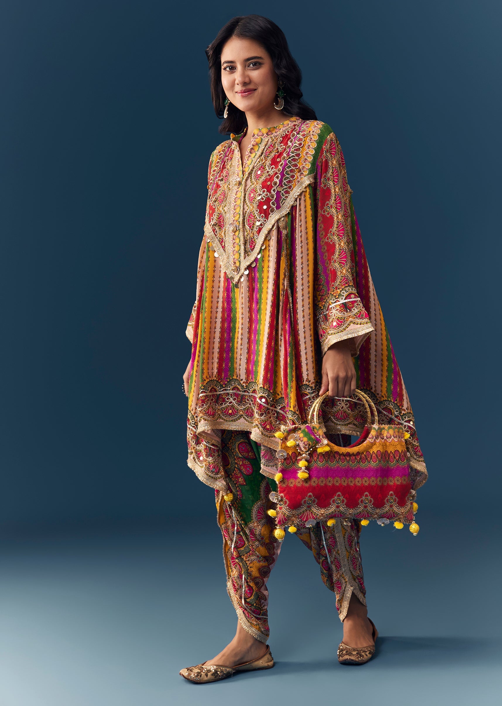Multi Indie Print Kurti Dhoti Set with Handbag