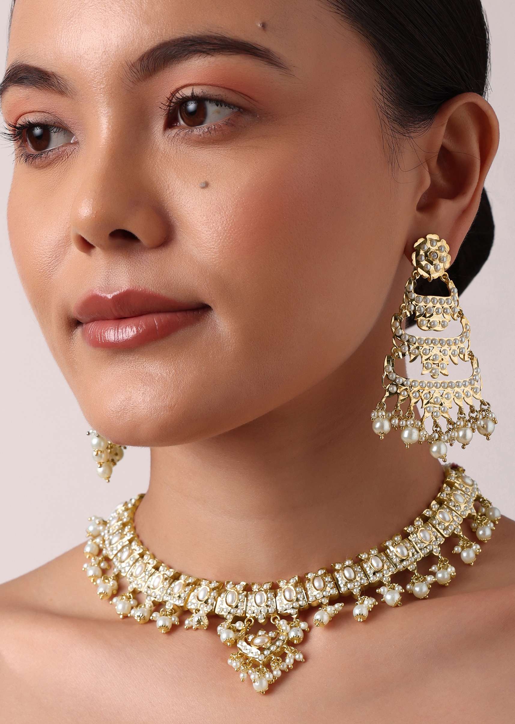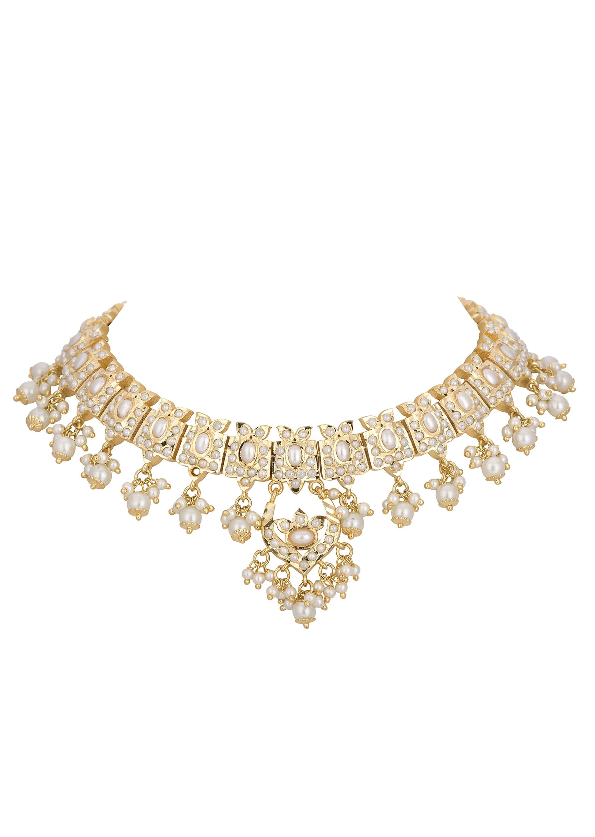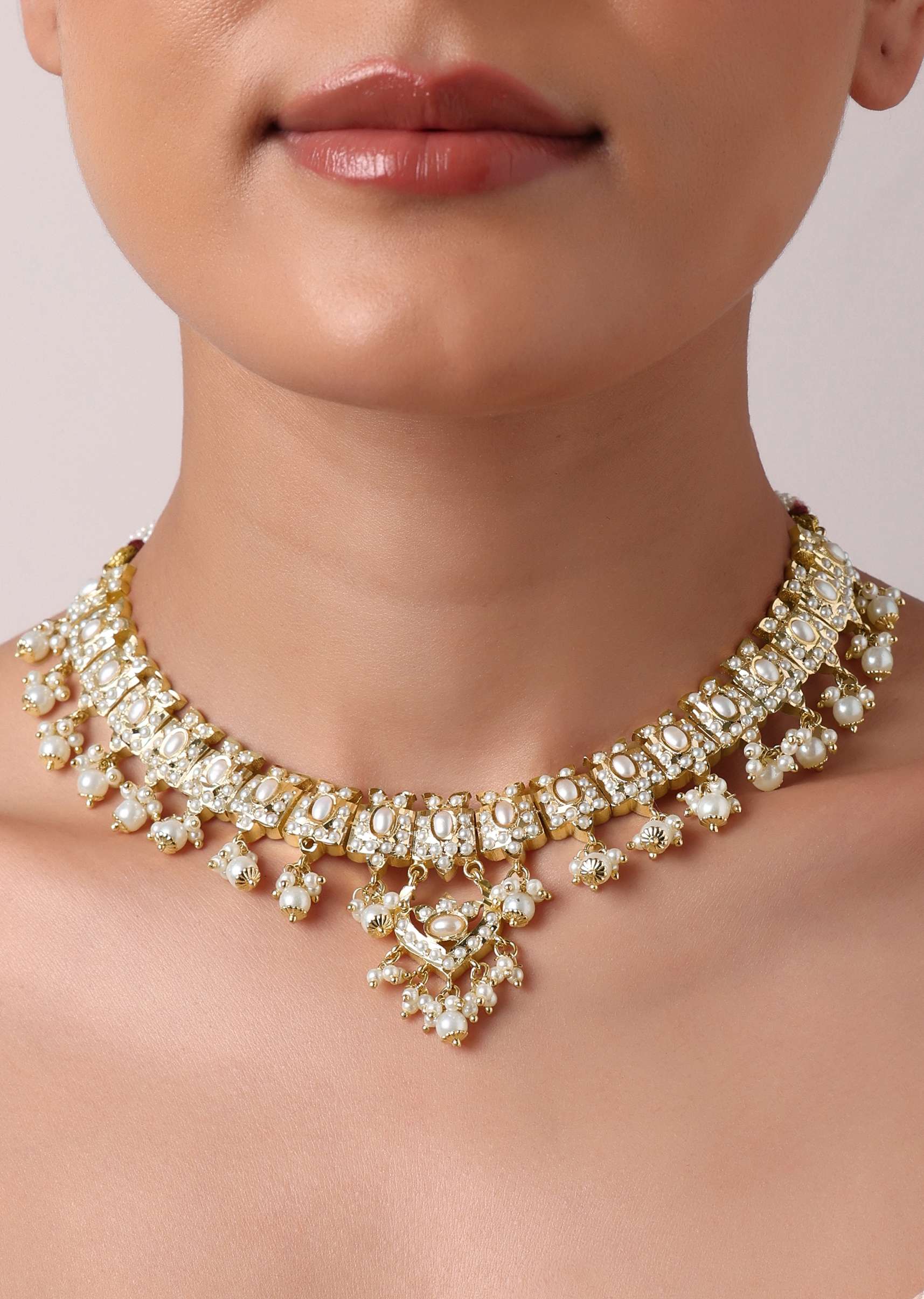 Elevate your charm and personality with our kundan choker and dangler set in mix metal. The intricate kundan craftsmanship blended with delicate white bead drops displays a stunning design. Paired with tiered danglers, this beautiful duo will act as the perfect wedding backdrop. Avoid contact with water, chemicals, harsh liquids, perfumes, etc.Do not wear this piece of jewelry while showering, gymming, swimming, etc.Please keep the product away from moisture and humidity when not in use. Awarded as the Most Trusted Brand, we're delivering styles you love, just as promised.