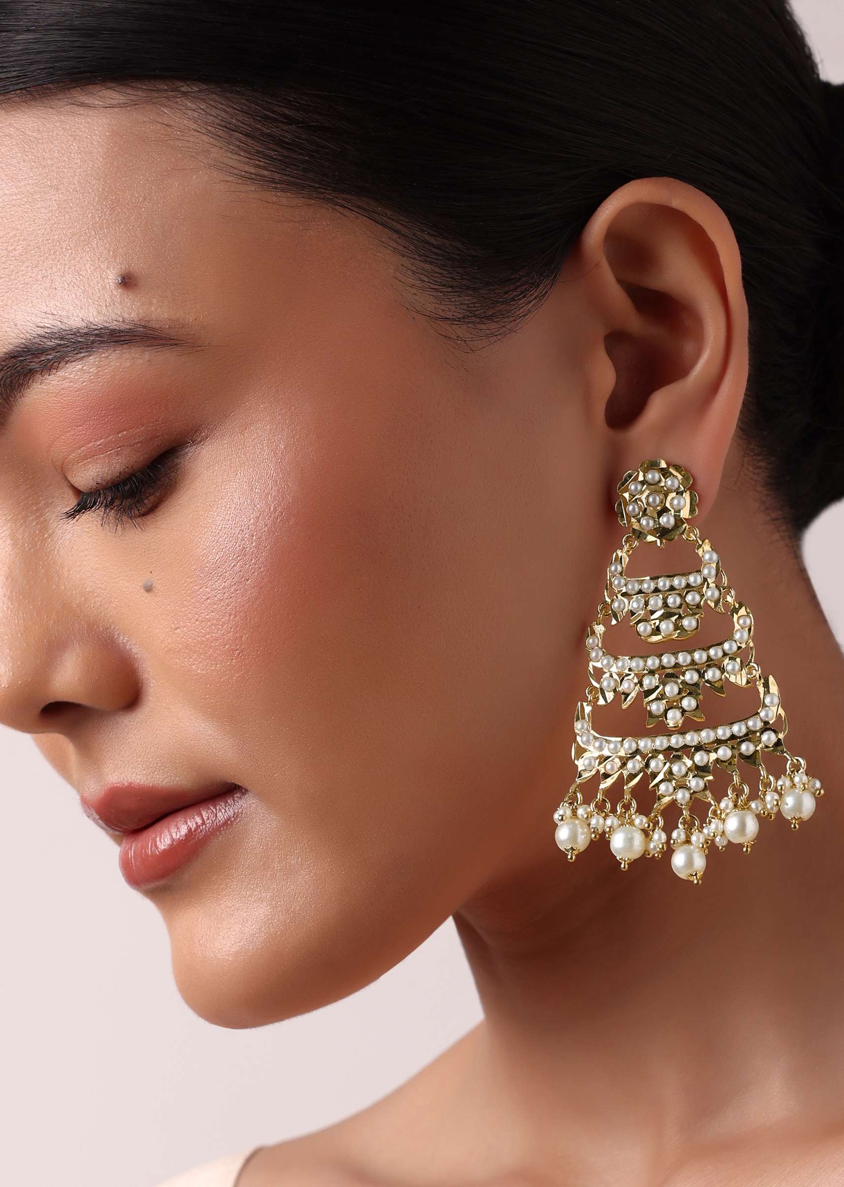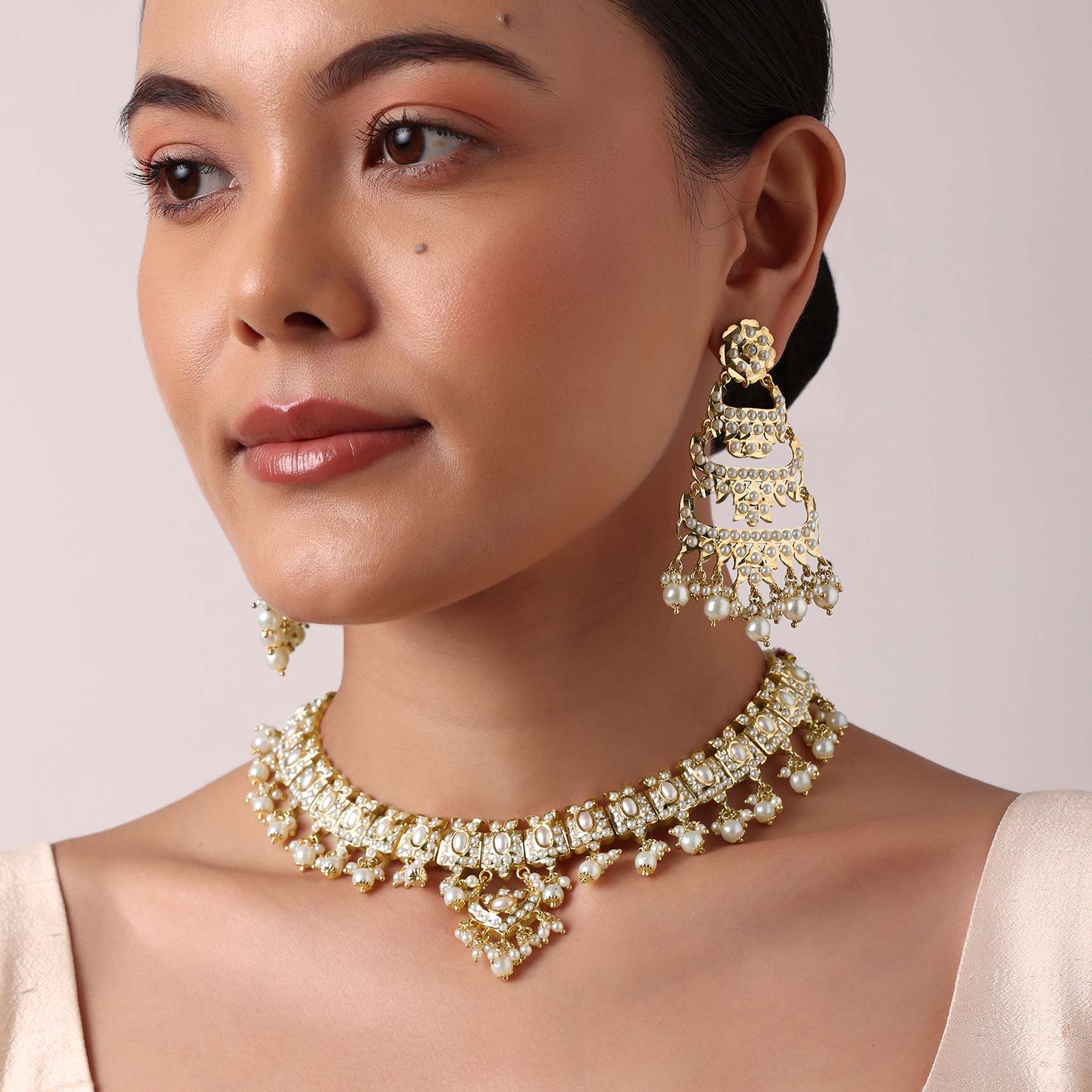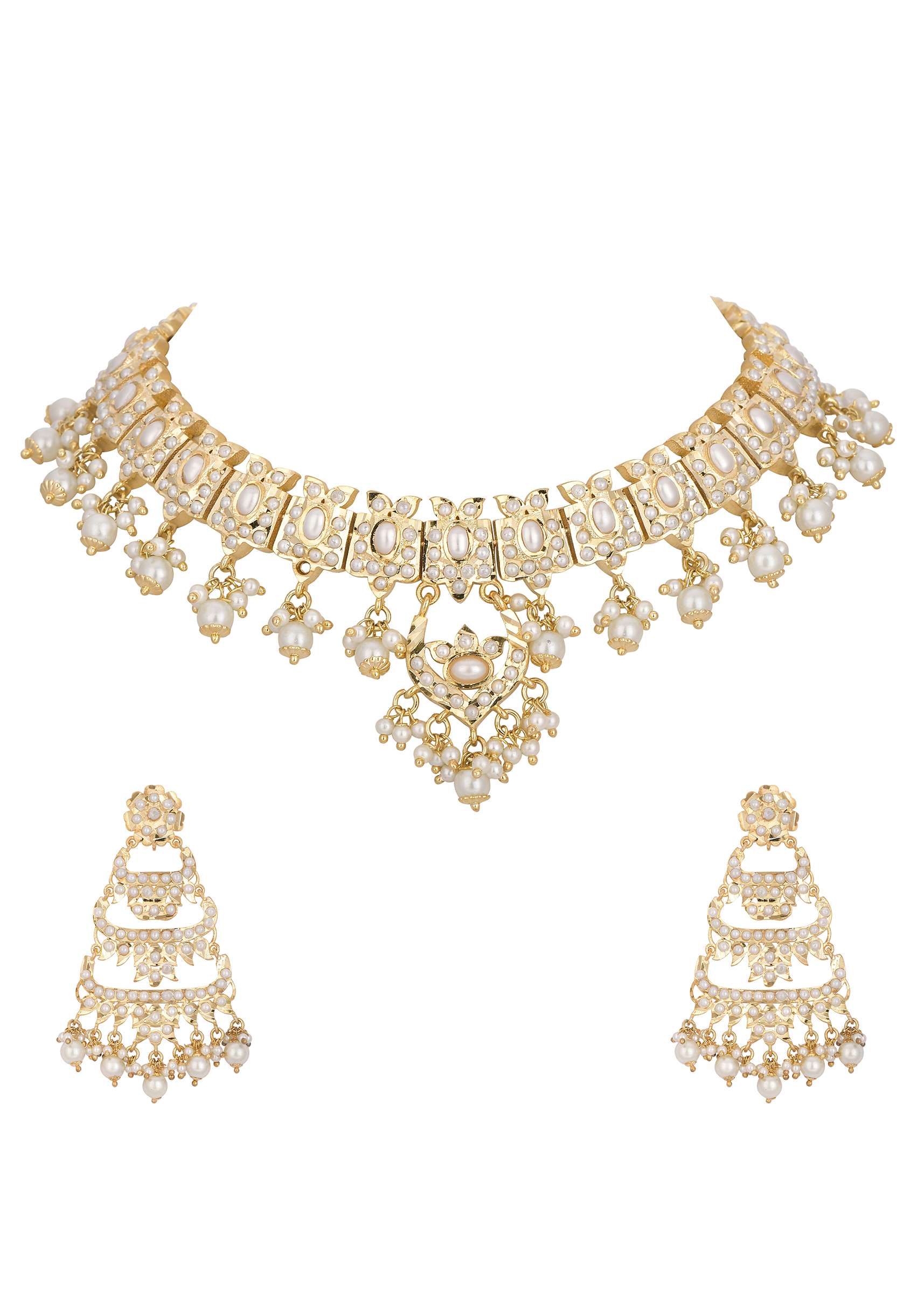 Elevate your charm and personality with our kundan choker and dangler set in mix metal. The intricate kundan craftsmanship blended with delicate white bead drops displays a stunning design. Paired with tiered danglers, this beautiful duo will act as the perfect wedding backdrop. Avoid contact with water, chemicals, harsh liquids, perfumes, etc.Do not wear this piece of jewelry while showering, gymming, swimming, etc.Please keep the product away from moisture and humidity when not in use. Awarded as the Most Trusted Brand, we're delivering styles you love, just as promised.