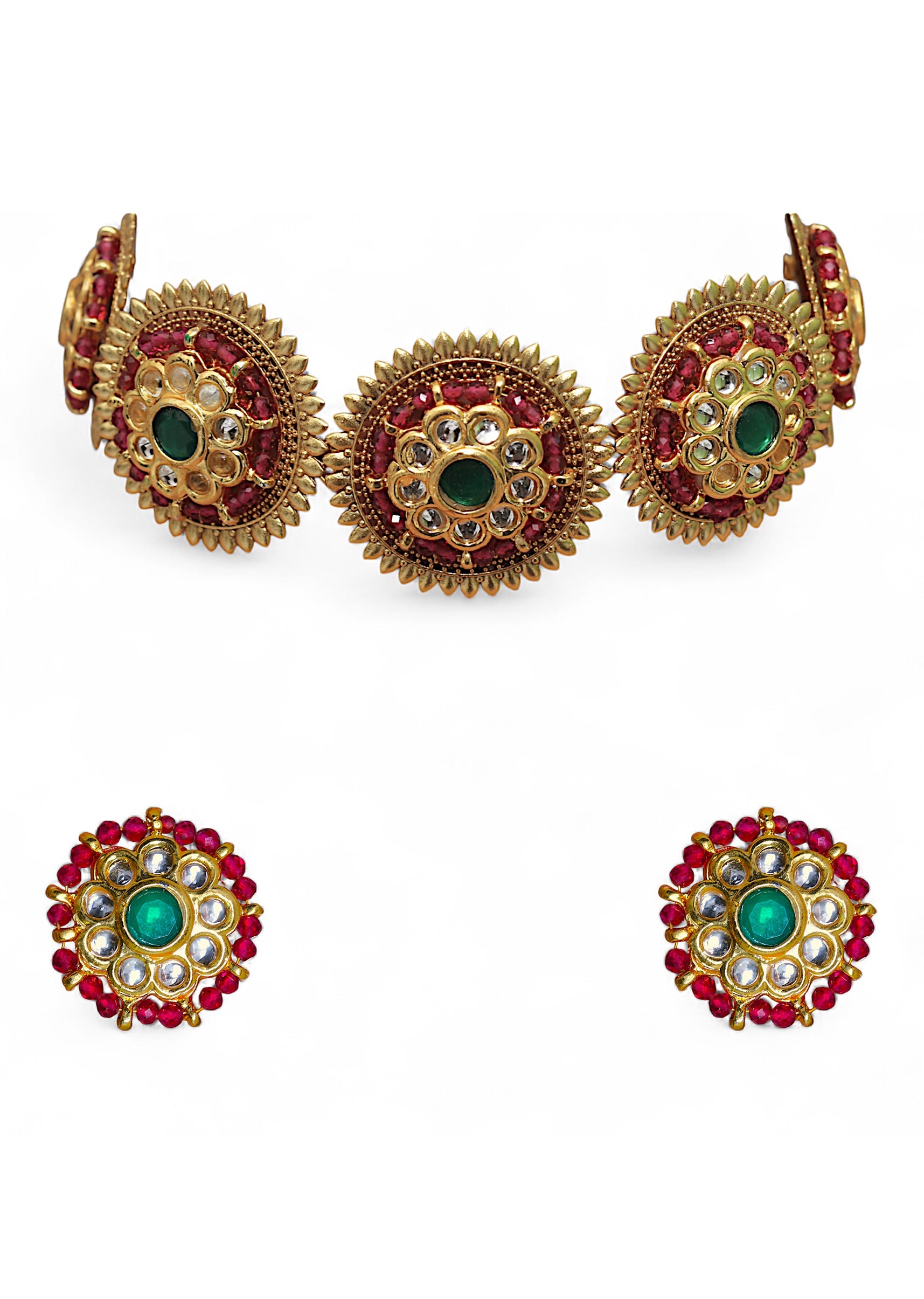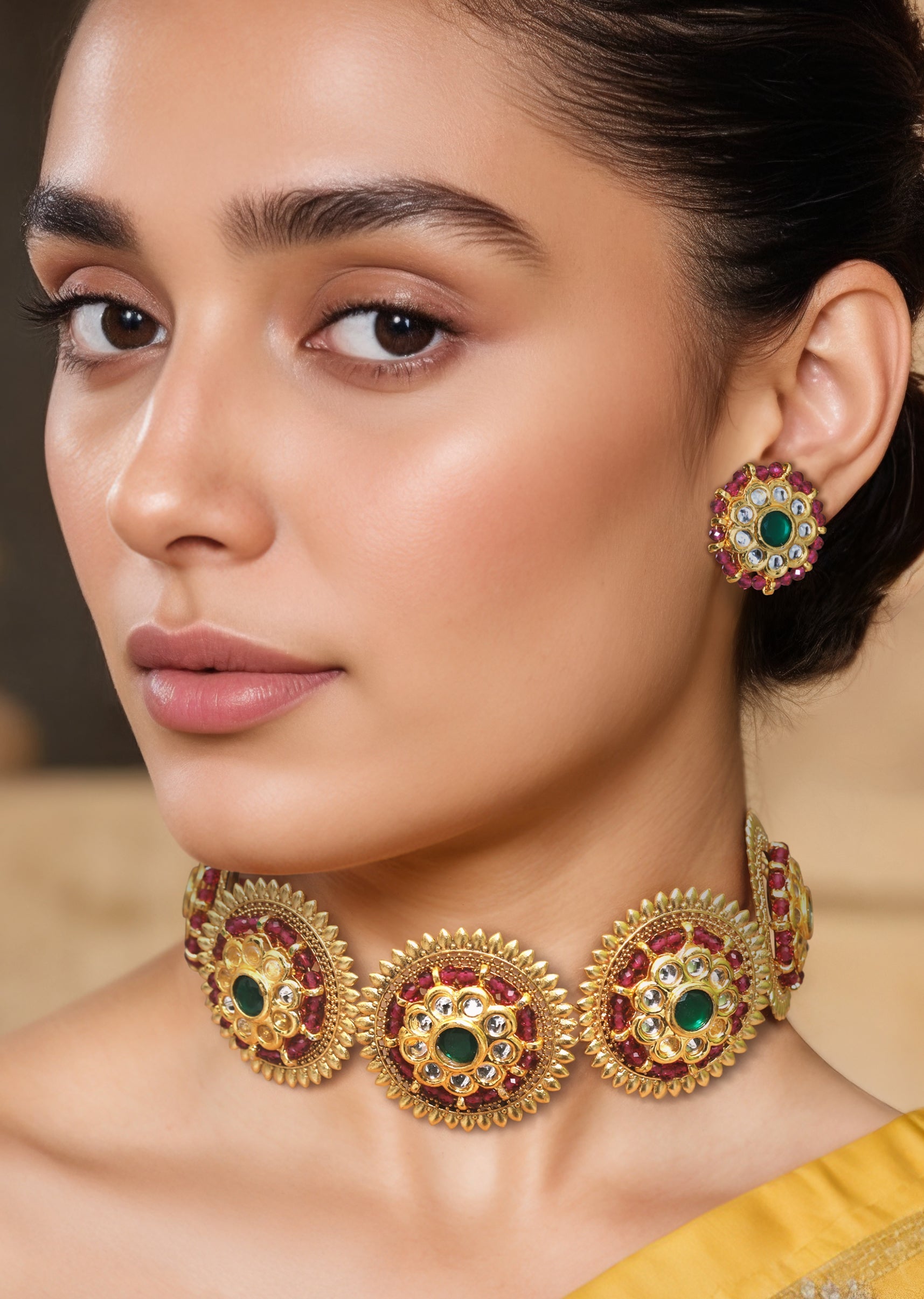 A multi kundan-encrusted floral pendant necklace set featuring radiant kundan stones and intricate floral motifs, exuding regal sophistication and timeless charm. Perfect for adding an opulent and graceful touch to... More Product Details