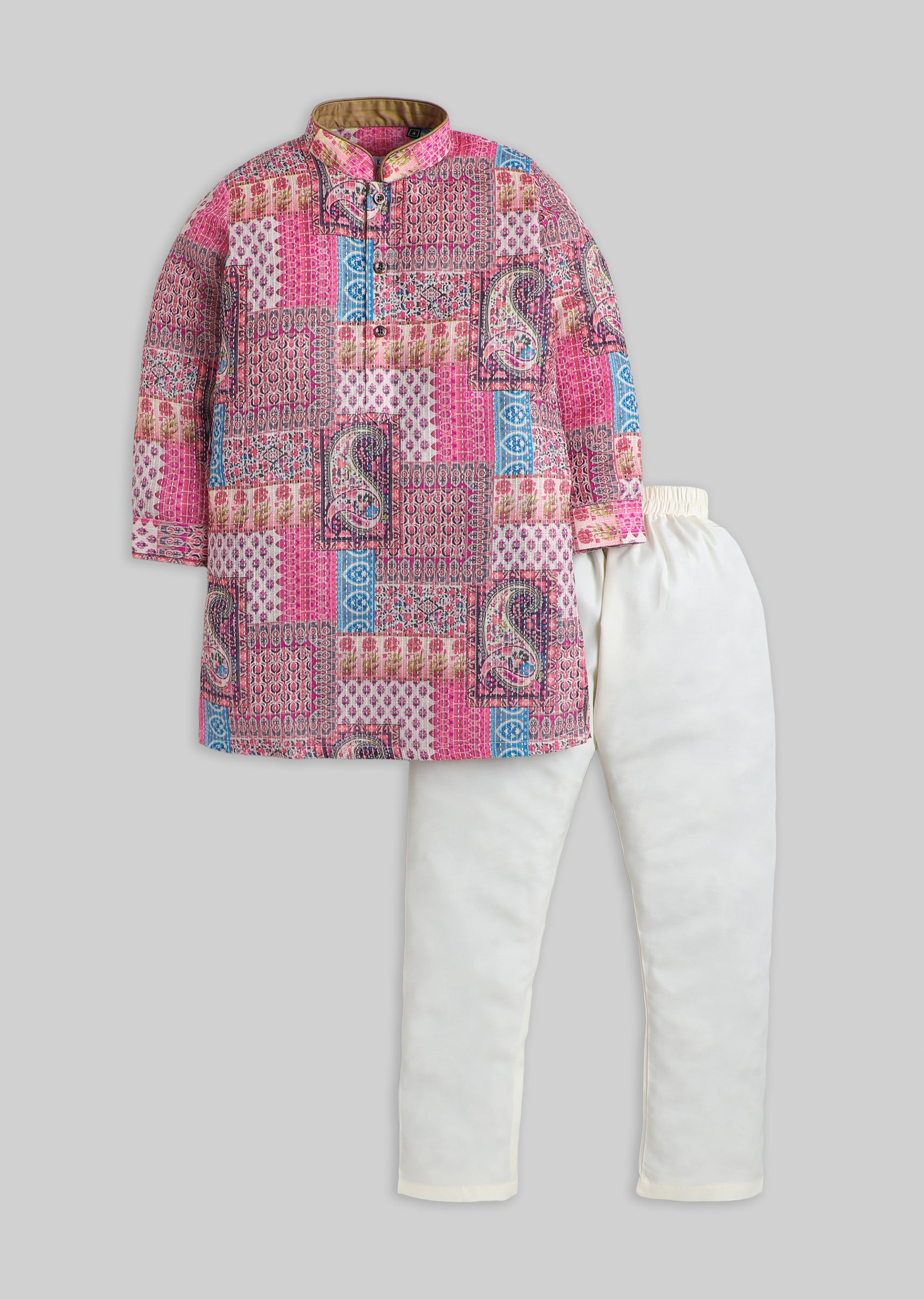 A playful cotton kurta set with a mix of paisley and geometric prints, styled with a mandarin collar and button placket. Comes with matching pants—made for all-day festive comfort. Awarded... More Product Details