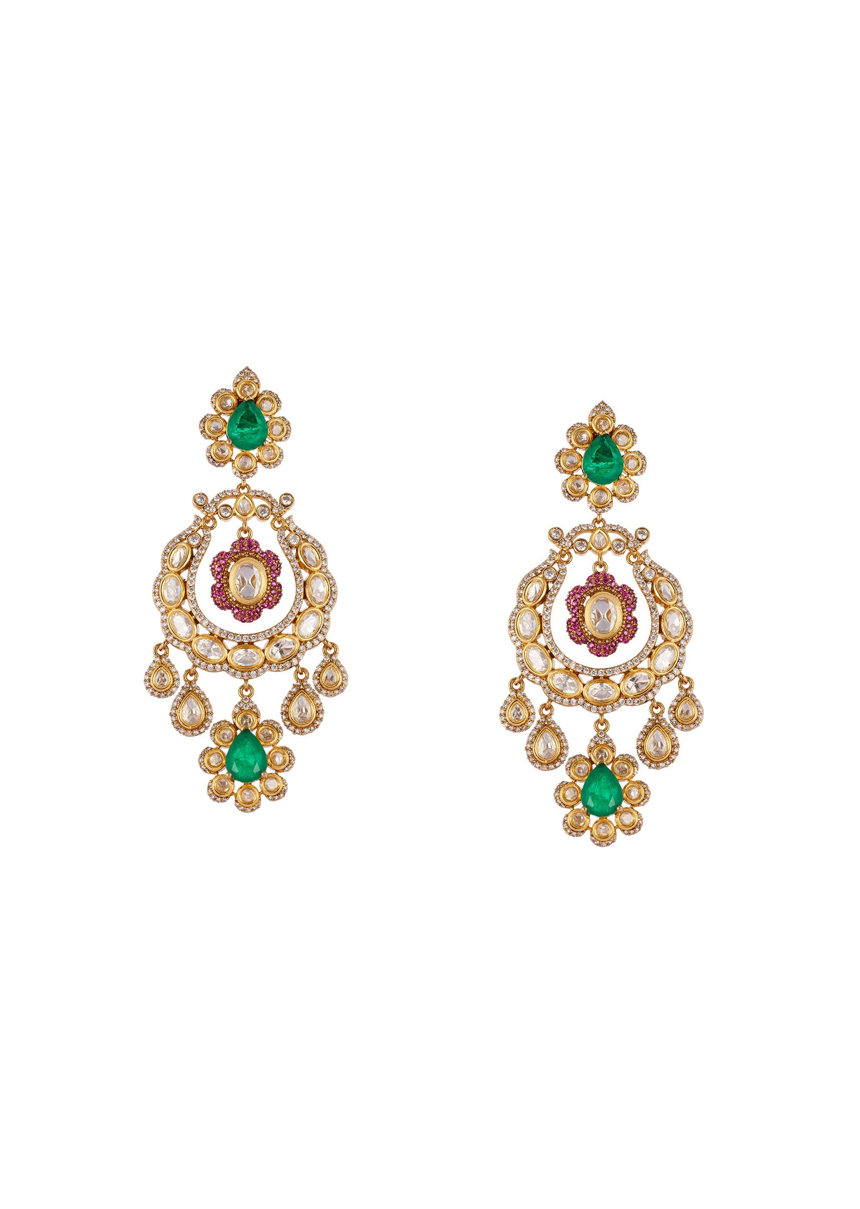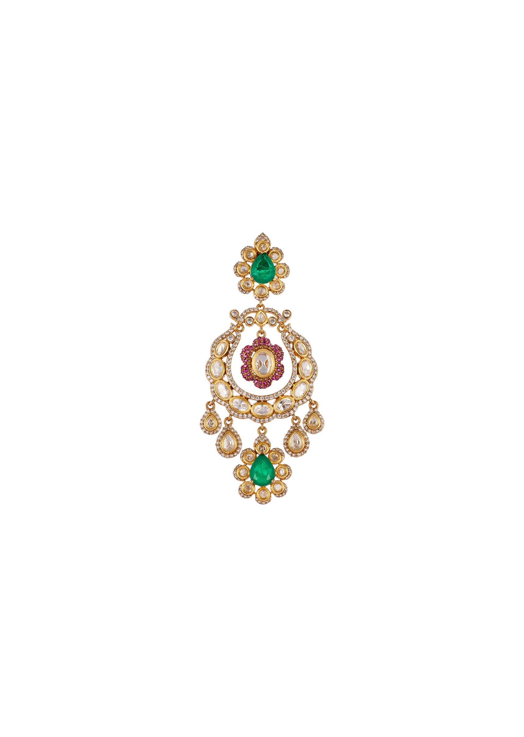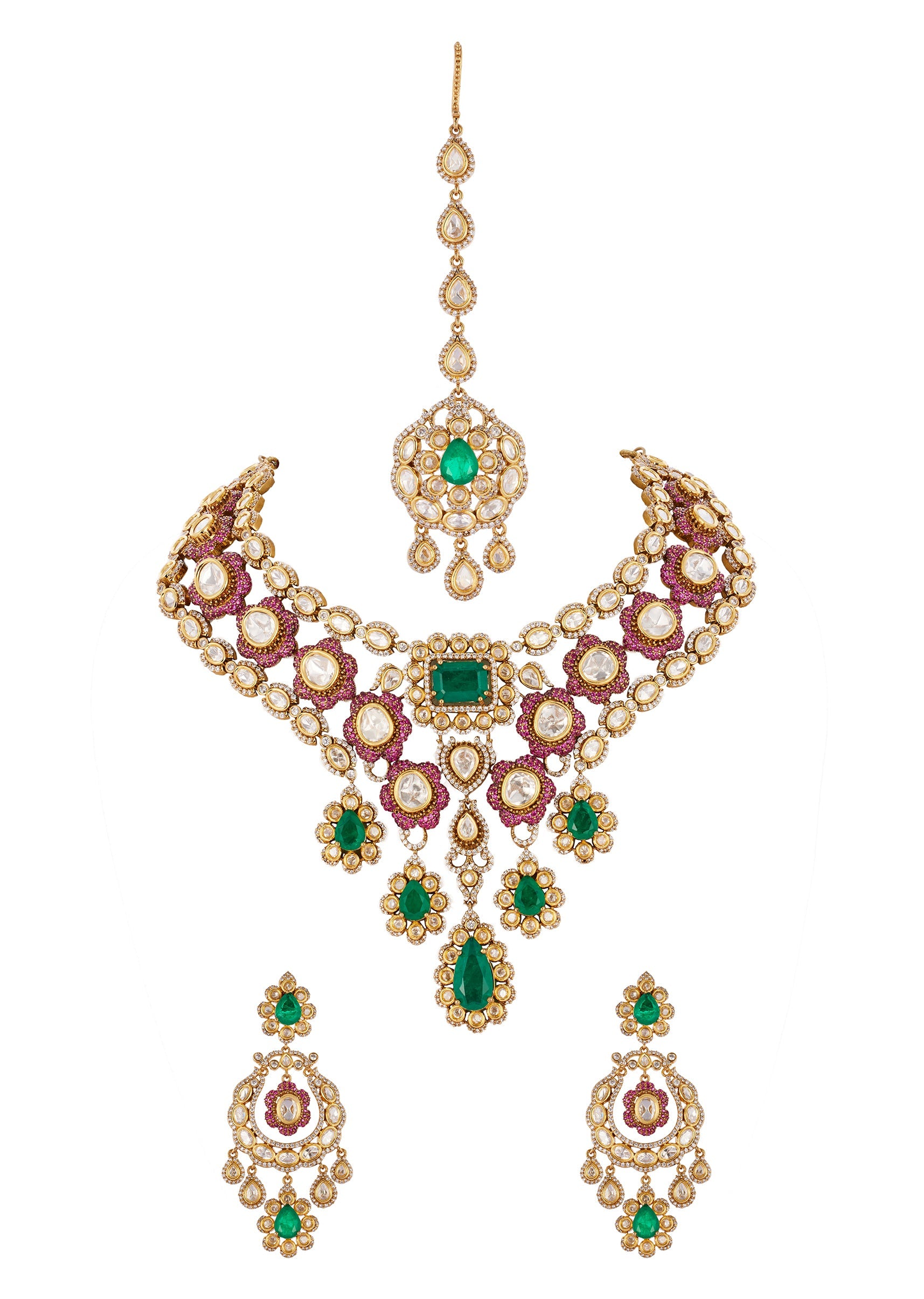This statement necklace set features the use of Polki uncut diamonds set in traditional Kundan and Jadau craftsmanship with semi precious stones in rich red tones. Handcrafted Indian jewelry that... More Product Details