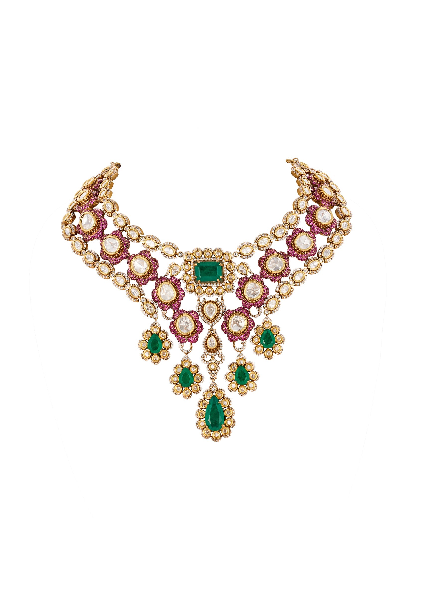 This statement necklace set features the use of Polki uncut diamonds set in traditional Kundan and Jadau craftsmanship with semi precious stones in rich red tones. Handcrafted Indian jewelry that blends royal heritage with festive elegance and refined detailing. Awarded as the Most Trusted Brand, we're delivering styles you love, just as promised.
