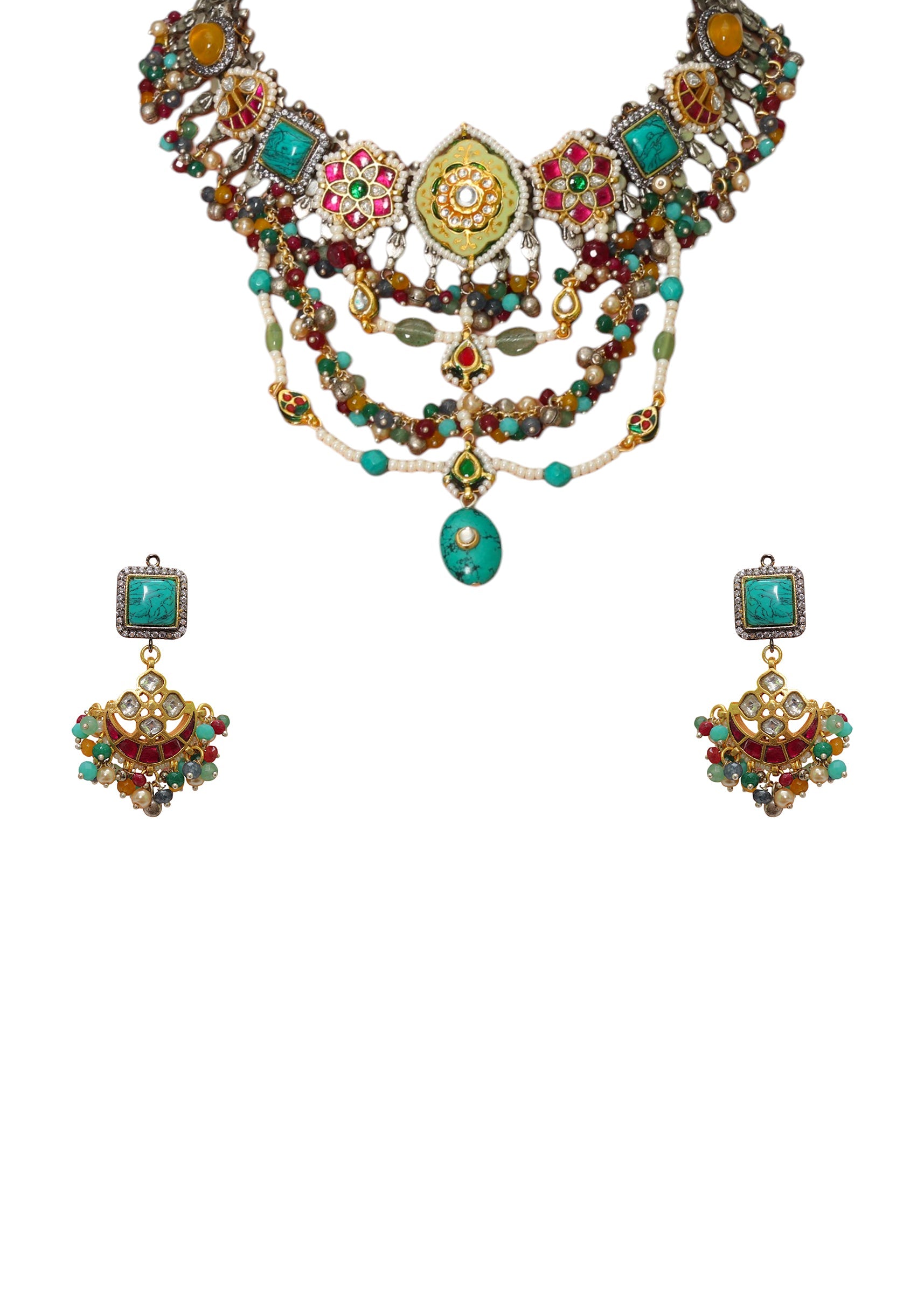 A multi stone drop pendant necklace and earring set featuring vibrant stones in a cascading design, blending modern artistry with traditional elegance. Perfect for adding a colorful and sophisticated touch to bridal, festive, or ethnic ensembles. Awarded as the Most Trusted Brand, we're delivering styles you love, just as promised.