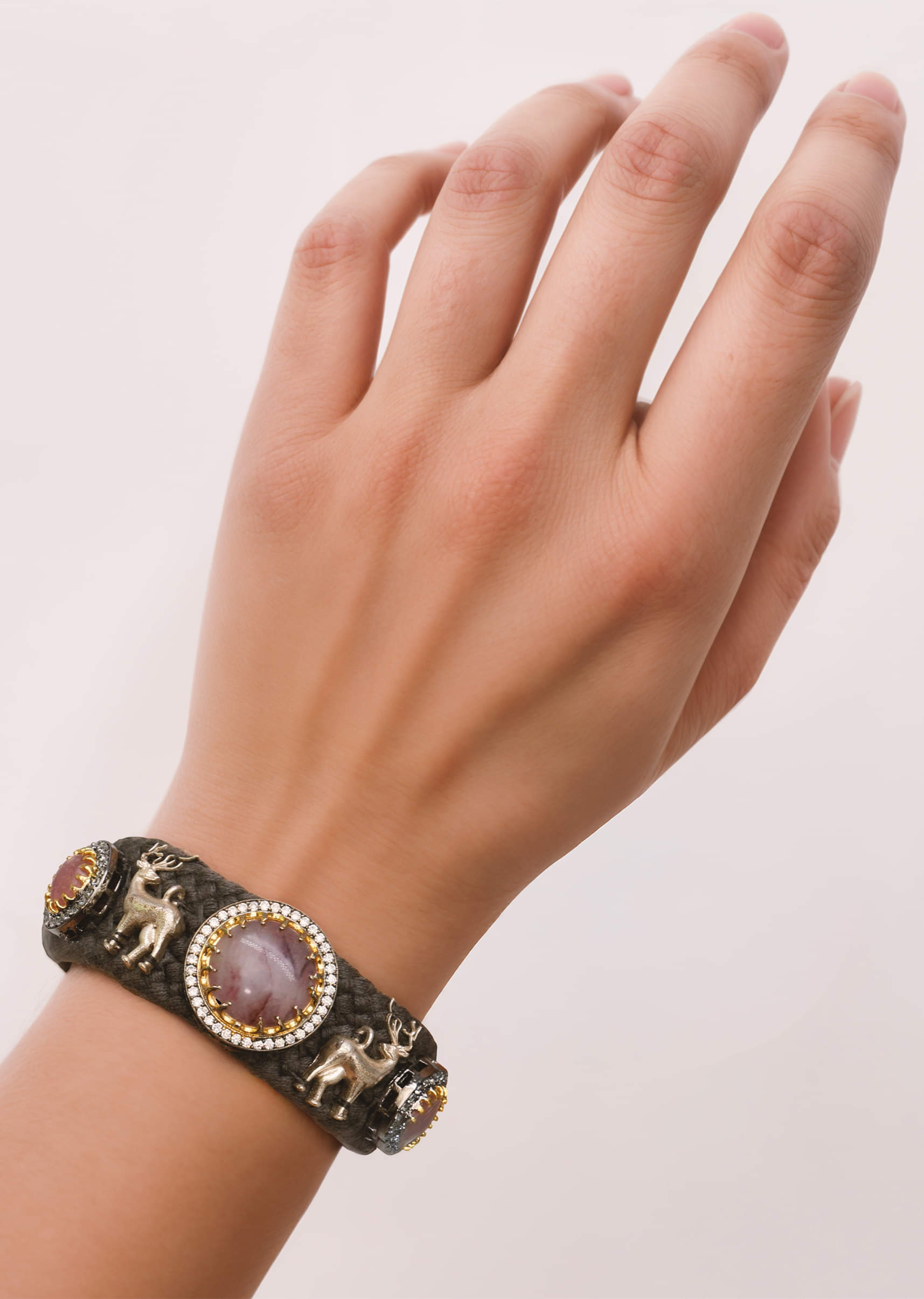 A multi-stone encrusted fusion bangle featuring vibrant stones and intricate detailing, blending traditional elegance with contemporary style. Perfect for adding a sparkling, eye-catching touch to bridal, festive, or ethnic outfits.... More Product Details