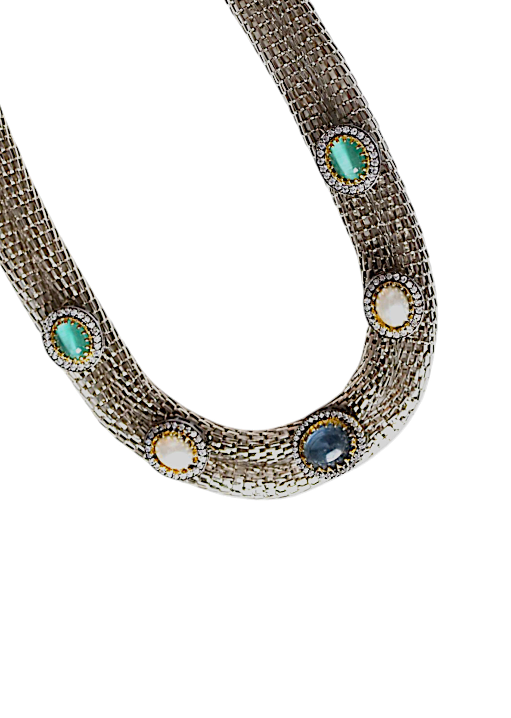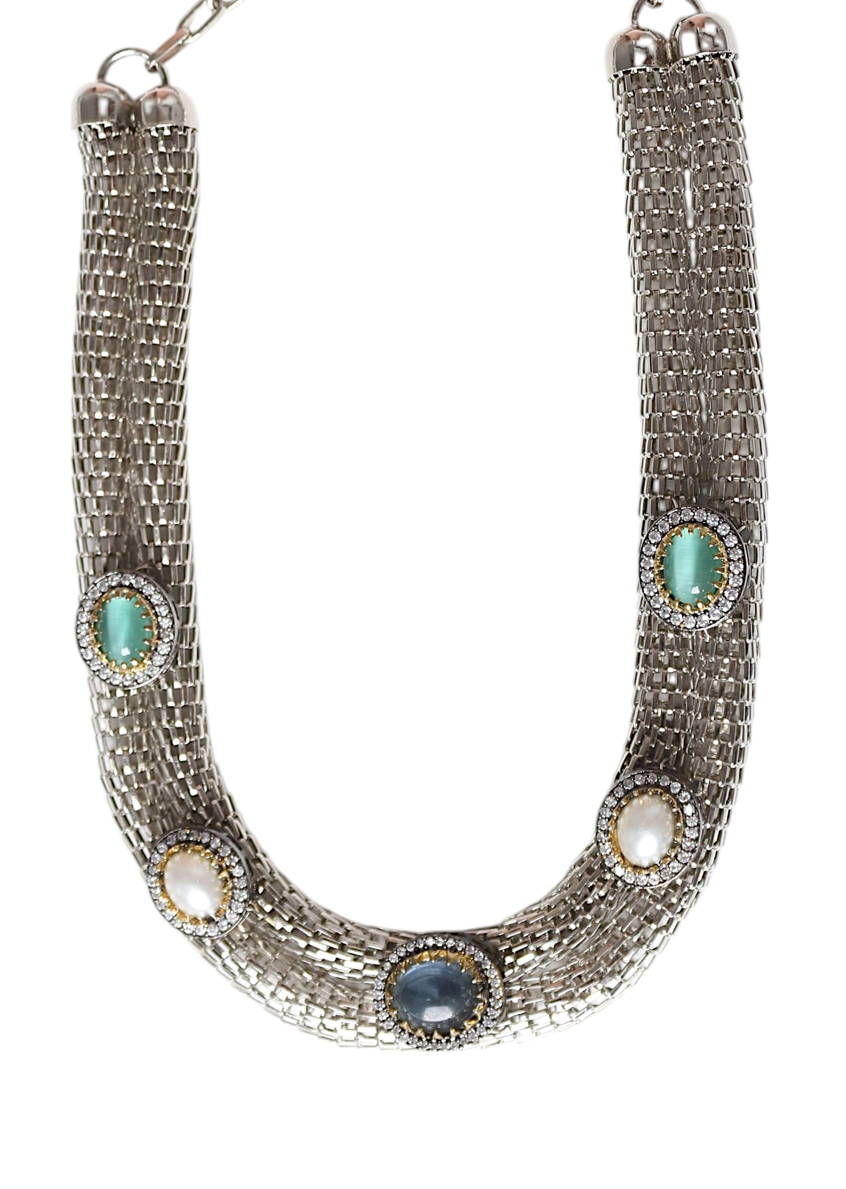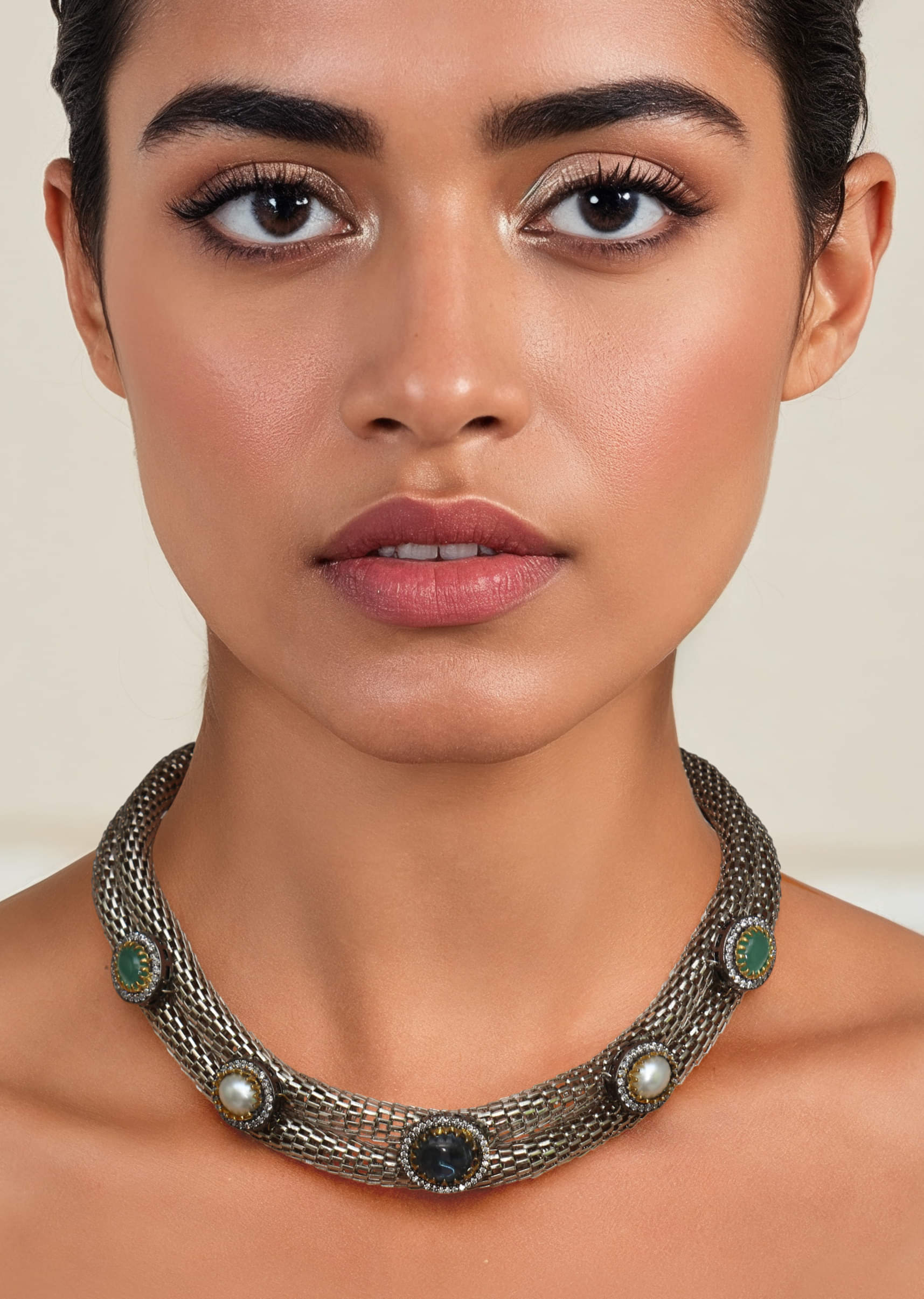 A multi stone-encrusted necklace featuring vibrant, finely set stones with intricate craftsmanship, exuding timeless elegance and charm. Perfect for adding a colorful and luxurious touch to bridal, festive, or ethnic... More Product Details