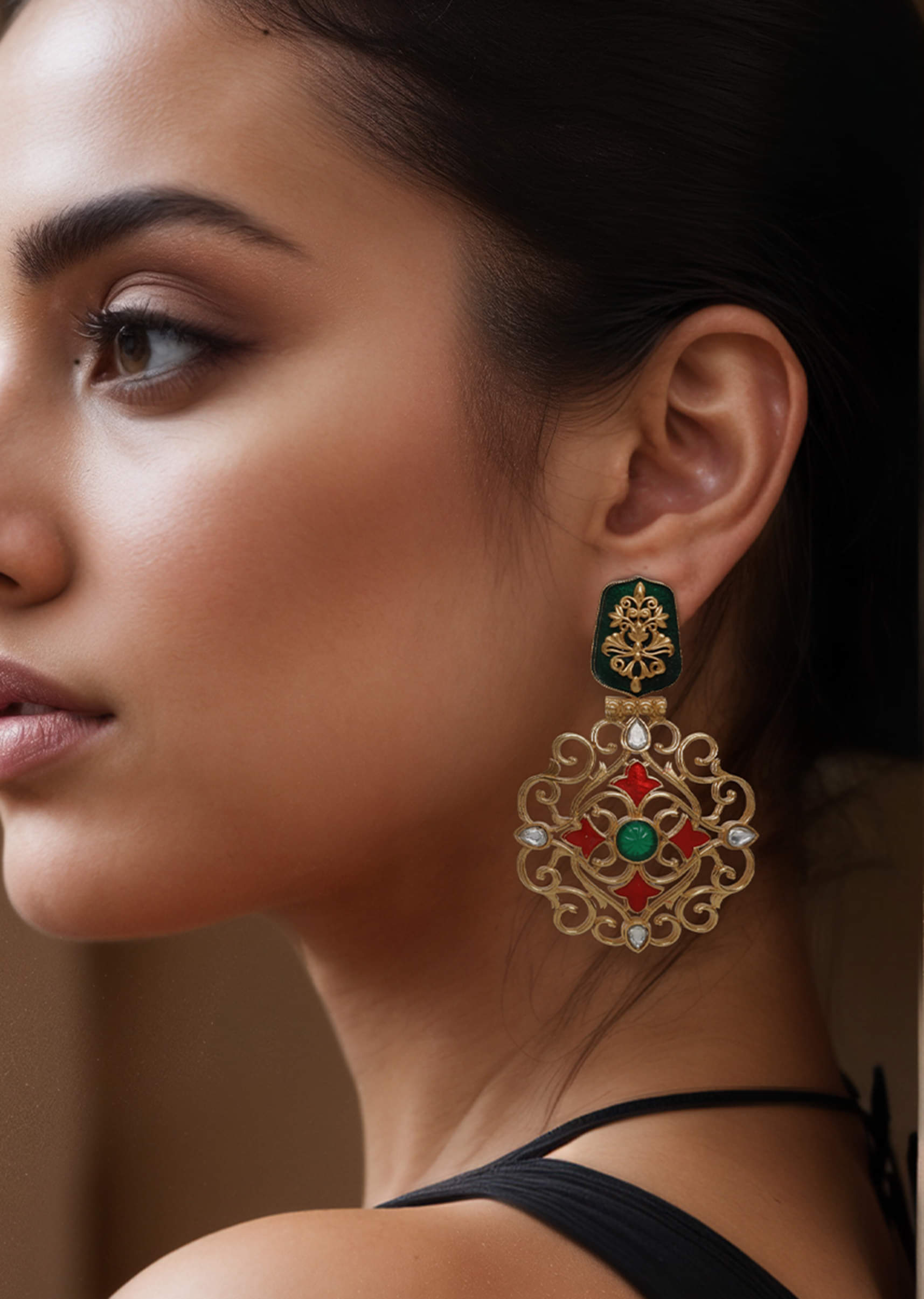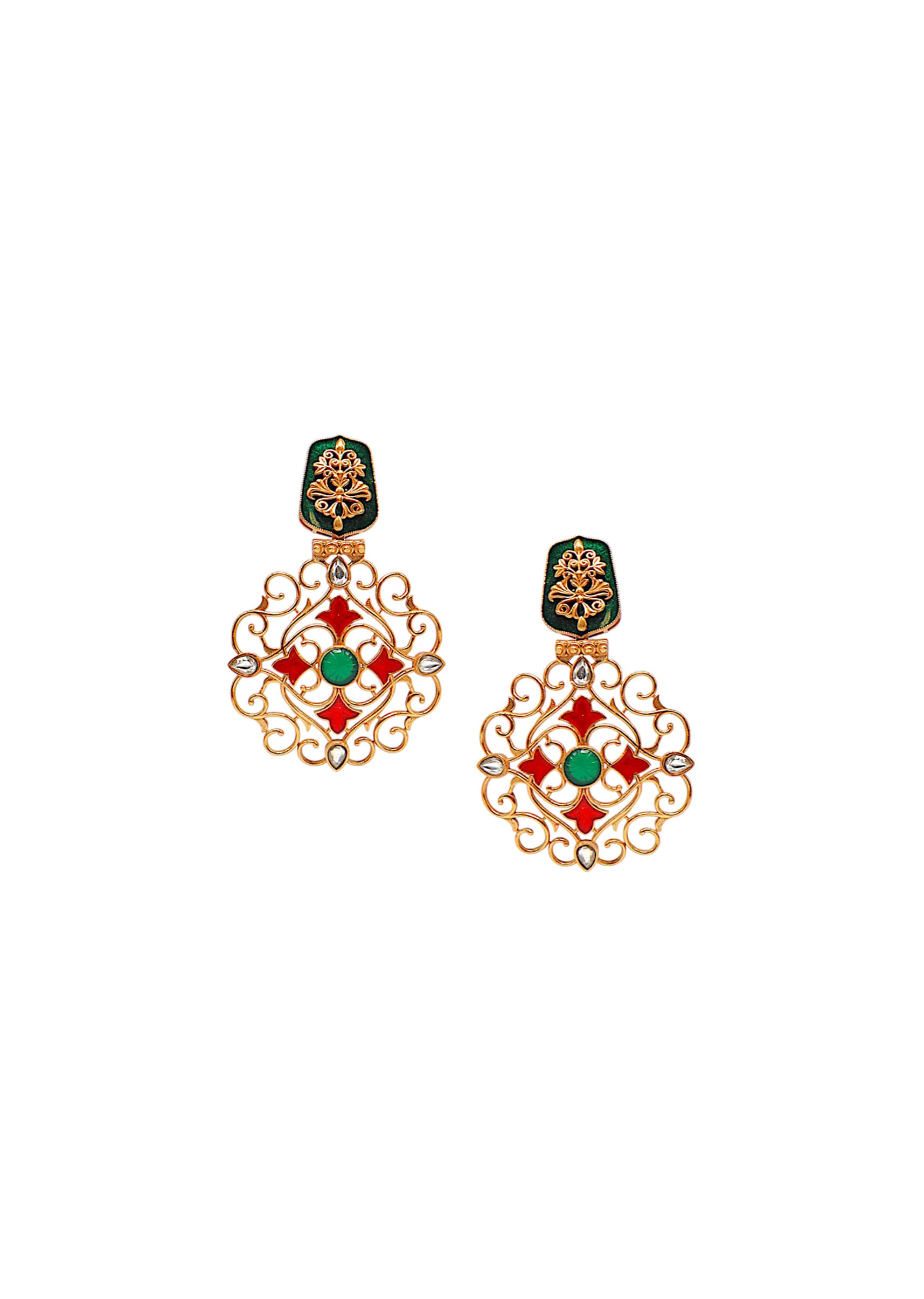 A pair of multi temple cutwork danglers featuring intricate cutwork and detailed temple motifs, blending traditional elegance with contemporary design. Perfect for adding a sophisticated touch to bridal, festive, or... More Product Details