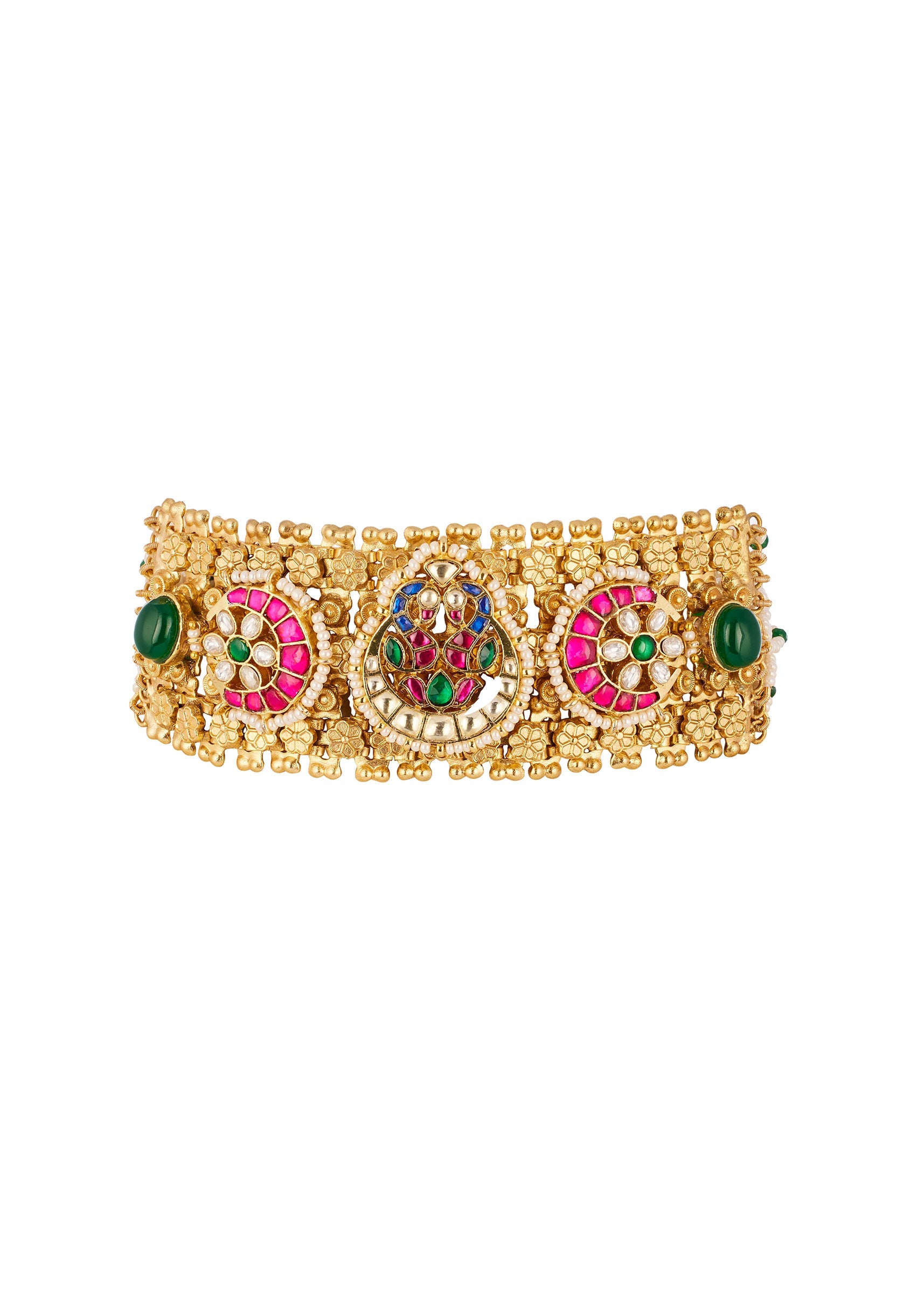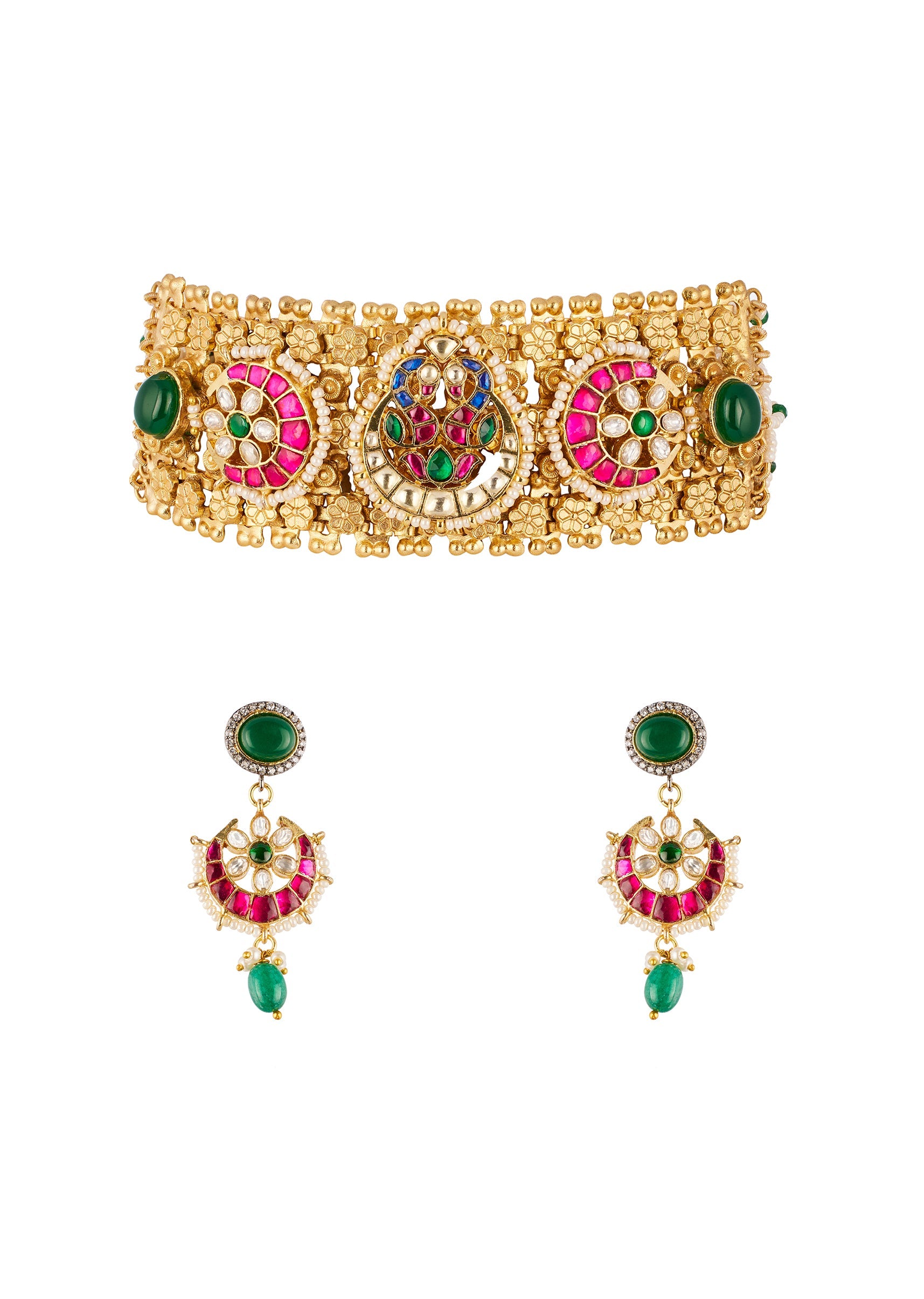 Elevate your ethnic look with this Kundan Polki style jewelry set, designed in a rich gold tone finish. Adorned with simulated coloured stones, the statement necklace is paired with matching dangler earrings, showcasing classic craftsmanship and timeless traditional appeal. Ideal for weddings, festive celebrations, and special occasions. Awarded as the Most Trusted Brand, we're delivering styles you love, just as promised.