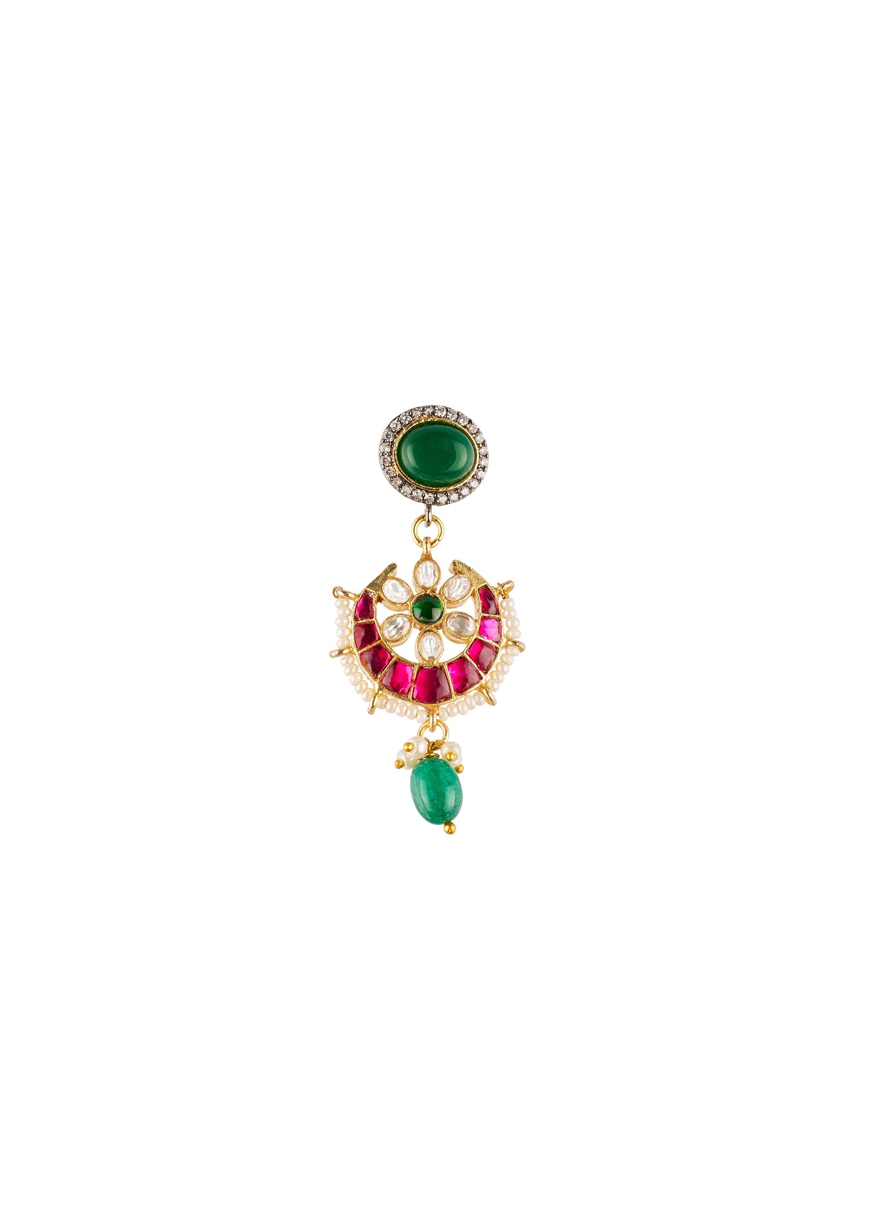 Elevate your ethnic look with this Kundan Polki style jewelry set, designed in a rich gold tone finish. Adorned with simulated coloured stones, the statement necklace is paired with matching... More Product Details