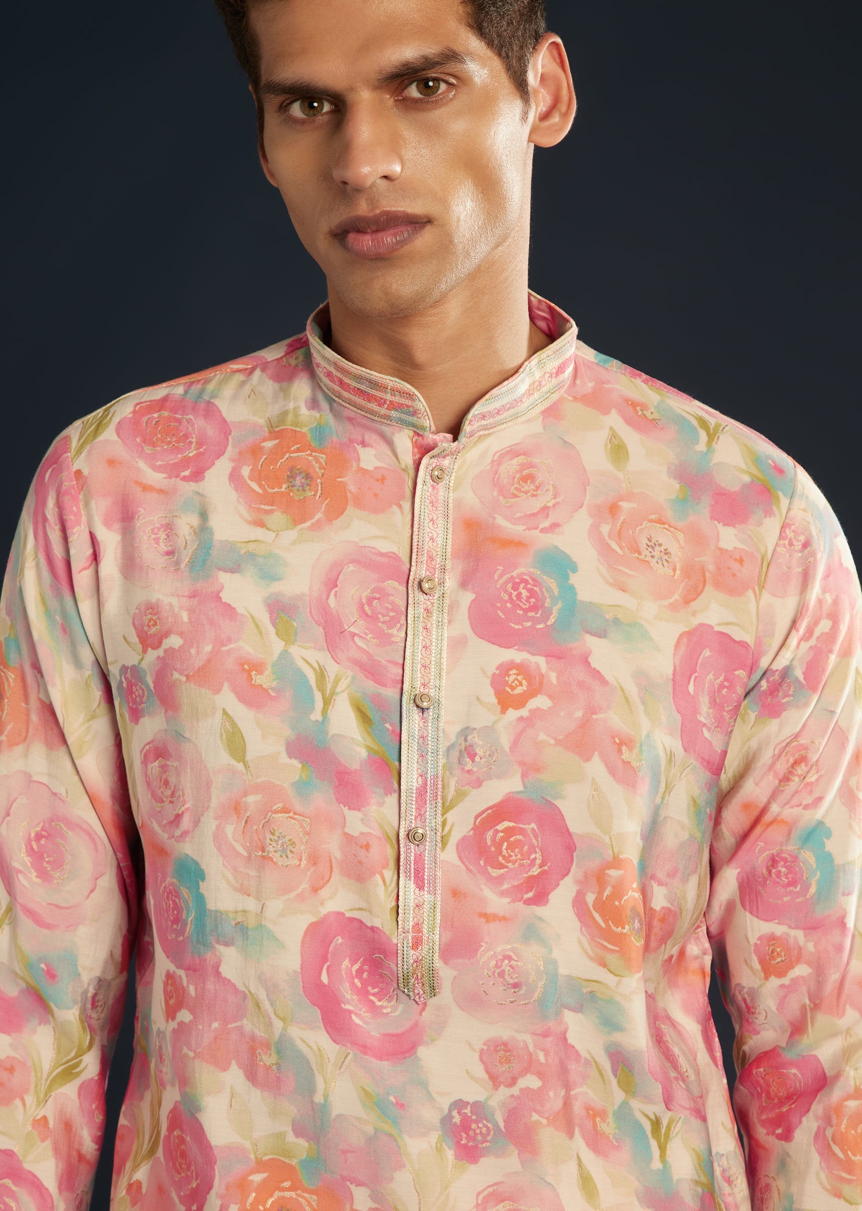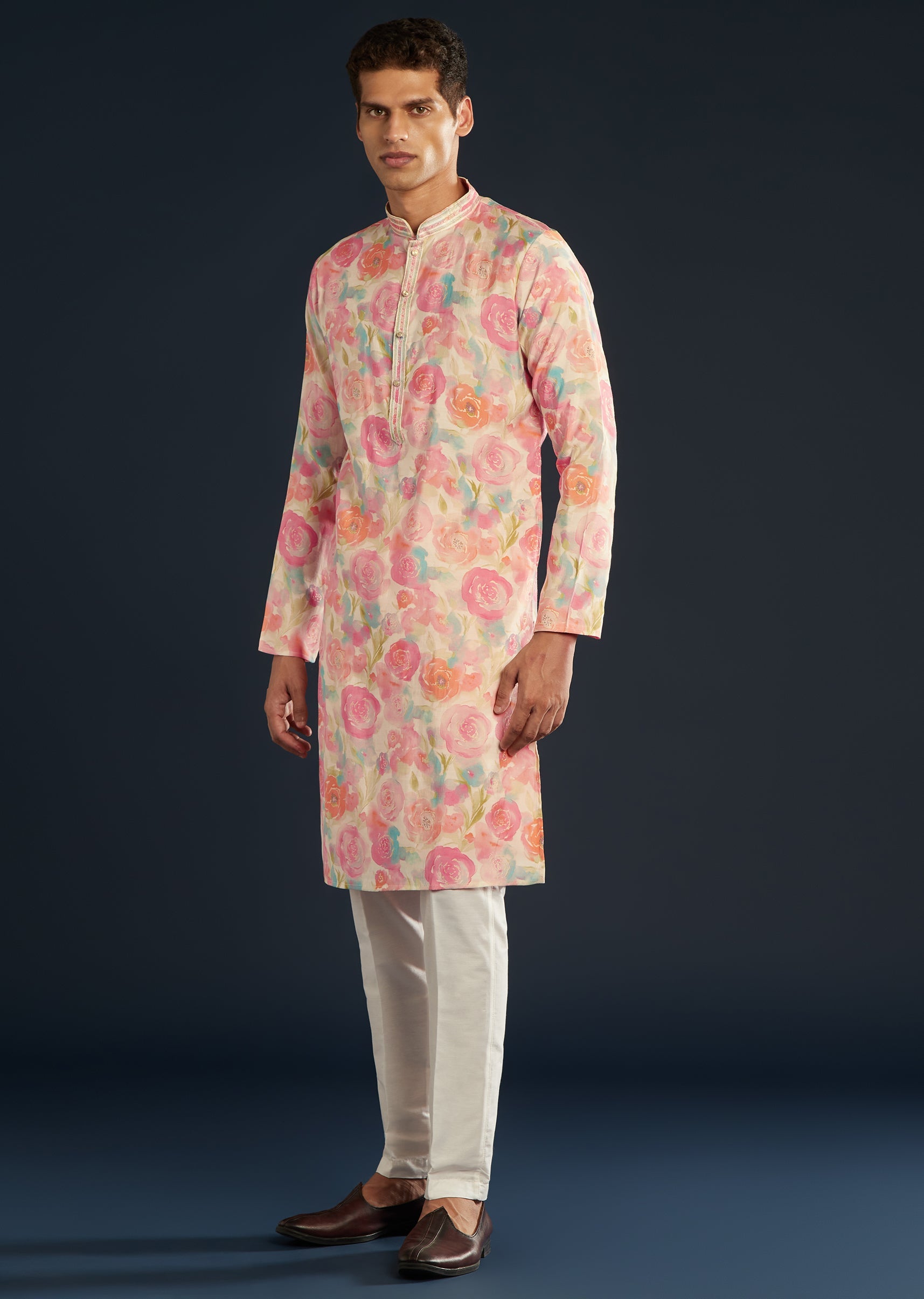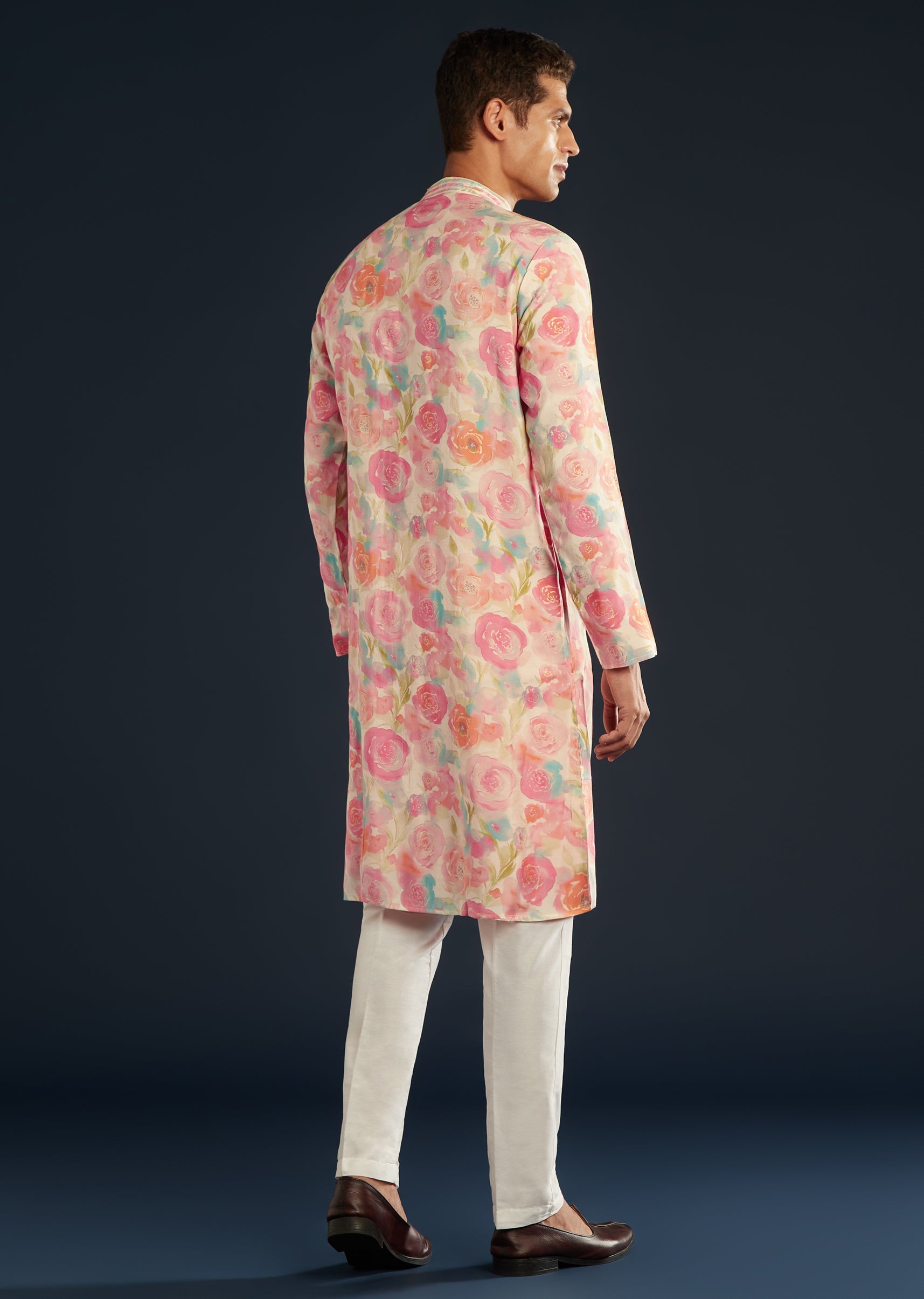 Embrace understated elegance in this multi-hue men's silk kurta set - perfect for occasions that call for quiet sophistication. Rich hues and delicate florals elevate this opulnt ensemble, while the... More Product Details