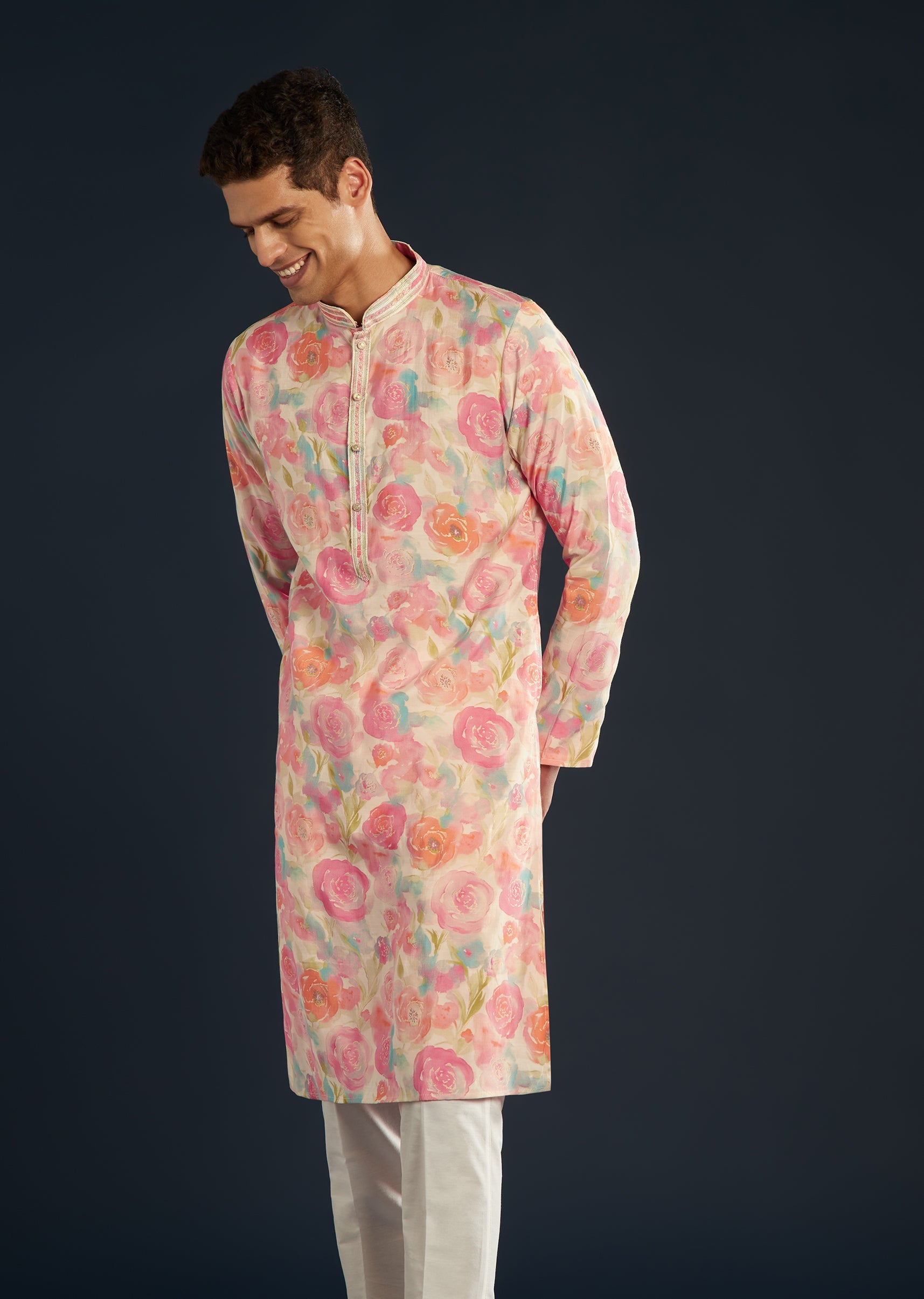 Embrace understated elegance in this multi-hue men's silk kurta set - perfect for occasions that call for quiet sophistication. Rich hues and delicate florals elevate this opulnt ensemble, while the subtle sheen and intricate craftsmanship exude festive polish. Thoughtfully tailored with a mandarin collar and classic pants, it lets you move with ease and confidence from day to night. Awarded as the Most Trusted Brand, we're delivering styles you love, just as promised.